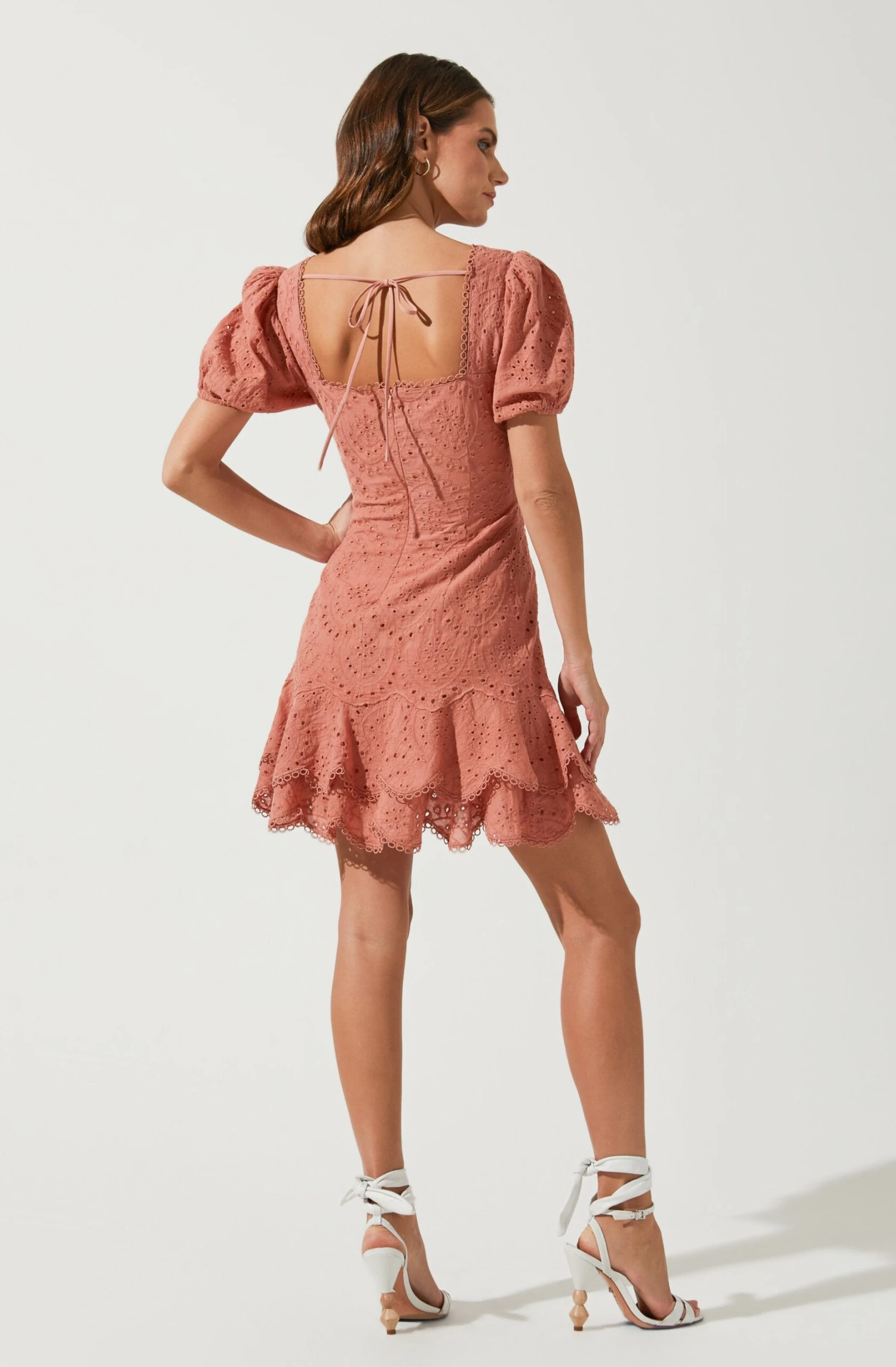 The Alba Dress features a sweetheart neckline and short puff sleeves. Lace design features a sweet-yet-subtle scallop-edge trim throughout. Fitted bodice leads to an abbreviated hemline with a tiered, scalloped hemline. Square-cut back with tying accent.