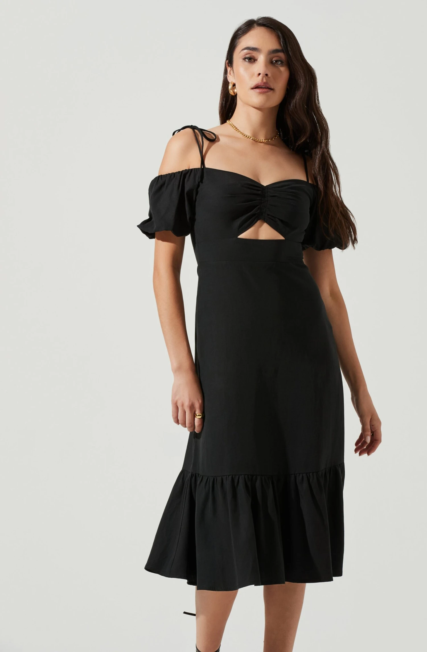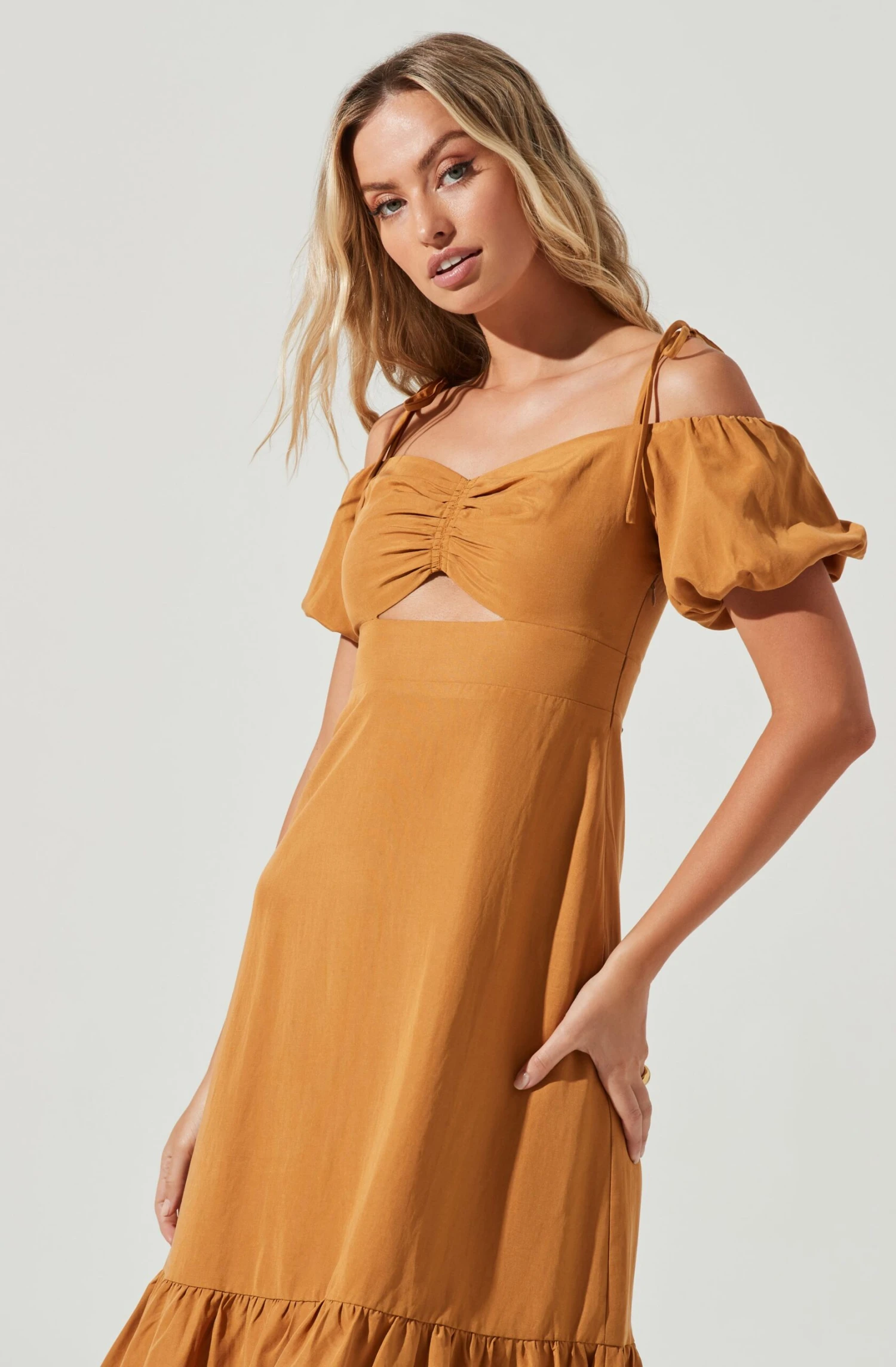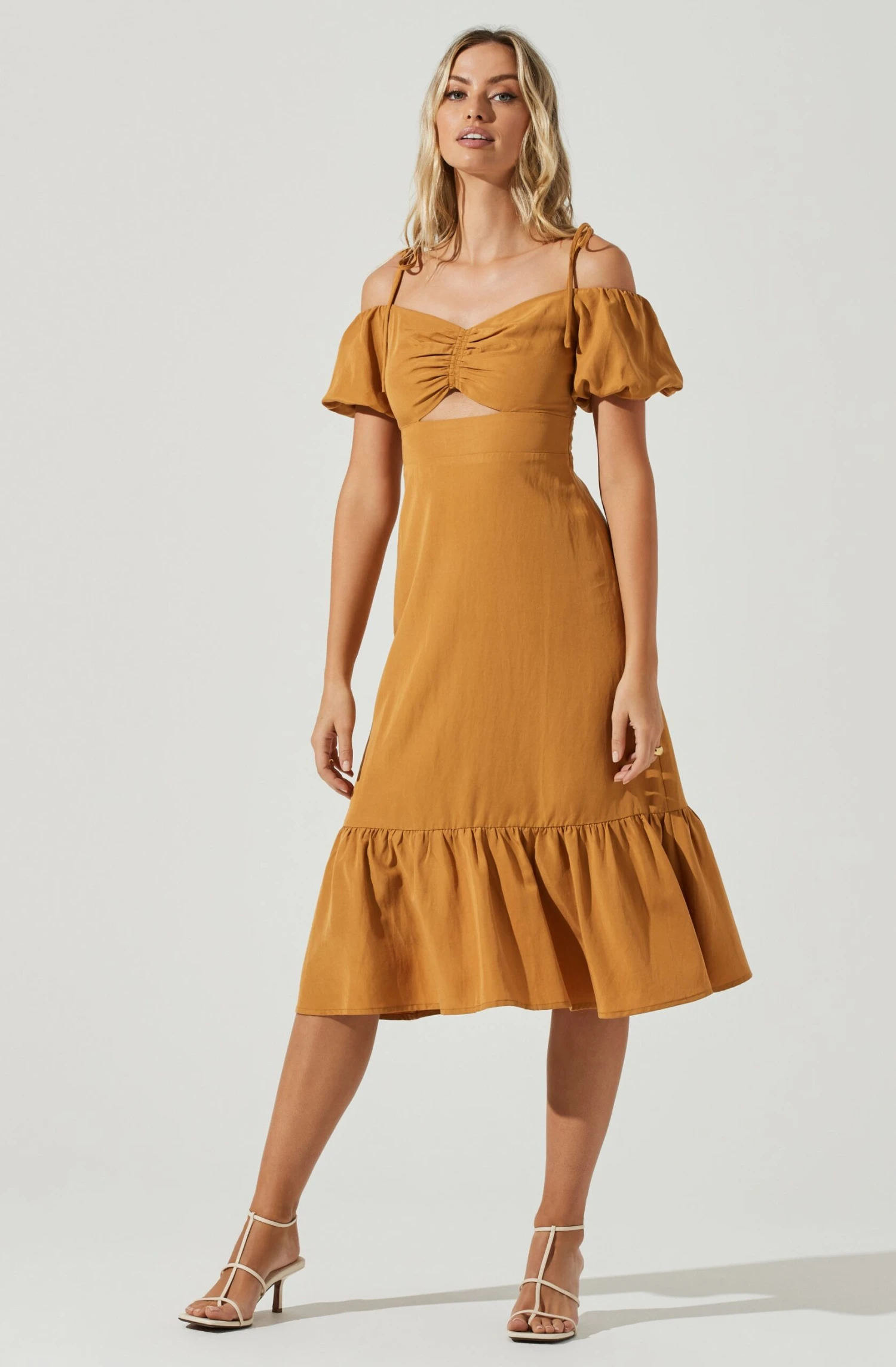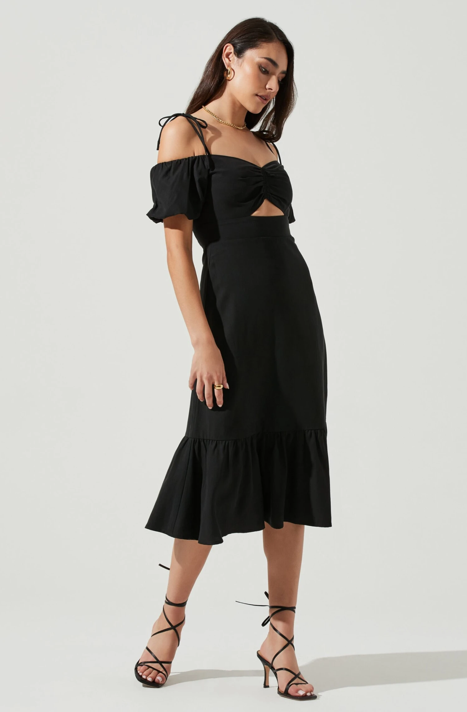 The Aleda Dress features a sweetheart neckline that is supported by a self-tie cold shoulder design. Front cutout accent. Midi-length skirt with a ruffle trim detail. Smocked back.