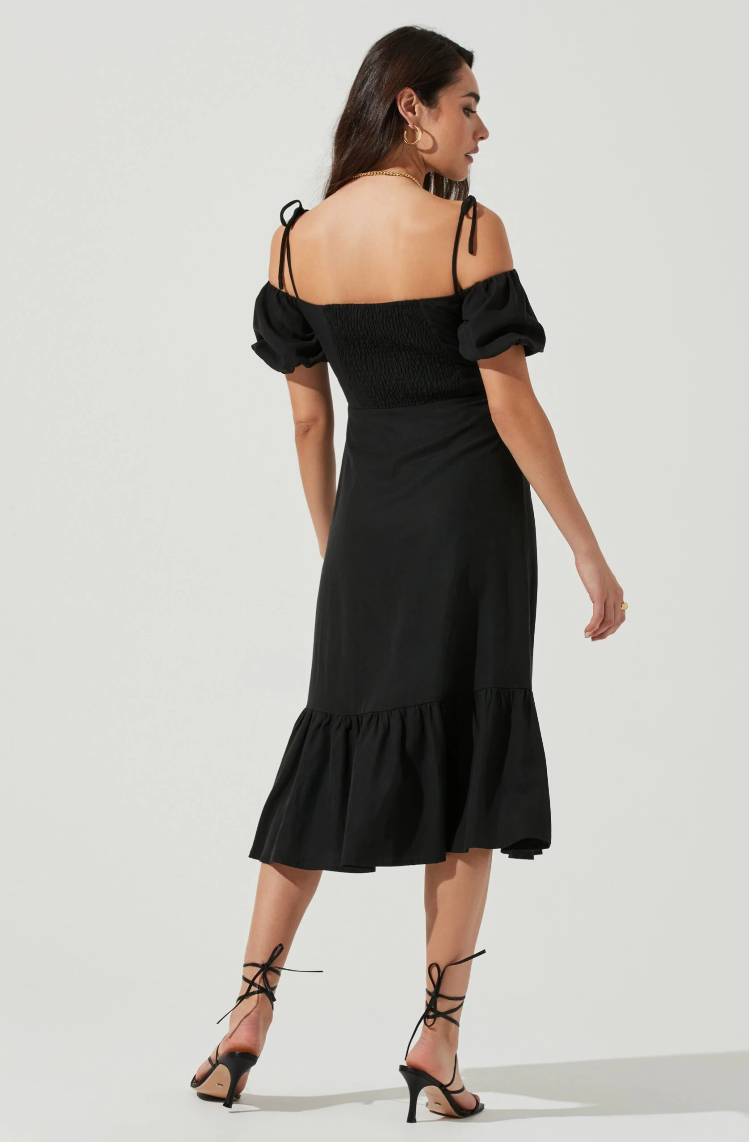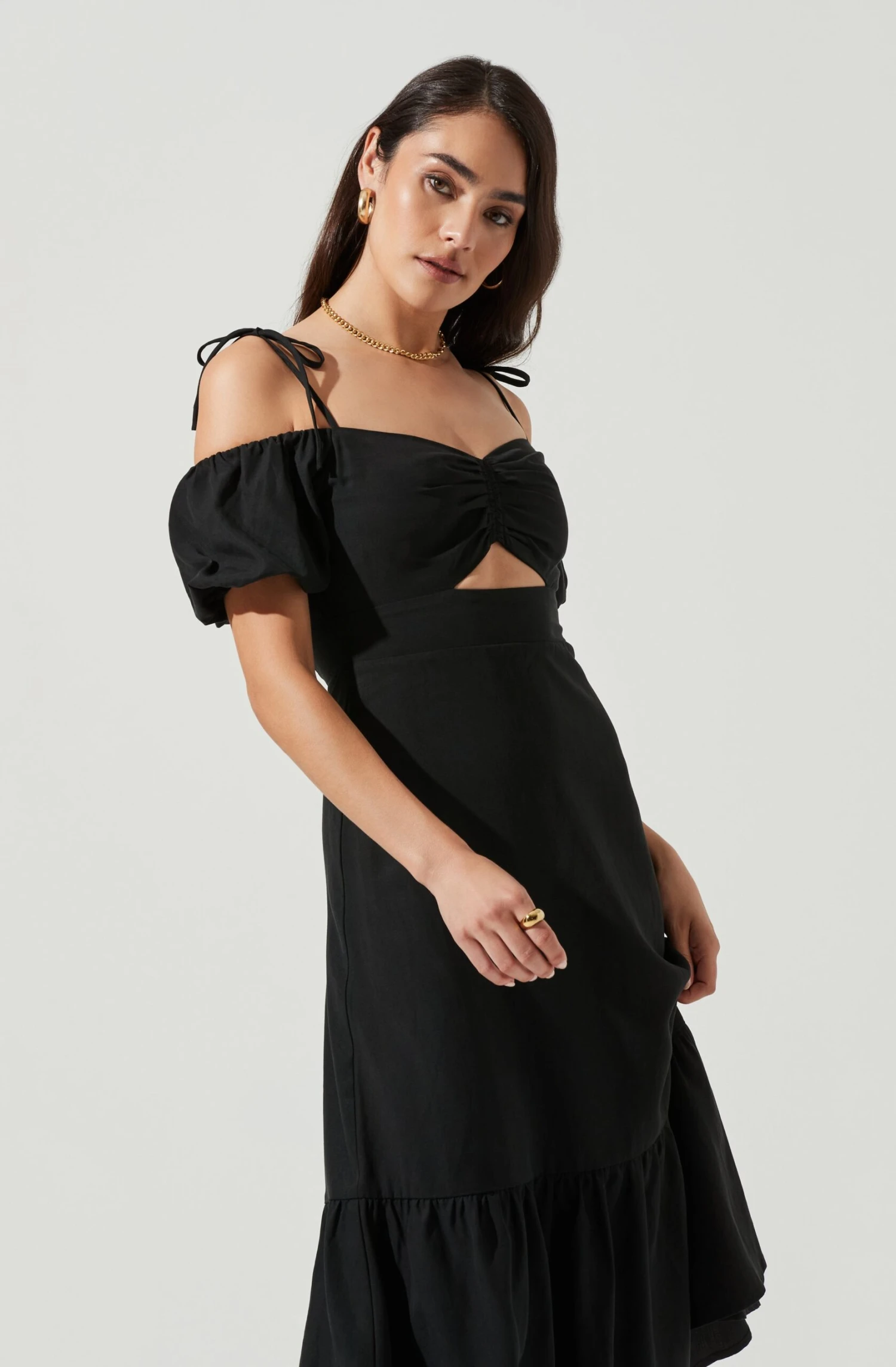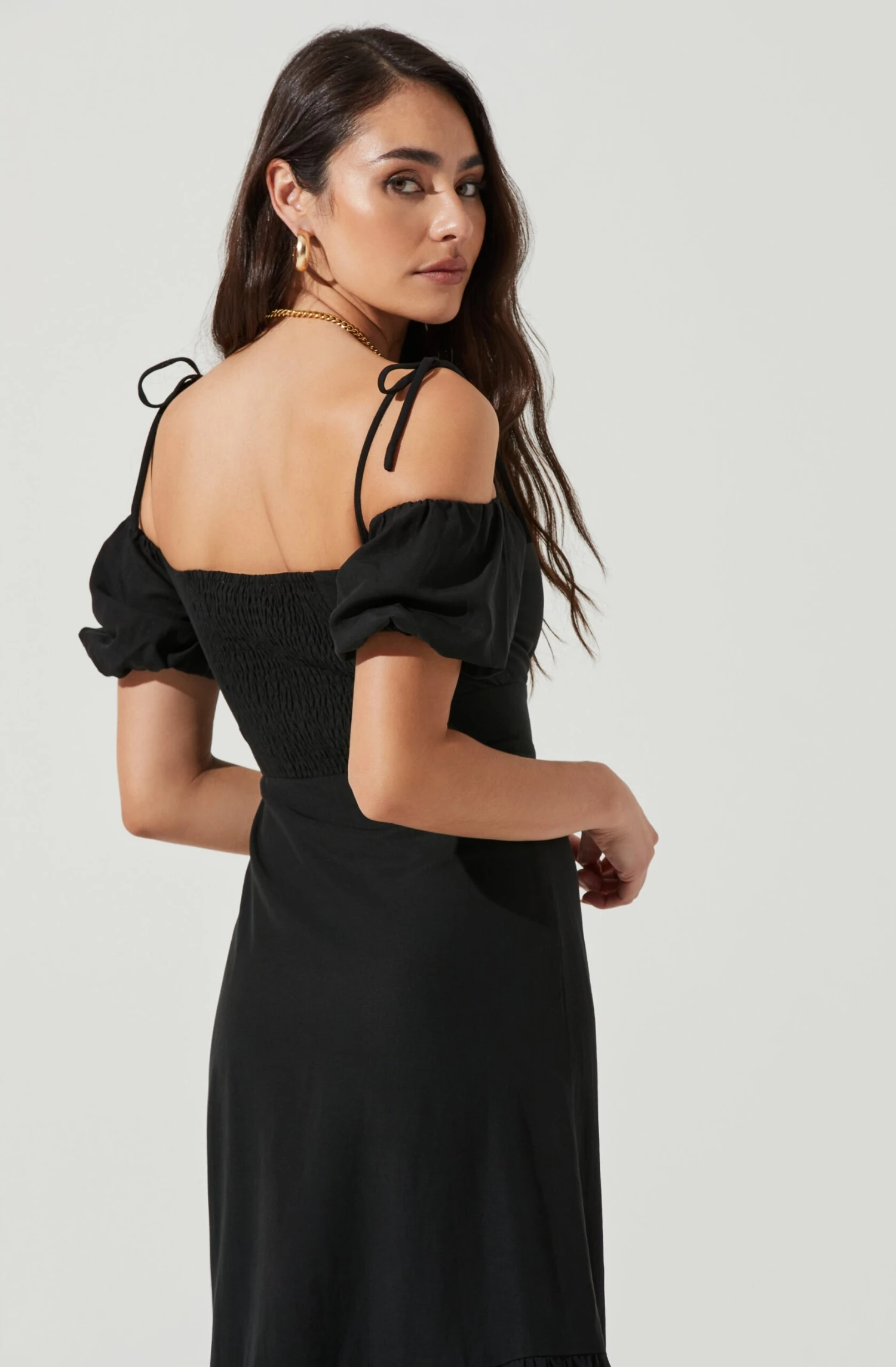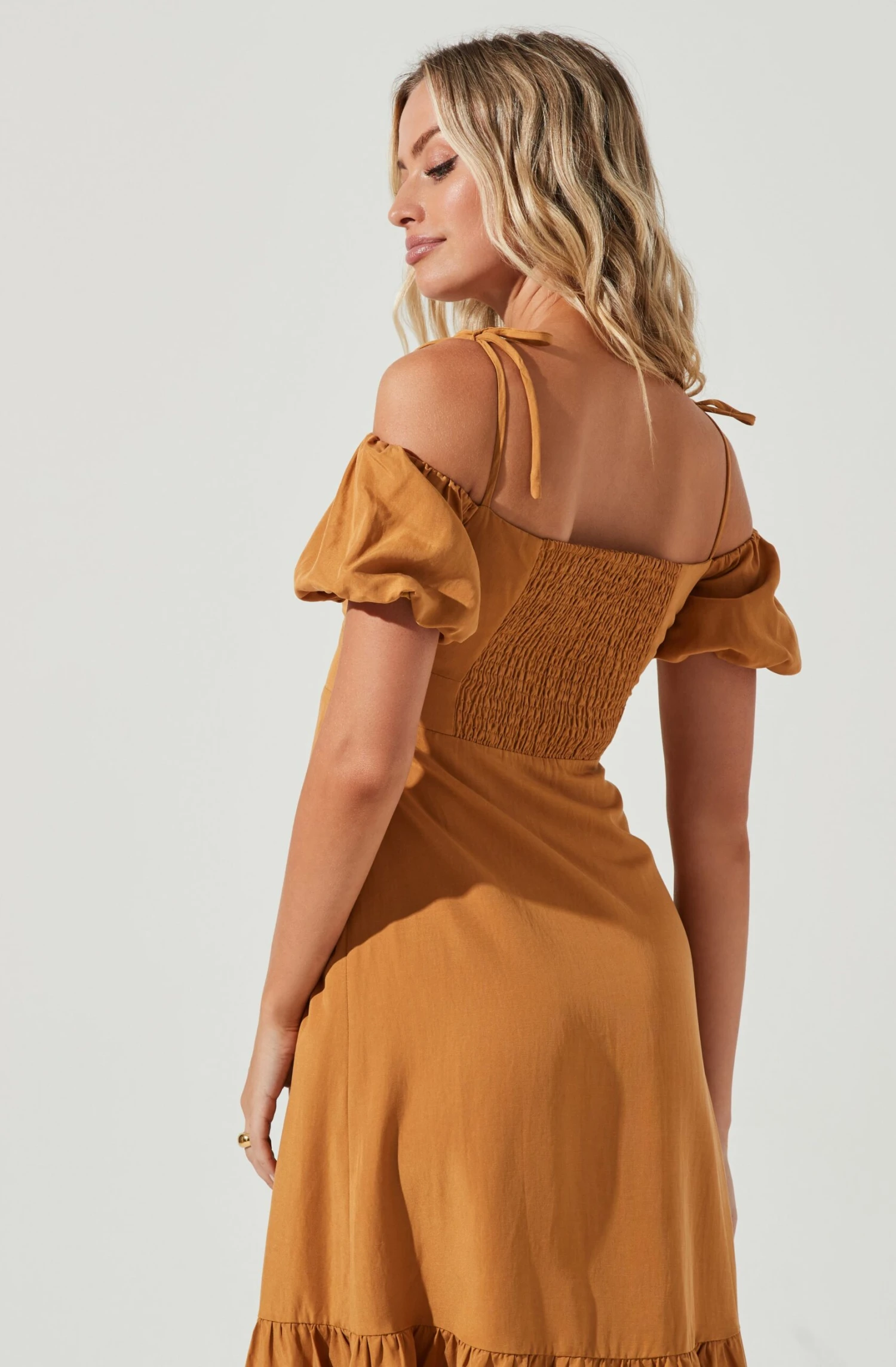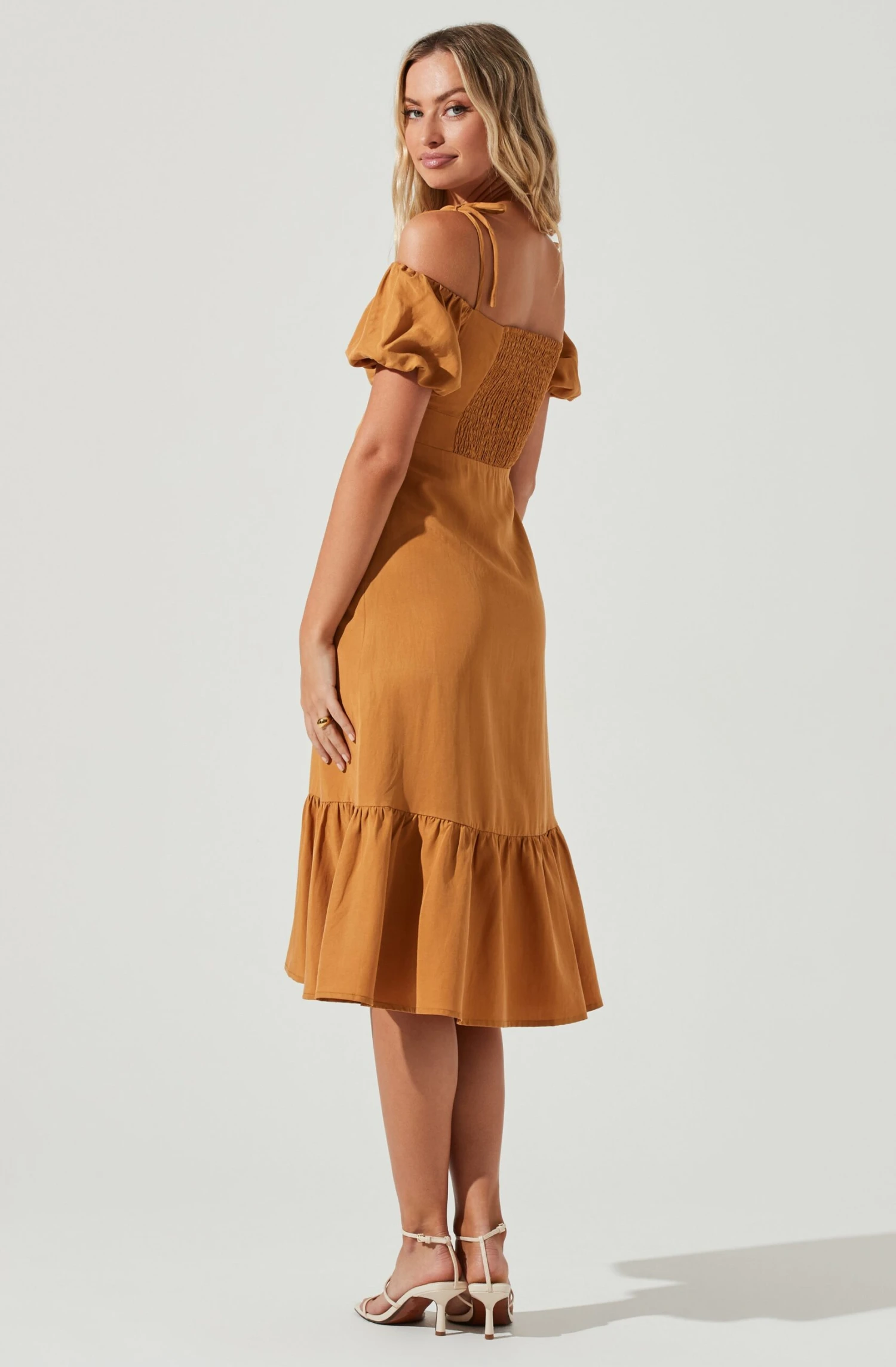 The Aleda Dress features a sweetheart neckline that is supported by a self-tie cold shoulder design. Front cutout accent. Midi-length skirt with a ruffle trim detail. Smocked back.