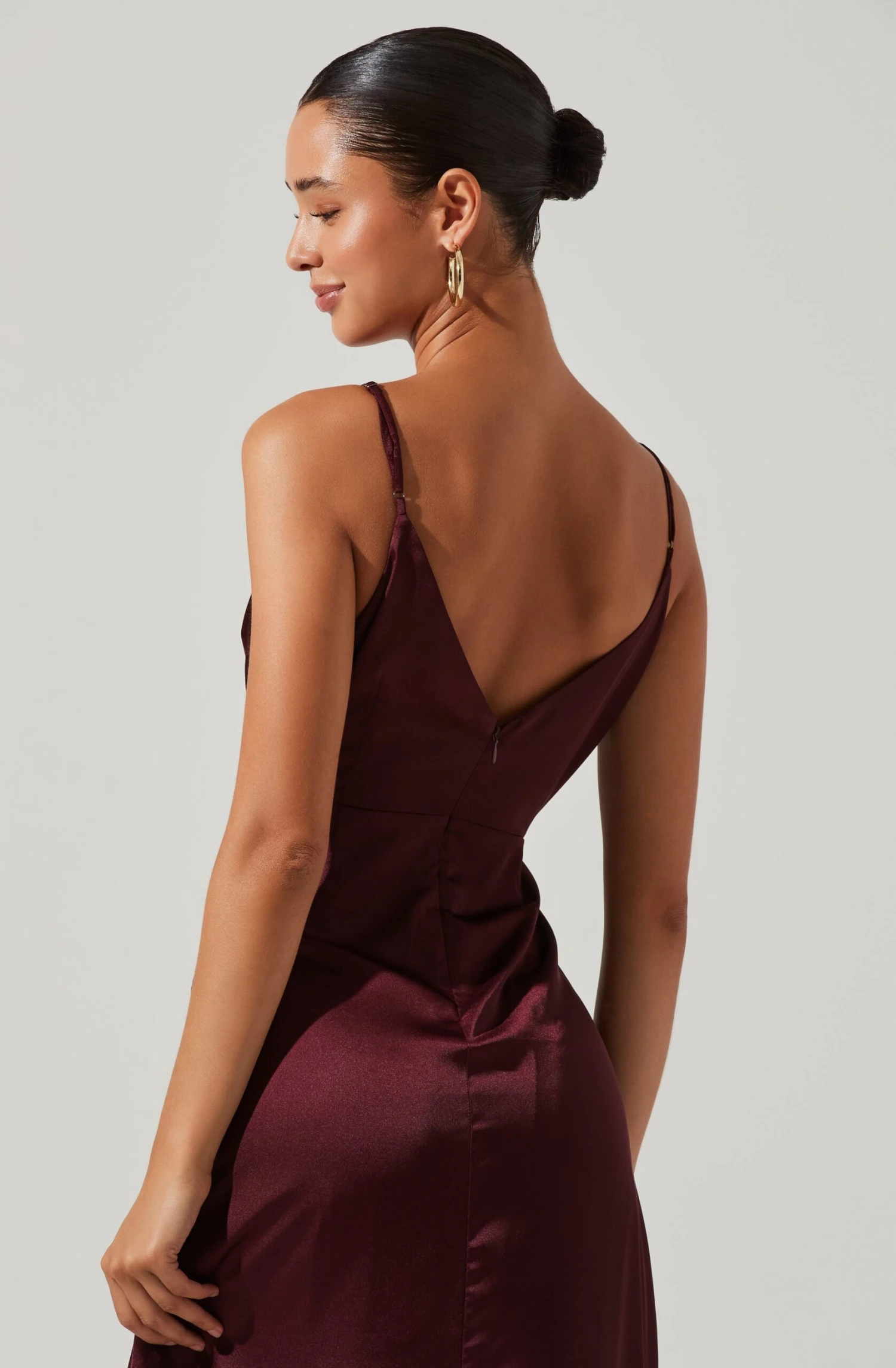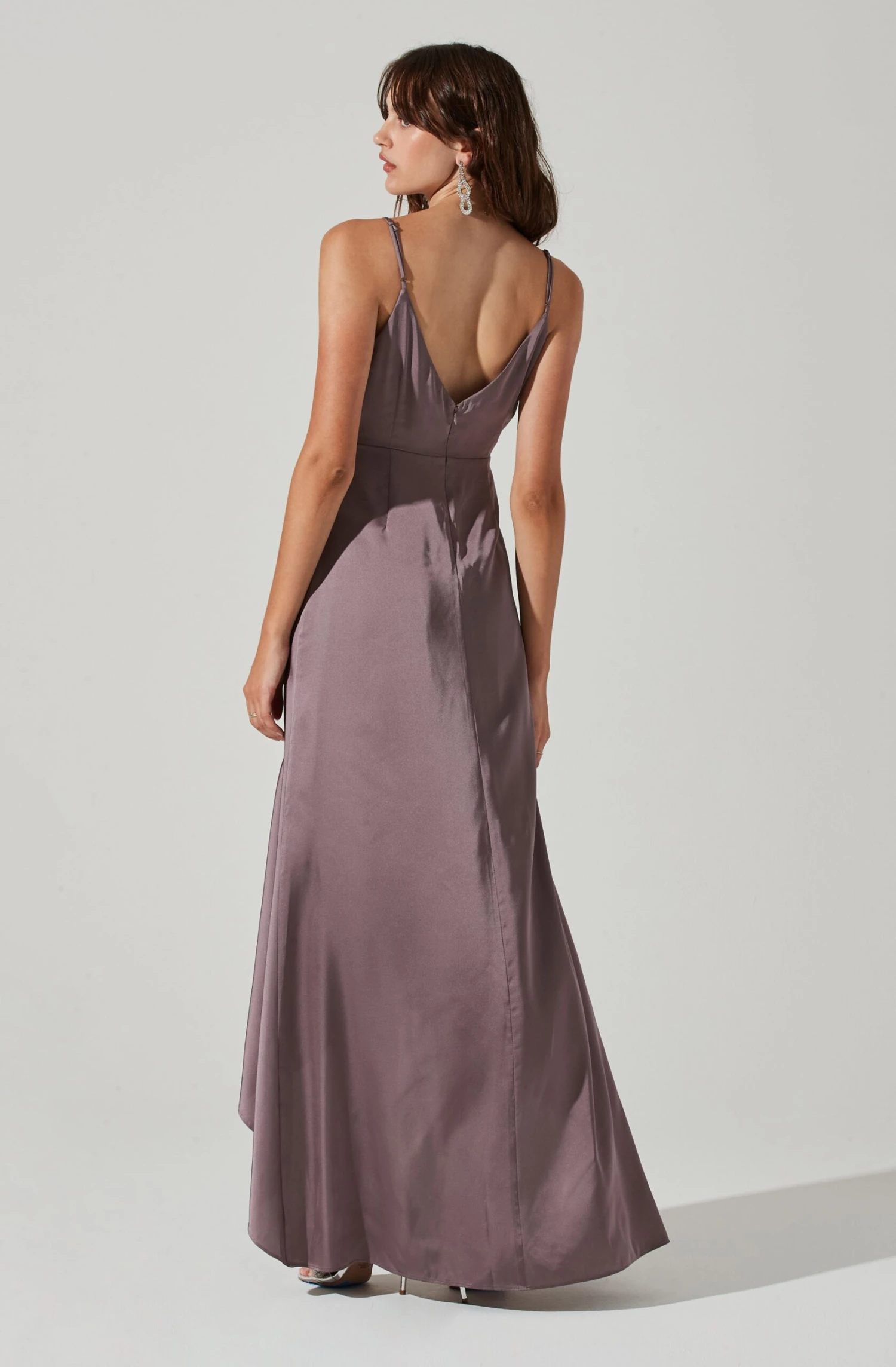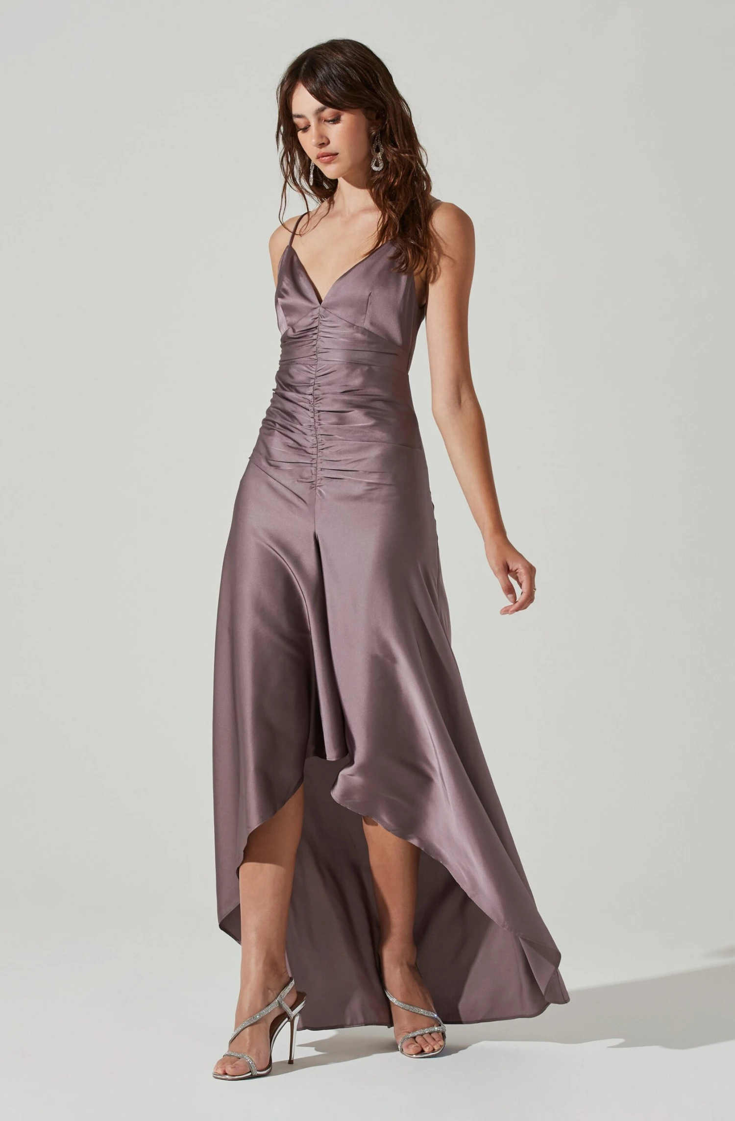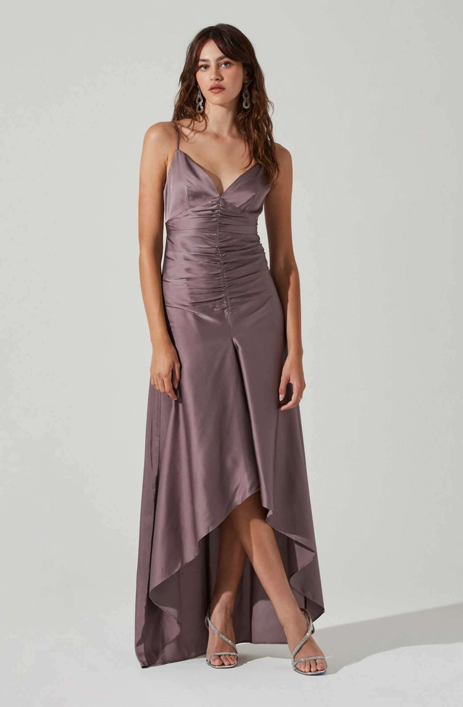 With a flattering hi-low hem, this maxi bridesmaid dress features a luxuriously chic satin finish. Sweetheart neckline leads to a ruched bodice that descends to a maxi skirt. Adjustable shoulder straps. Concealed back zip closure.