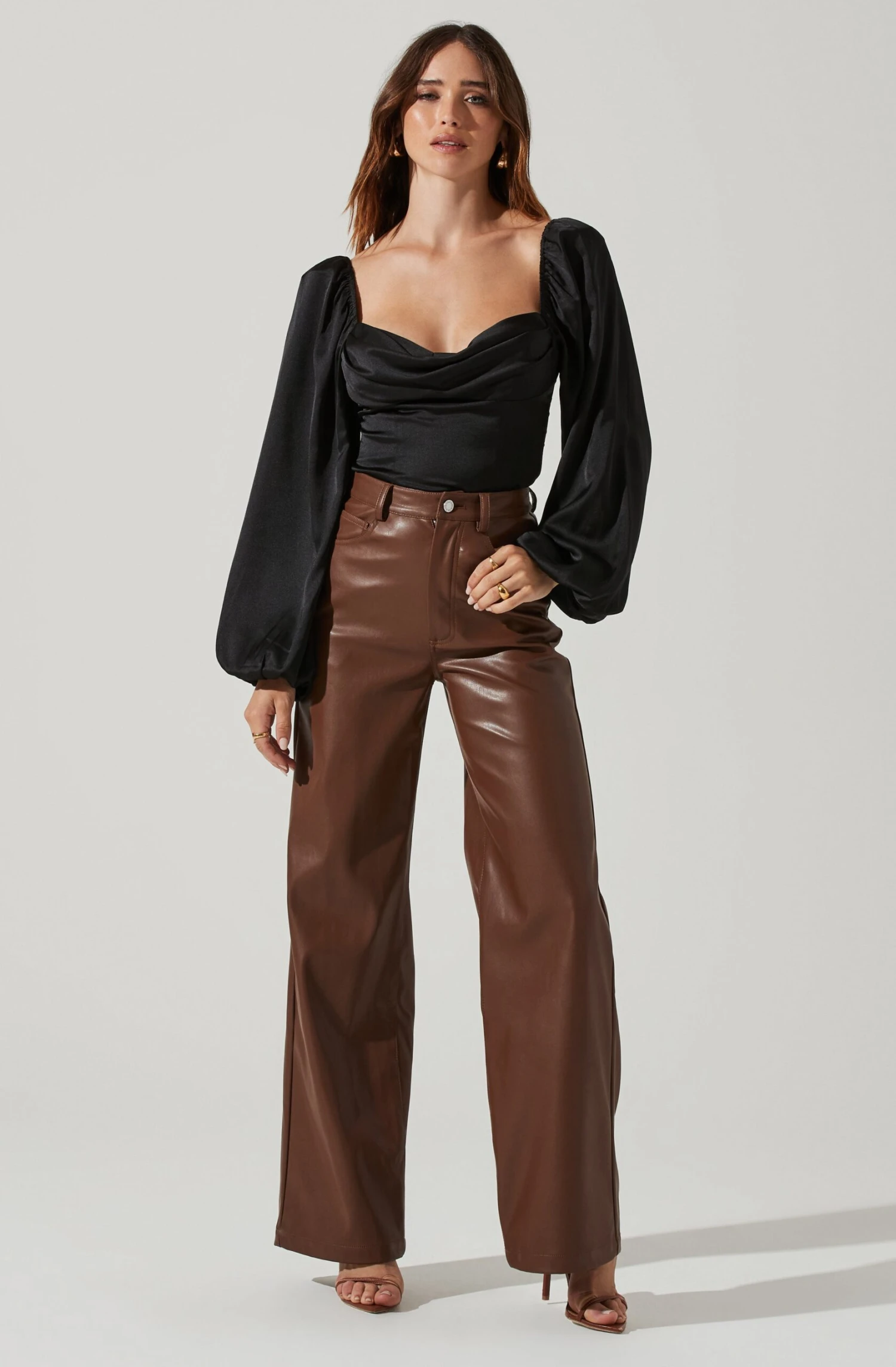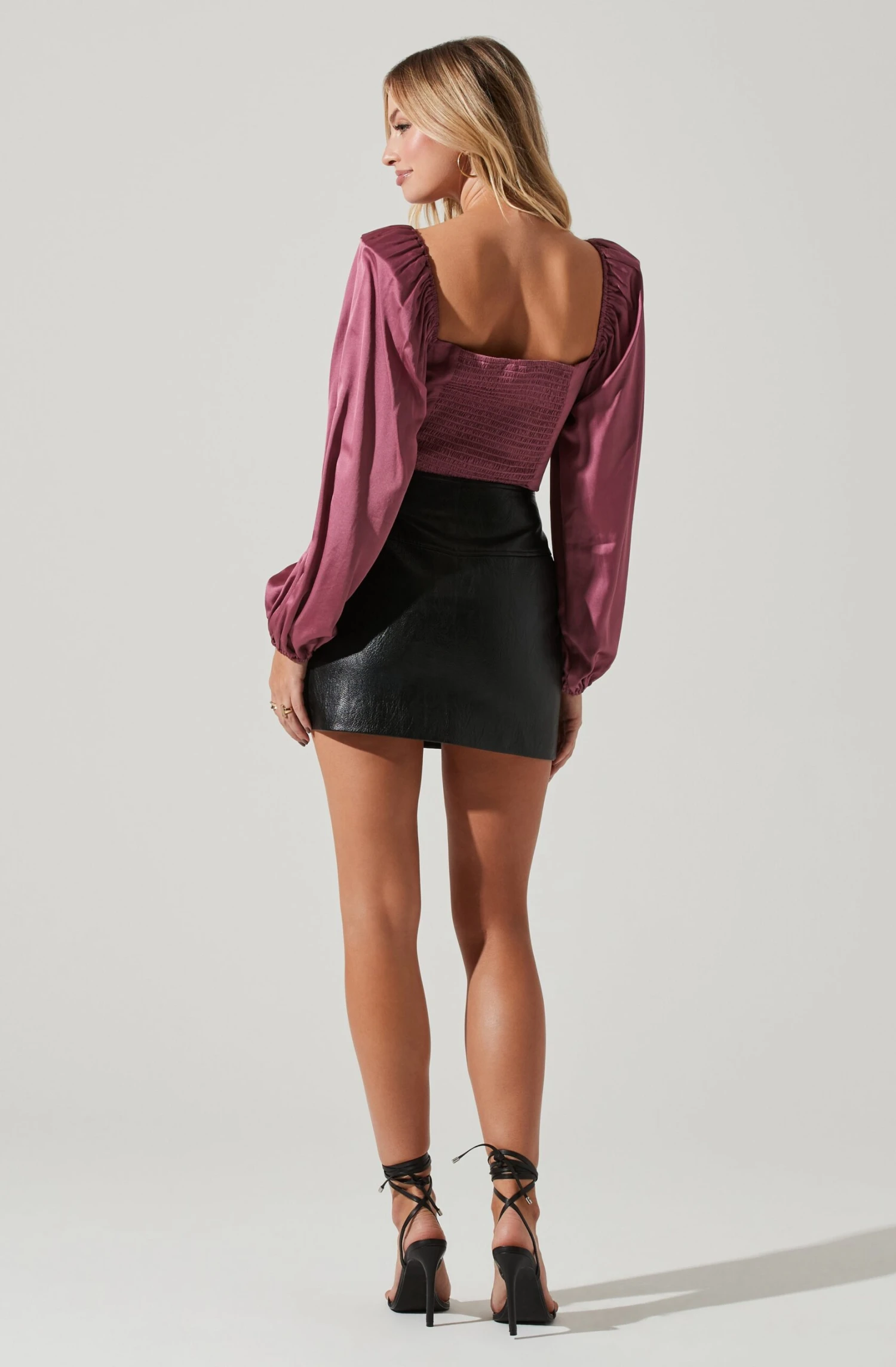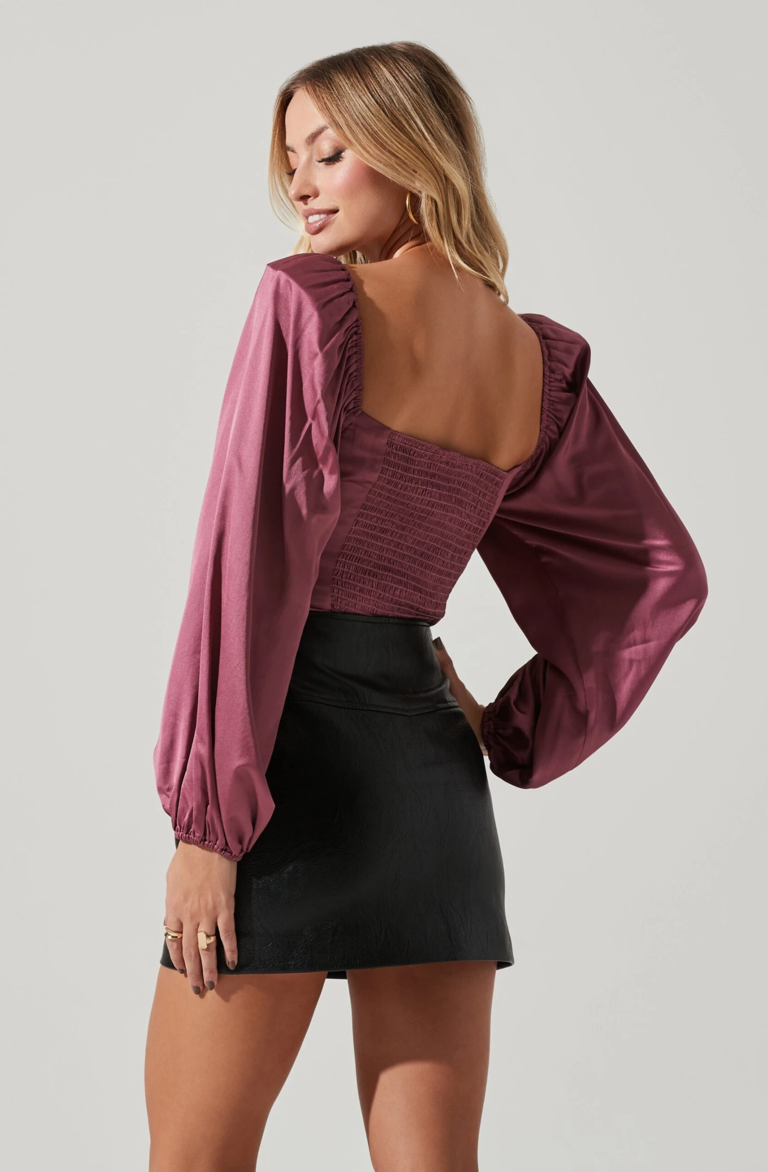 The Arleth top features a satin finish. Sweetheart neckline that leads to a fitted silhouette. Long puff sleeves. Padded shoulders. Smocked back.