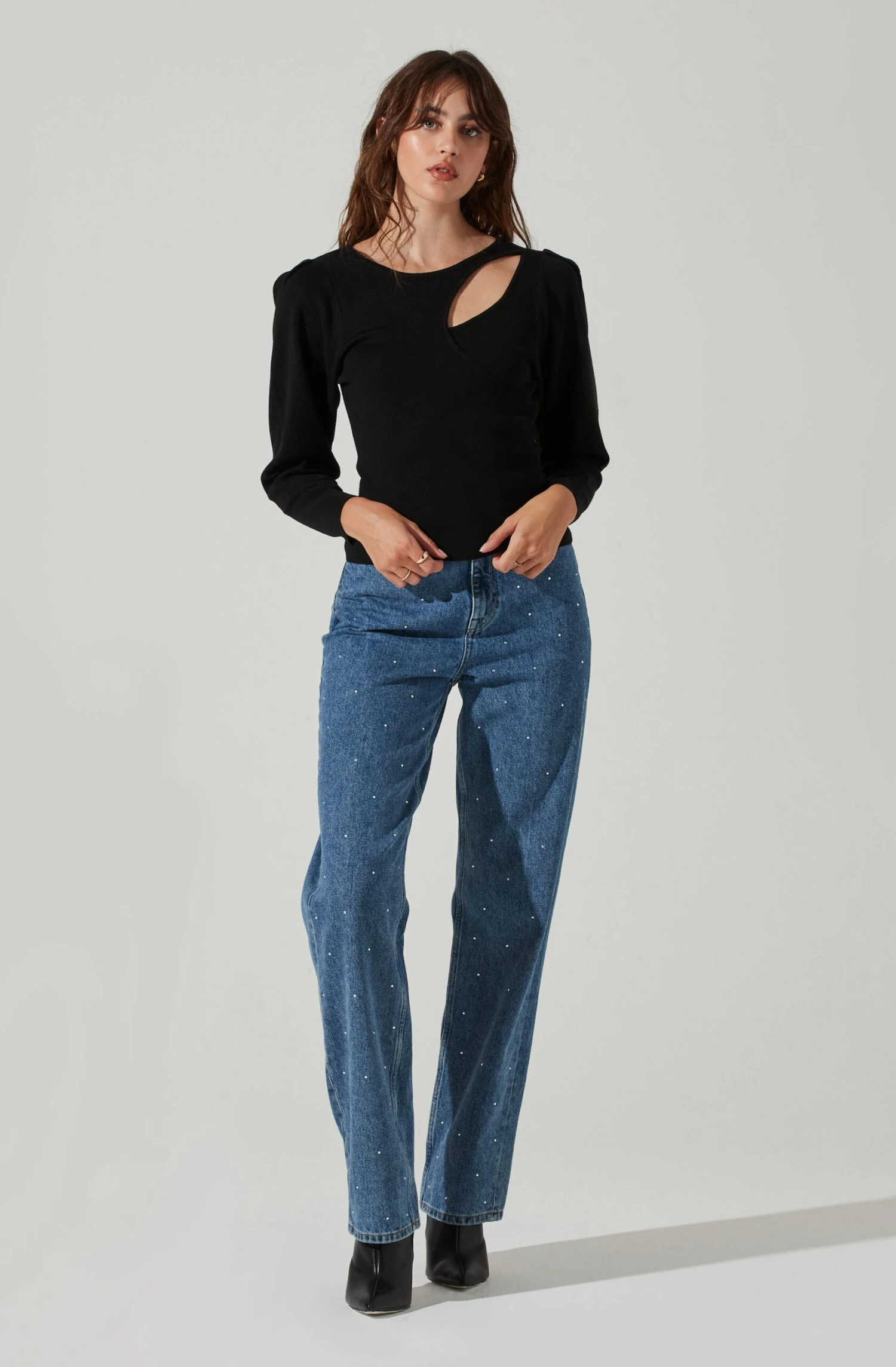 This top features a knit construction. Round collar leads to an asymmetrical cutout at the neck. Long sleeves.