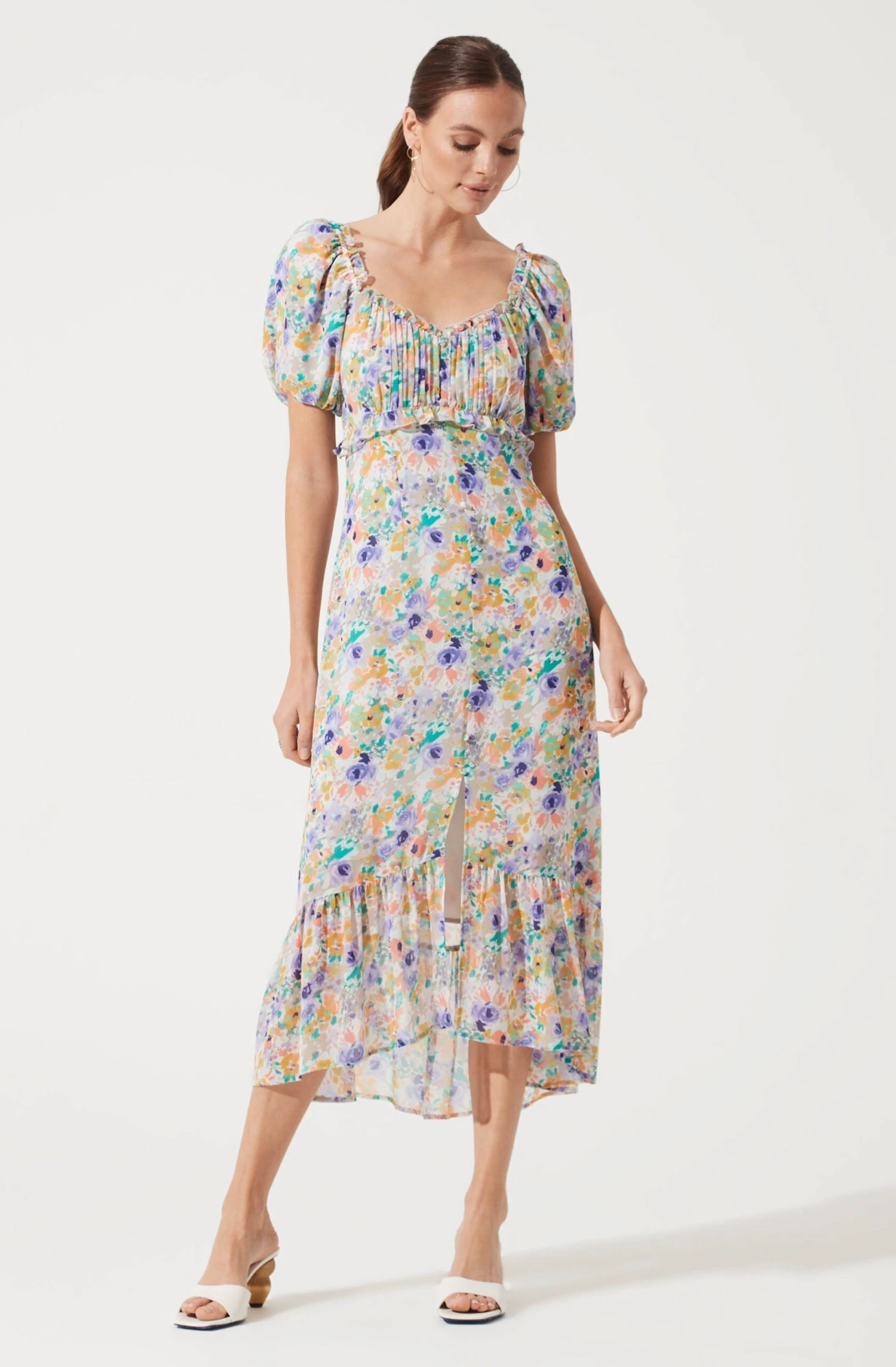 Spring flowers bloom into unforgettable dresses like this one. It features a sweetheart neckline that descends to an empire waist with a ruched bust and ruffle detail. Delicate buttoned front leads to a front slit accent and ruffled hemline. Short balloon sleeves.