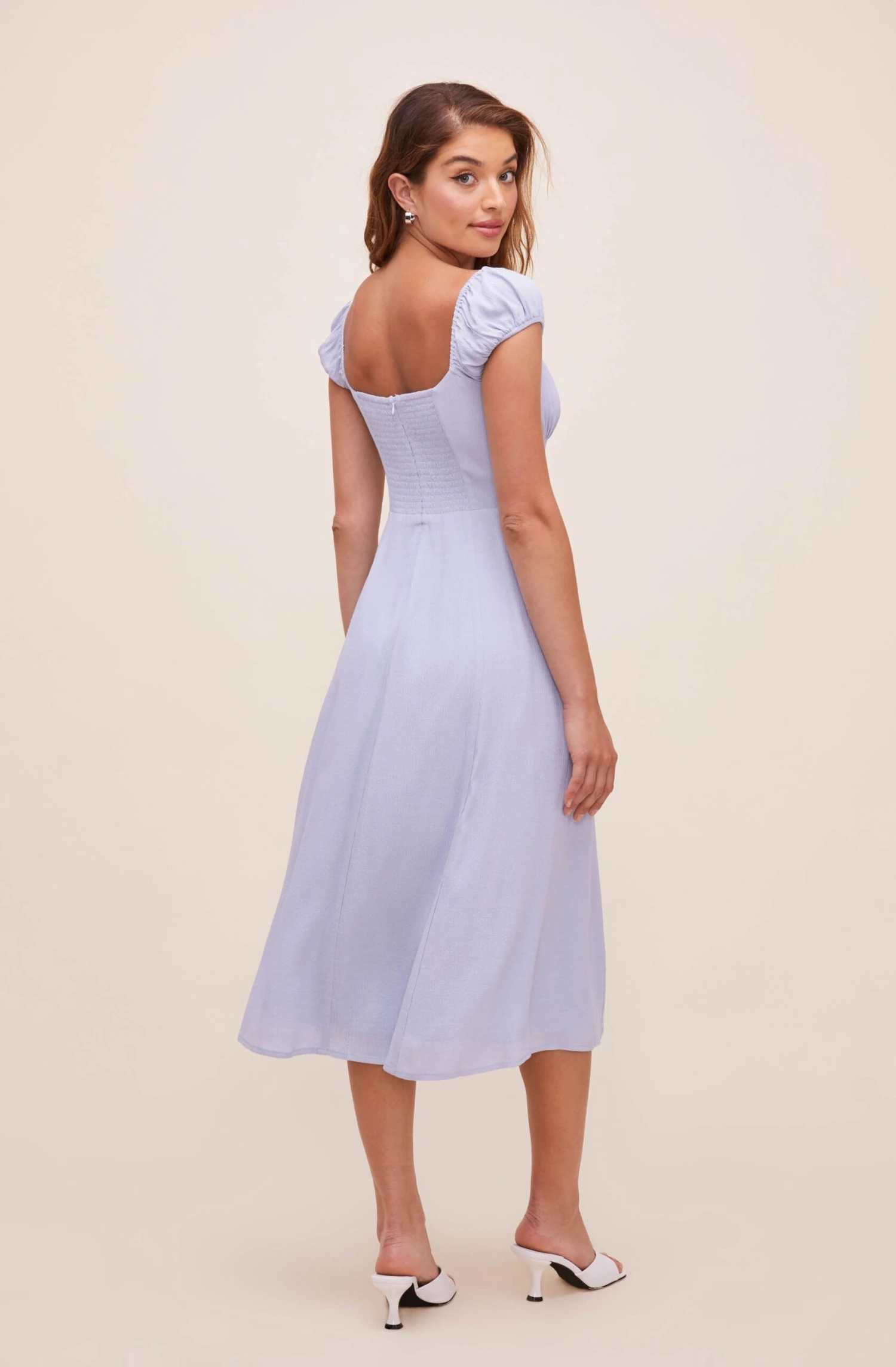 Bonjour beautiful! This romantic midi dress features a square neckline that descends to a shirred bust and buttoned front. Short cap sleeves. Front slit accent.