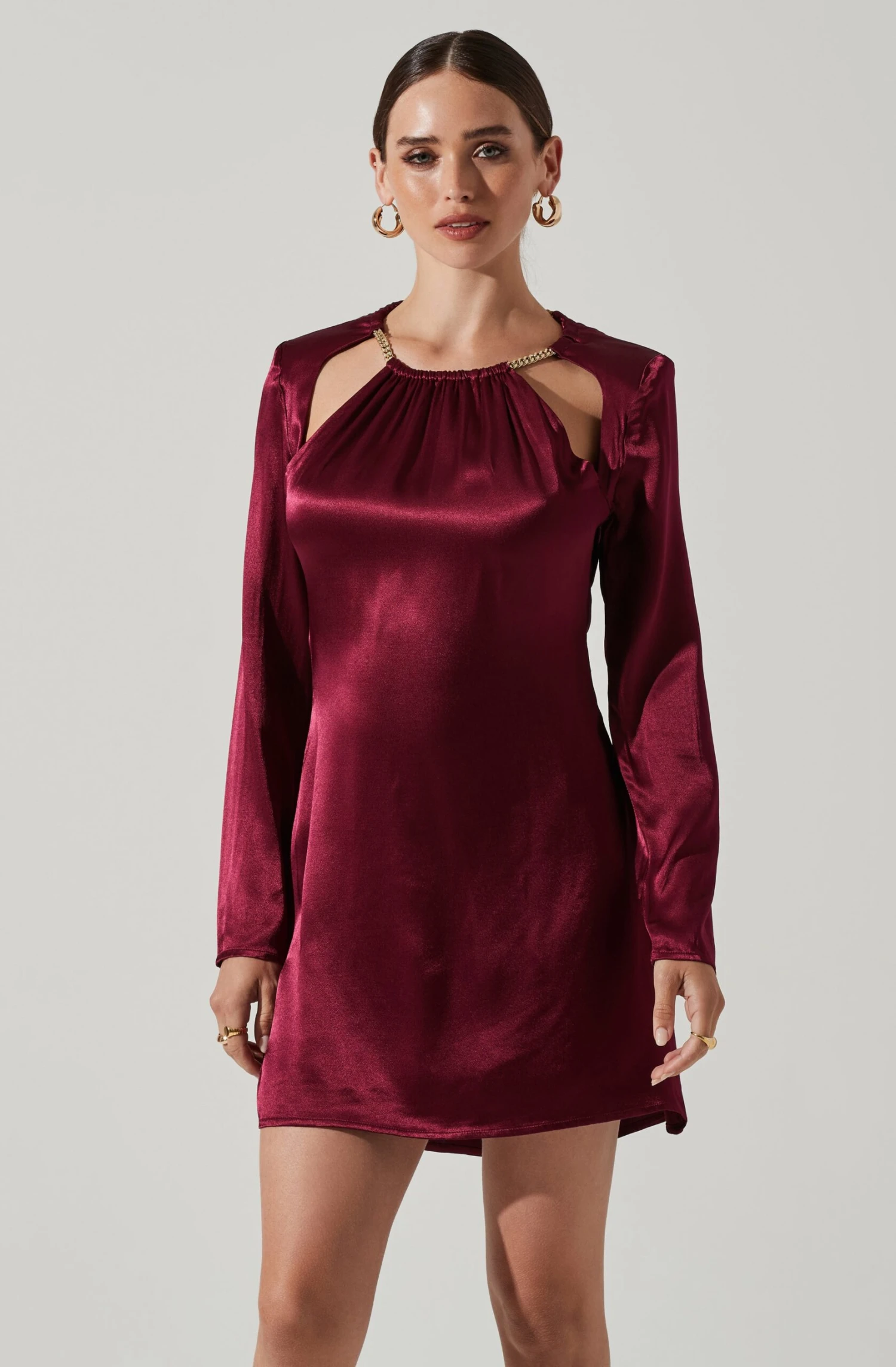 The Carina Dress features a high-shine satin finish. Neckline is supported by chain link hardware that clasps at the back with a cutout front. Long sleeves. Open back. Abbreviated hemline.