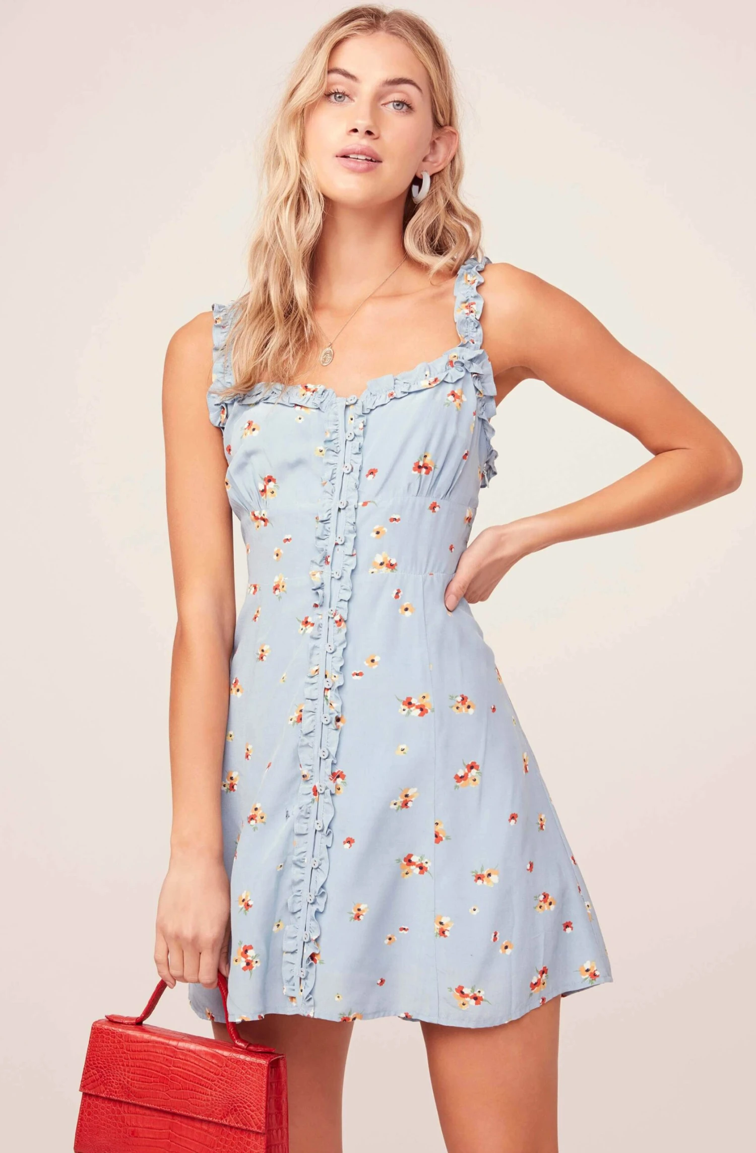 Just add bottomless mimosas and this frilly dress is good to go! Subtle square neckline and soft ruffle trim leads down to a buttoned front and slightly flared skirt. Dainty floral print gives this mini dress a breath of fresh air! Ruffle shoulder straps.