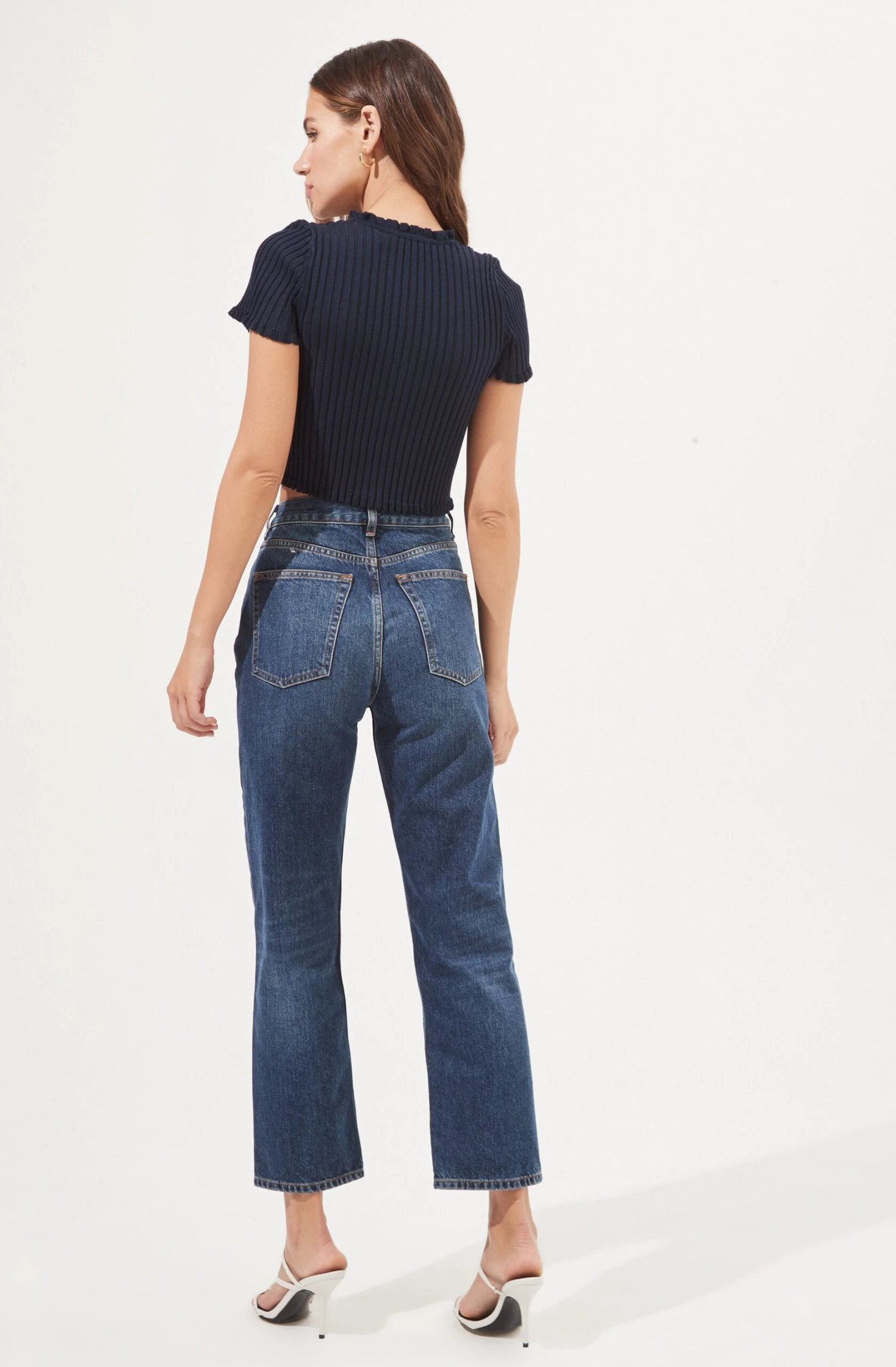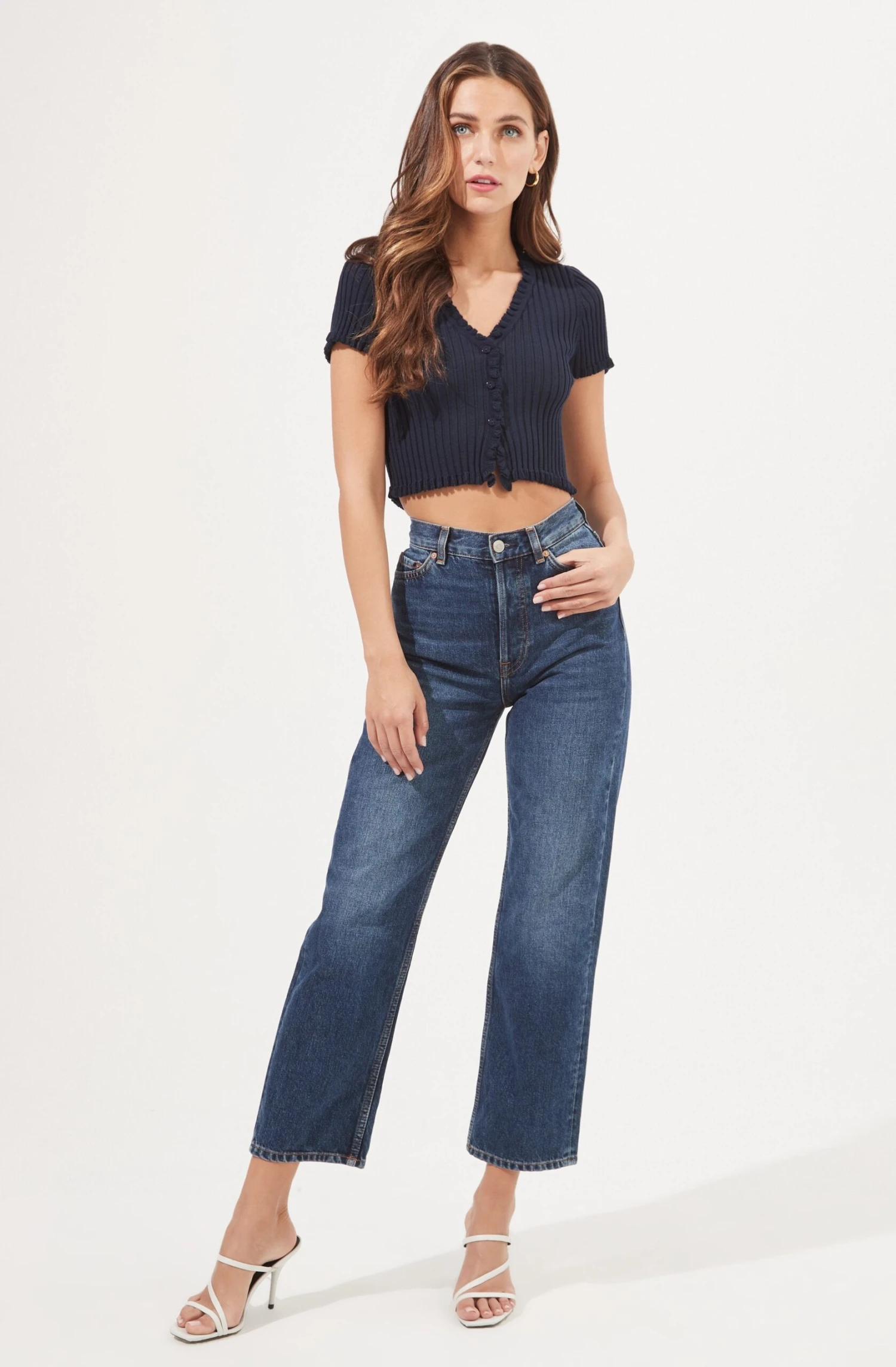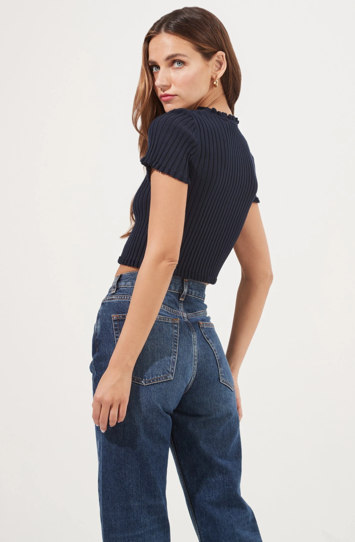 This sweet and chic top features a V neckline with a subtle ruffle trim that leads to a buttoned front and cropped hem. Short sleeves. Ribbed knit construction.