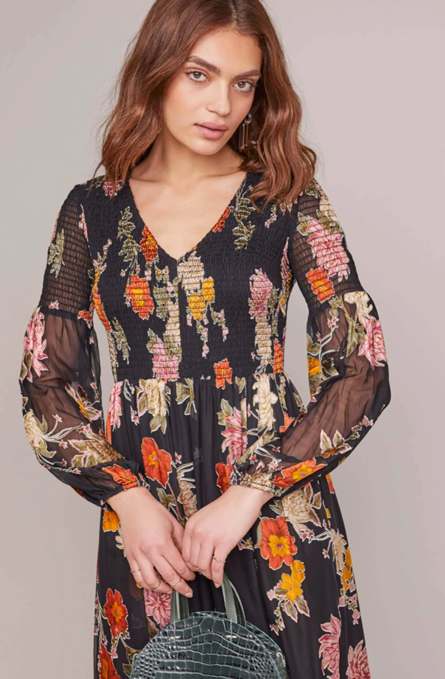 Retro chic makes our hearts sing! This statement floral midi dress features a V neckline that descends to a smocked bodice. Flowy A-line midi skirt gives us retro romance vibes and is finished with long sheer sleeves for added charm.