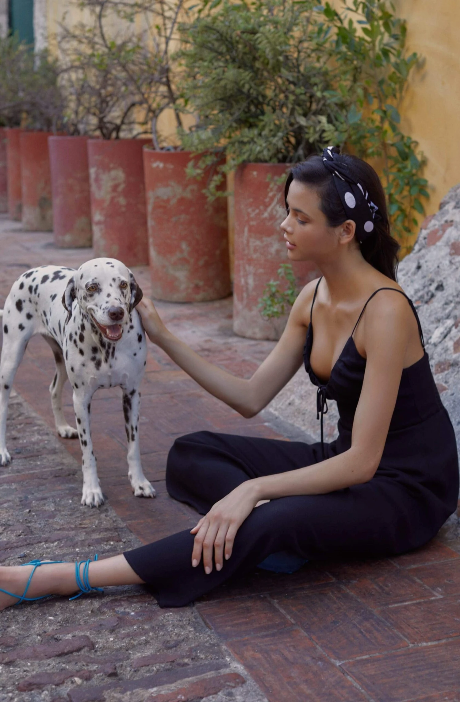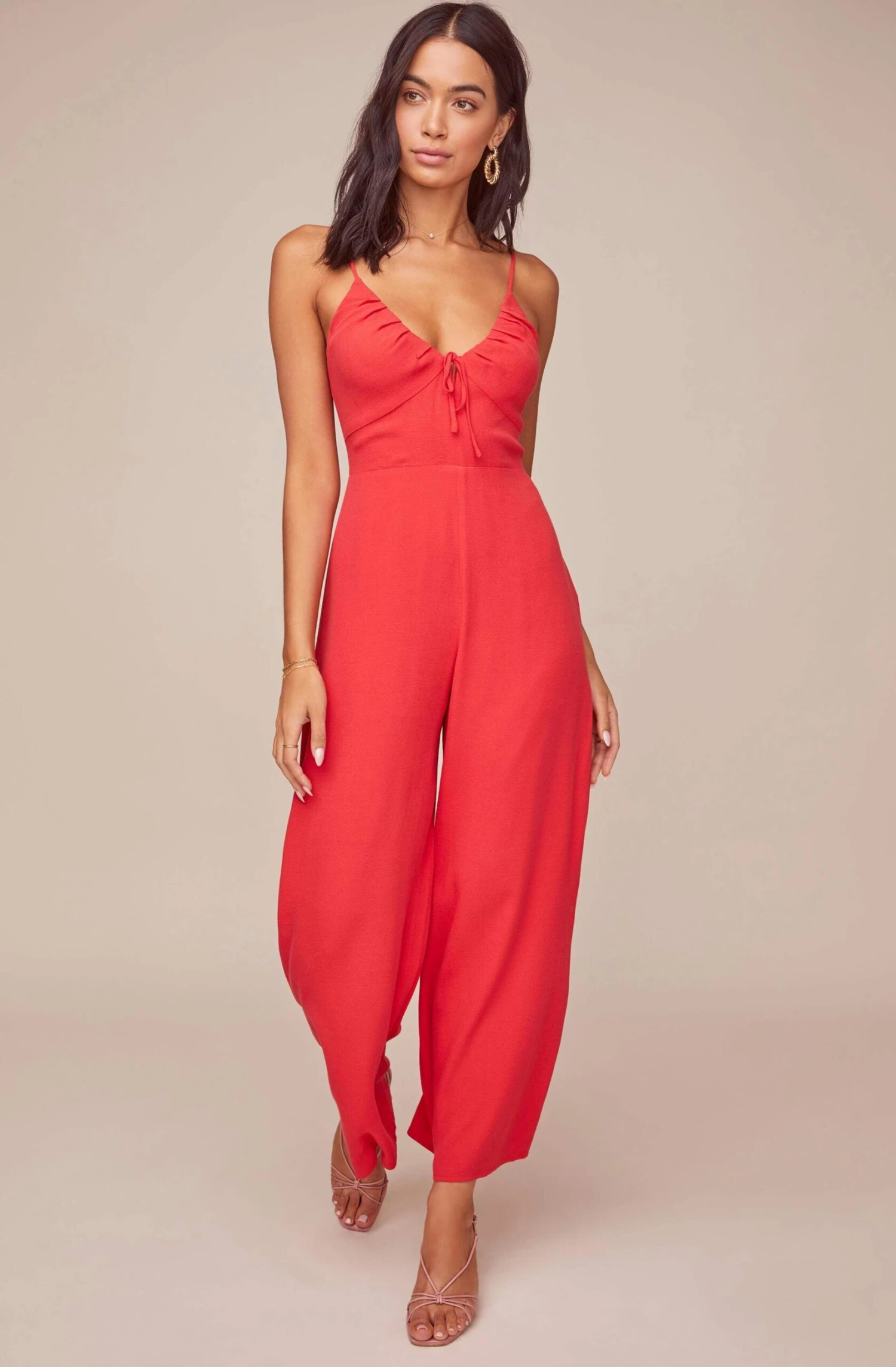 Oh, hello jumpsuit season! The Cicely features a plunge neckline with a drawstring bust for added detail. Fitted bodice leads to wide leg bottoms. Low cut back.