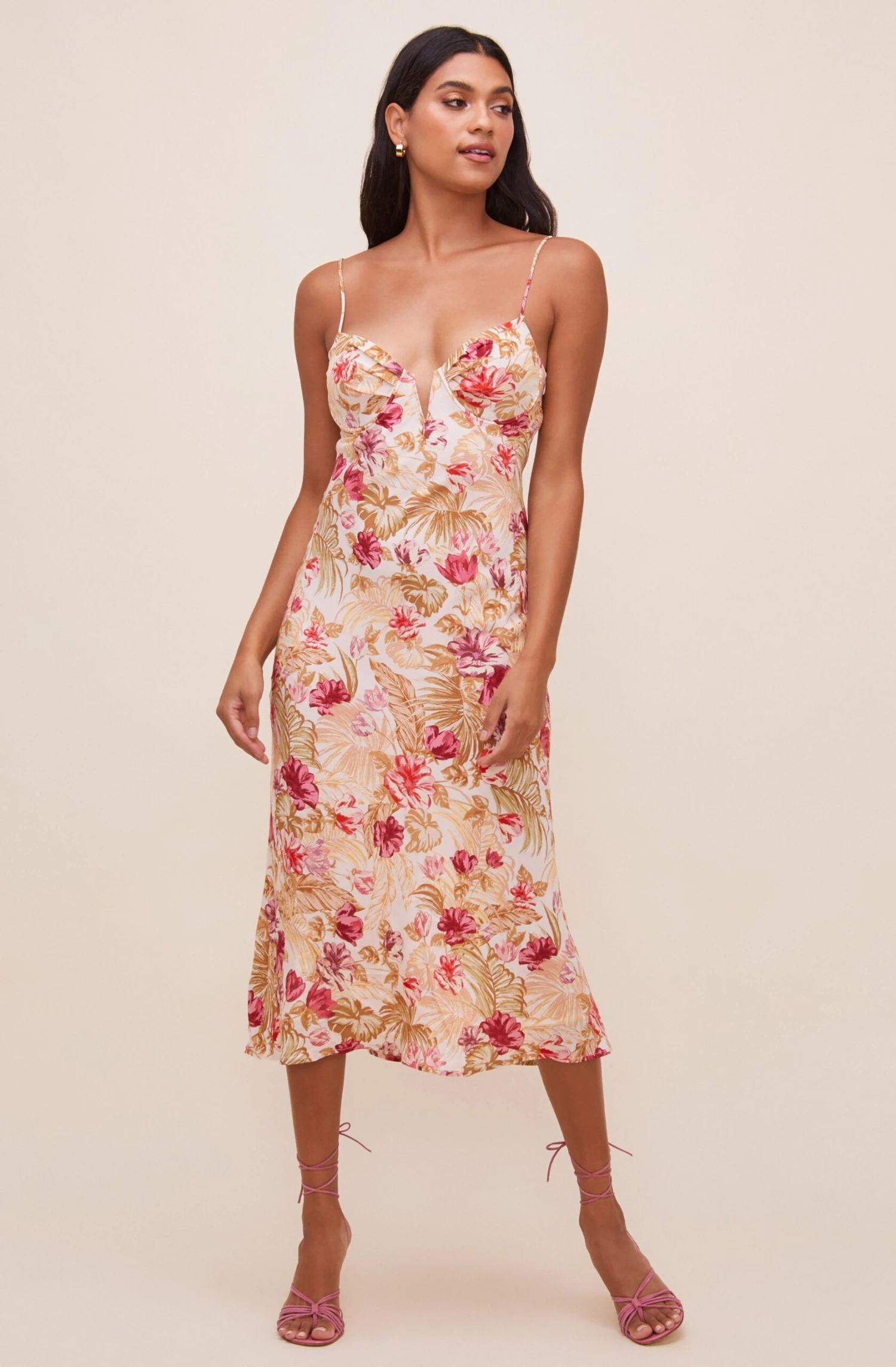 Make your tropical escape with the Coralie Dress. It features a sweetheart neckline with a bustier front supported by spaghetti straps. Fitted silhouette leads to a midi-length skirt. Tropical Hawaiian print throughout.