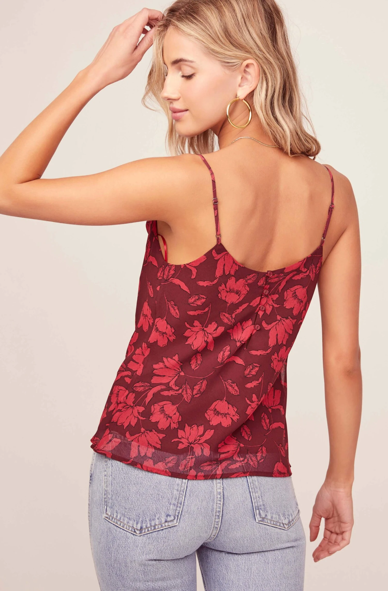 What goes together with a sun-kissed glow? A barely-there cami of course! It features a flattering cowl neckline supported by delicate straps. Decorated with a soft floral print throughout. Low-cut back.