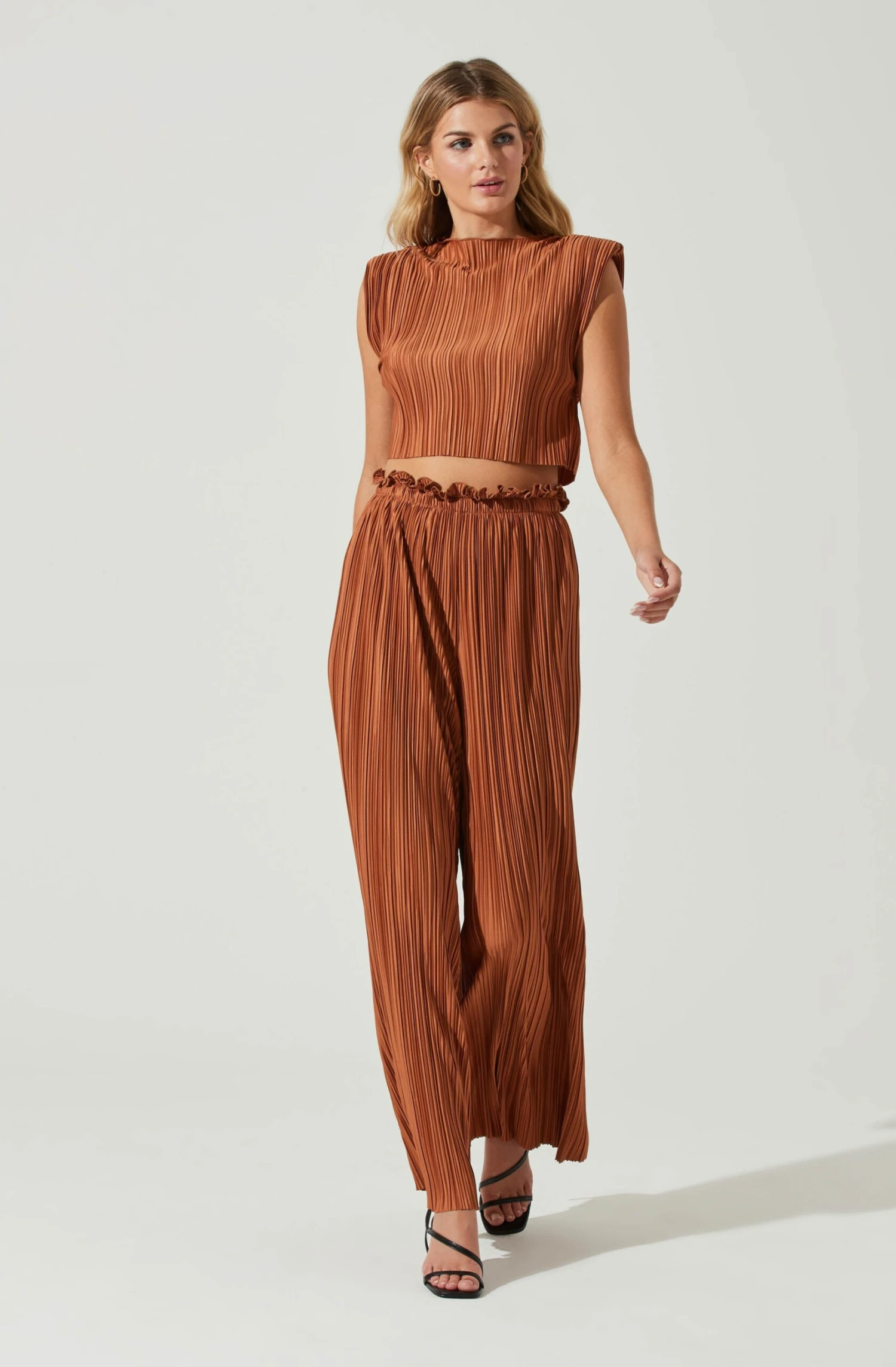 The Cruise Top features a high collar that leads to a pleated design and cropped hem. Padded shoulders. Slight stretch.