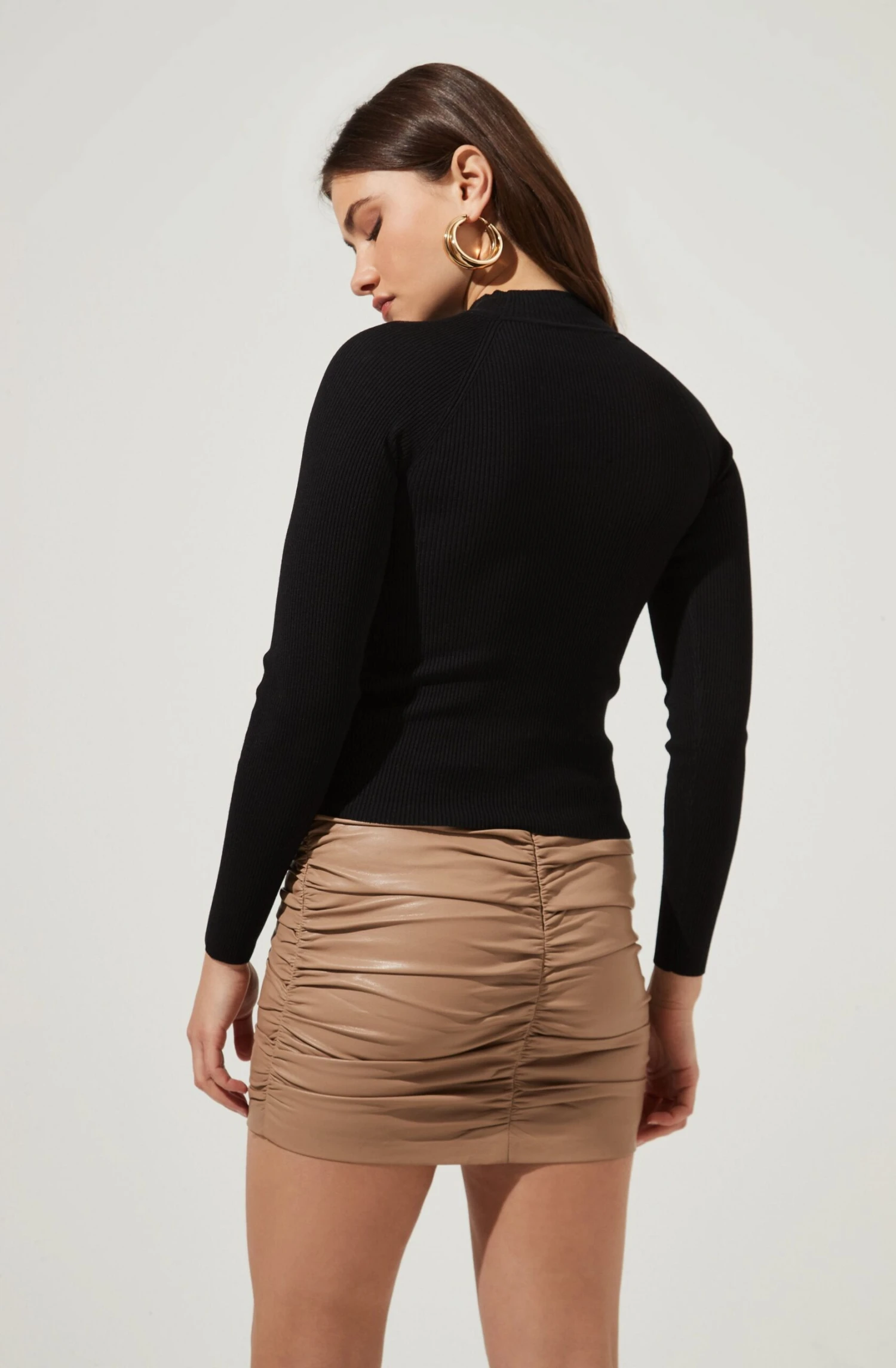 A ribbed top that features a mock neck collar that leads to a cutout front. Square neckline. Long sleeves.