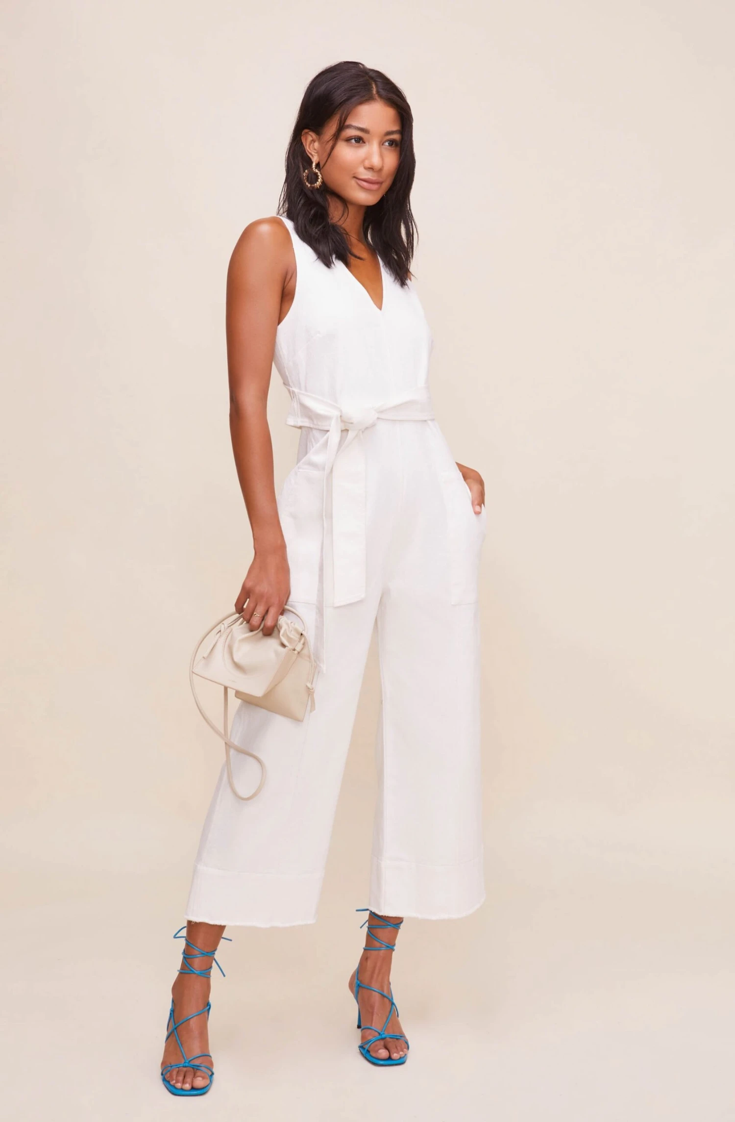 Dream a little dream of style. The Daydream Jumpsuit features a V neckline that meets a fitted bodice and tie waist. Wide leg bottoms and oversized patch pockets. Cut out back.