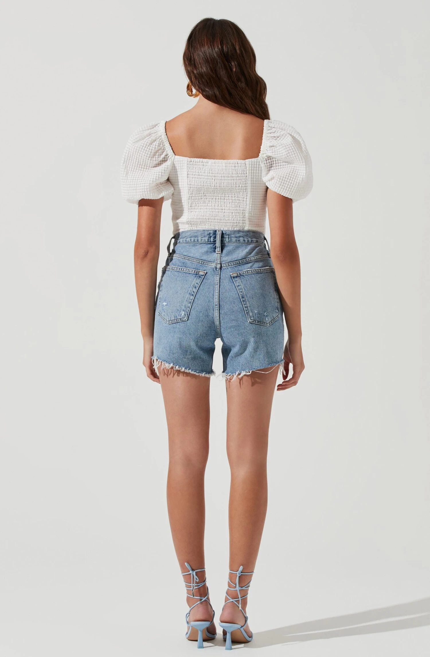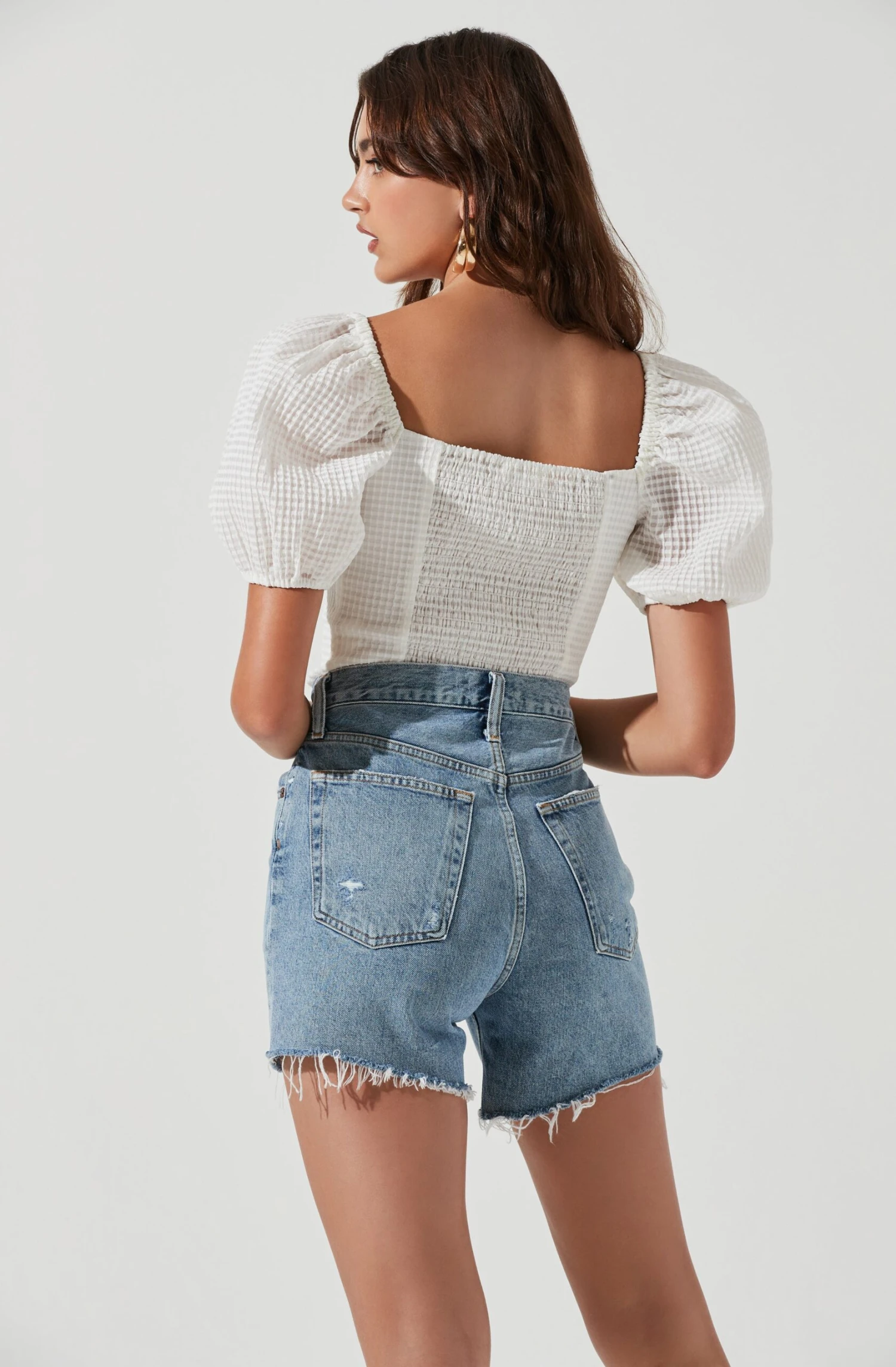 This top features a sweetheart neckline and wired notch accent. Cupped bust leads to a darted bodice. Short puff sleeves. Smocked back.