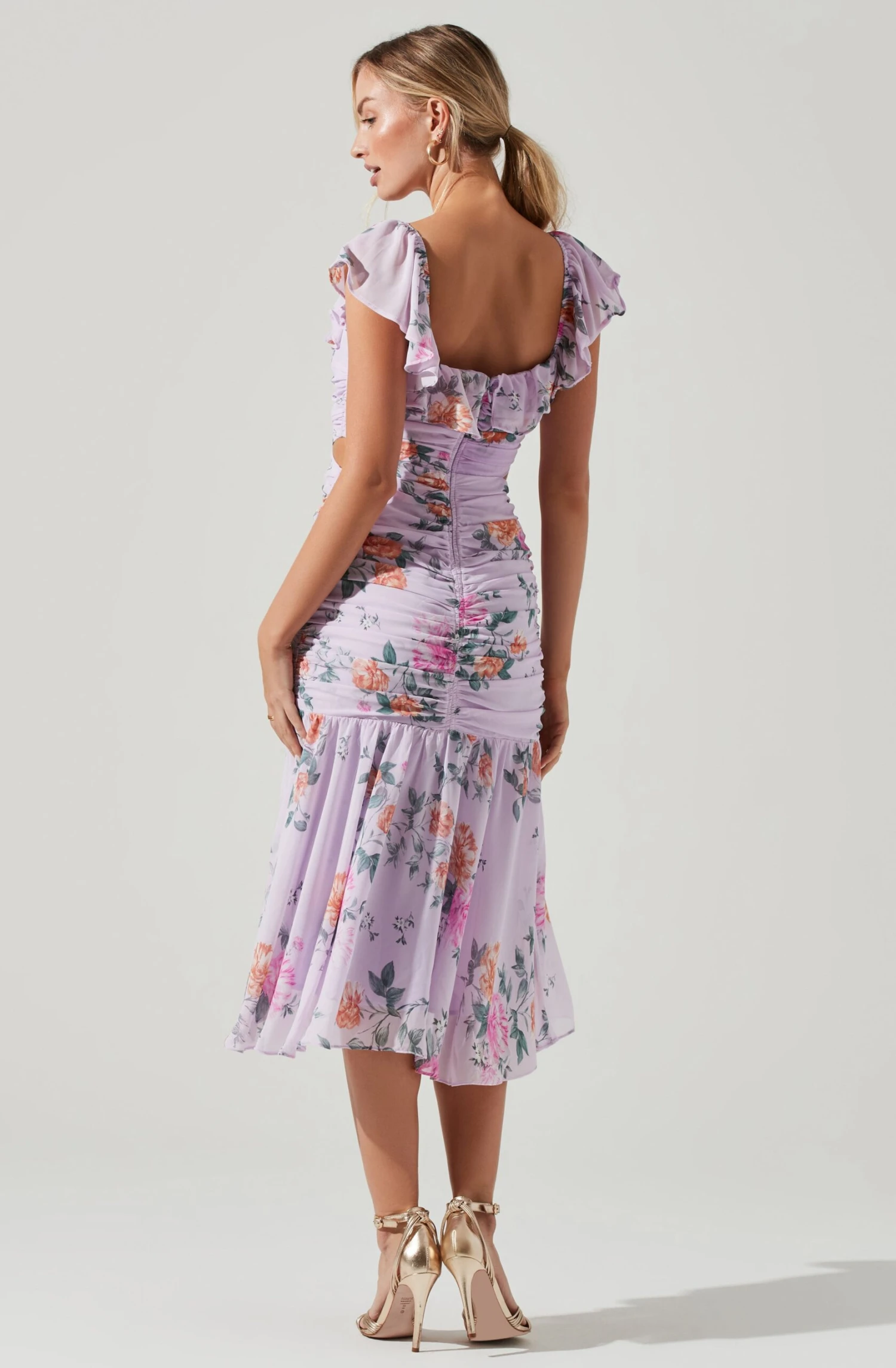 Romantic in the most flattering way. The Devereaux Dress features a floral print with a subtle sweetheart neckline trimmed with ruffles along the front, shoulders and back. Ruched bodice accentuates your figure and features two cutout details along the sides. Ruffle midi skirt.
