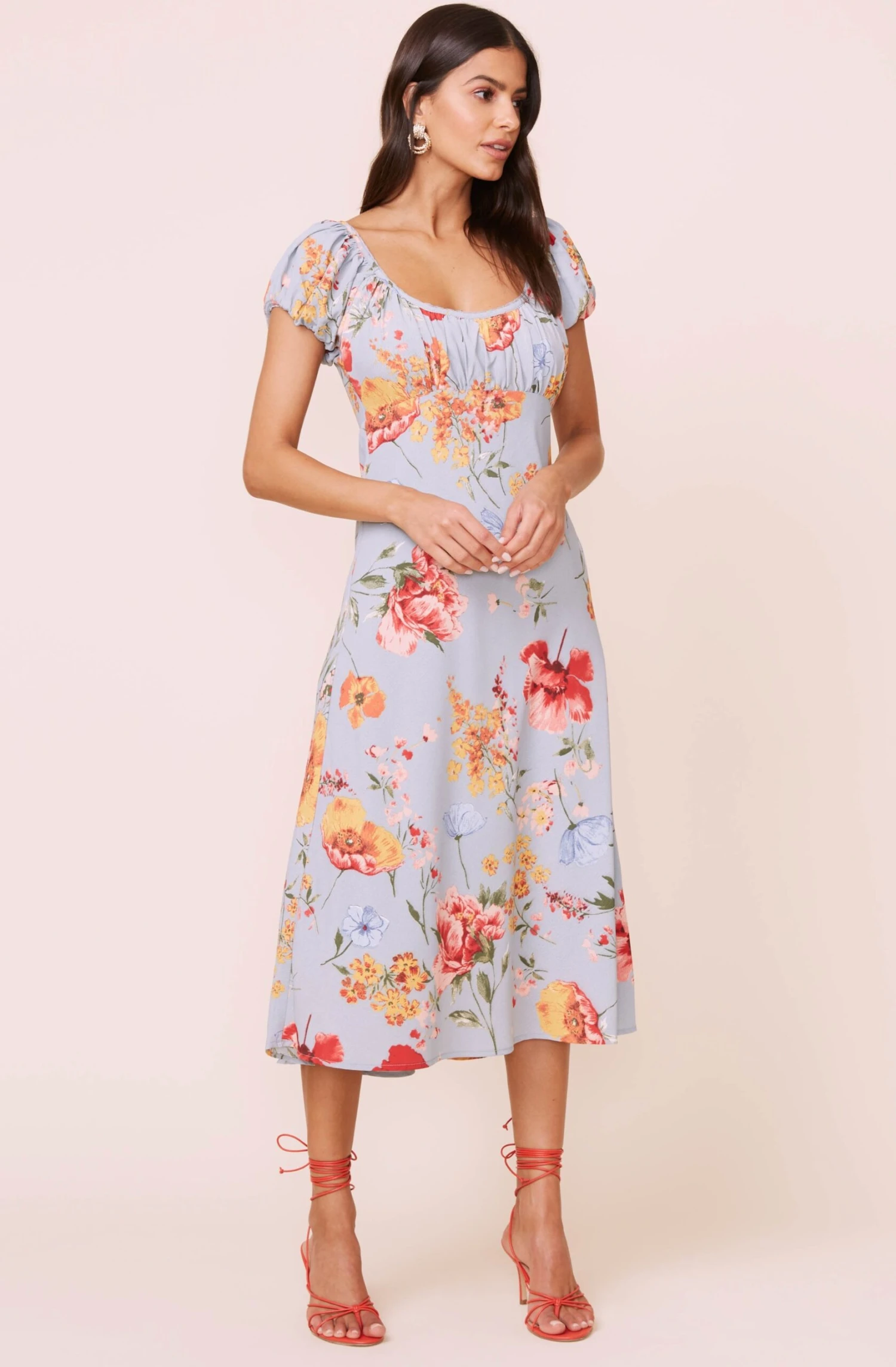 Make it a floral moment in the Donna midi! It features a square neckline that descends to a fitted bodice and breezy midi skirt. Short puff sleeves. Statement summer floral print throughout.