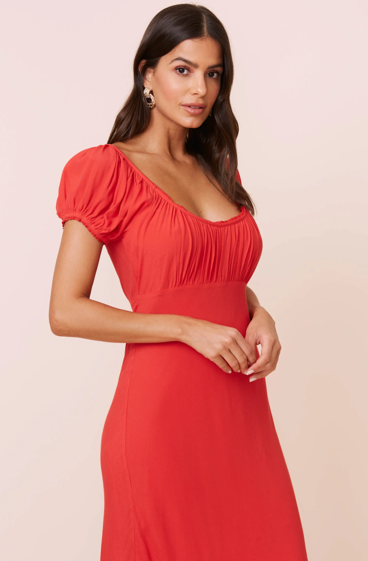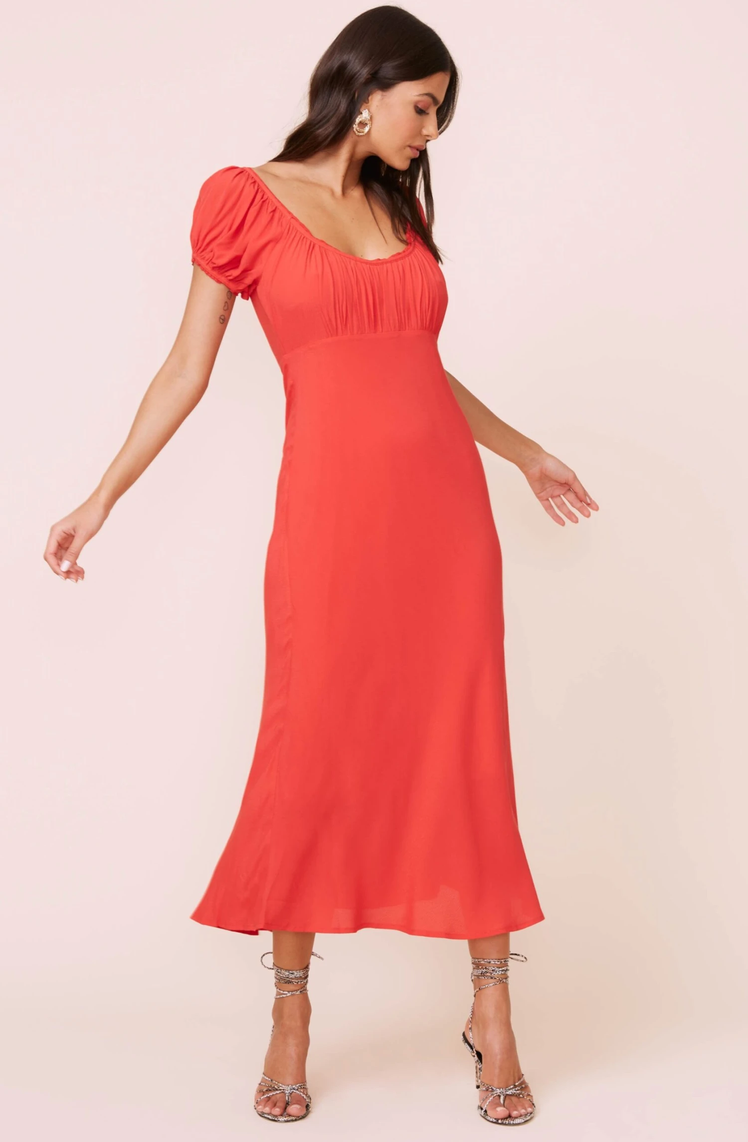 A vibrant touch to your wardrobe, the Donna dress makes an entrance! It features a flattering square neckline, fitted bodice and romantic midi skirt. Short puff sleeves.