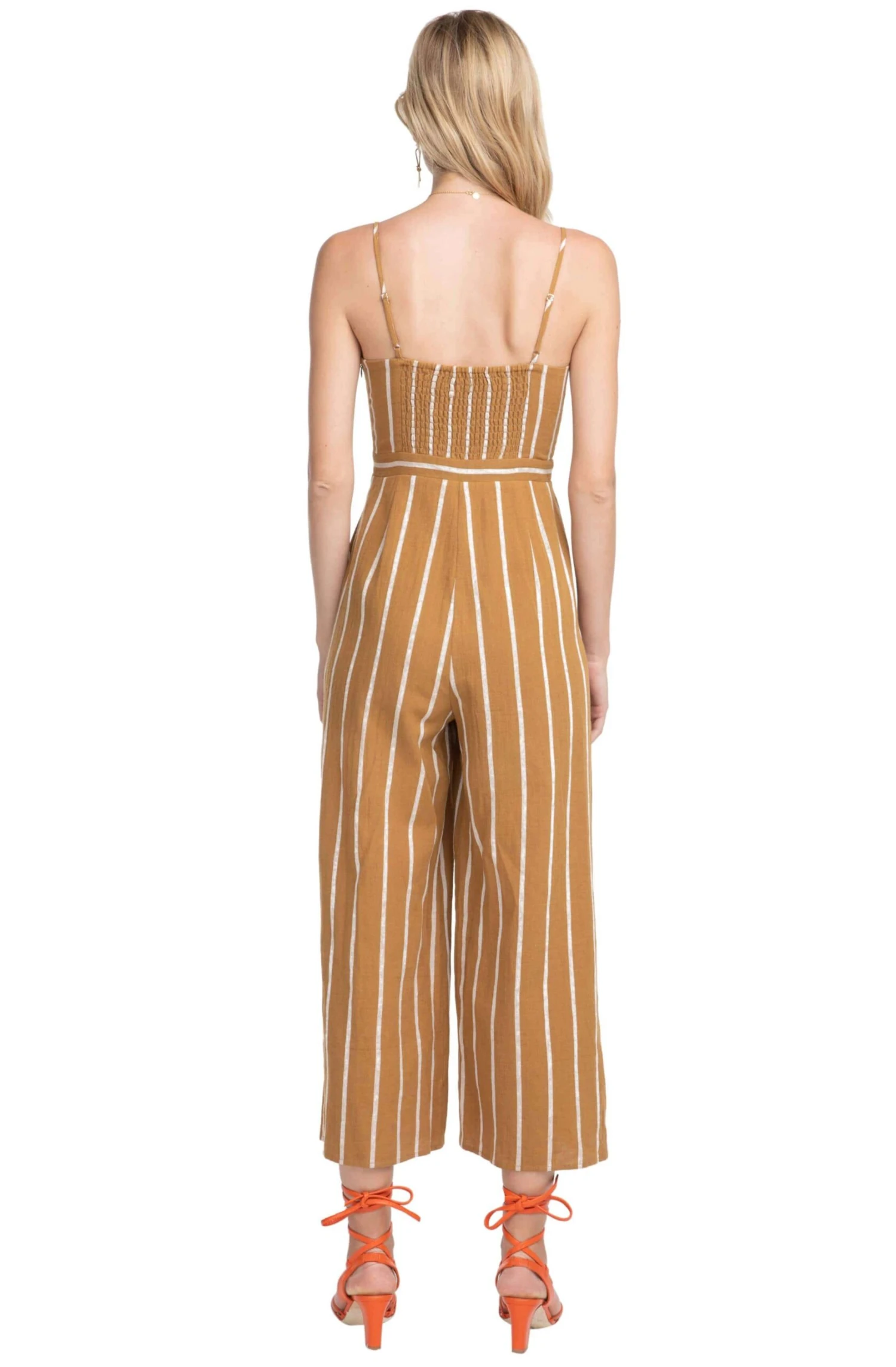 You’ve got an instant outfit! A classic striped pattern frames this playful jumpsuit with a seamed triangle bodice. Cutout front and buttoned tie front accent lead to a wide leg pant with functional slanted hip pockets. Smocked back and adjustable skinny straps. Concealed side zip closure.