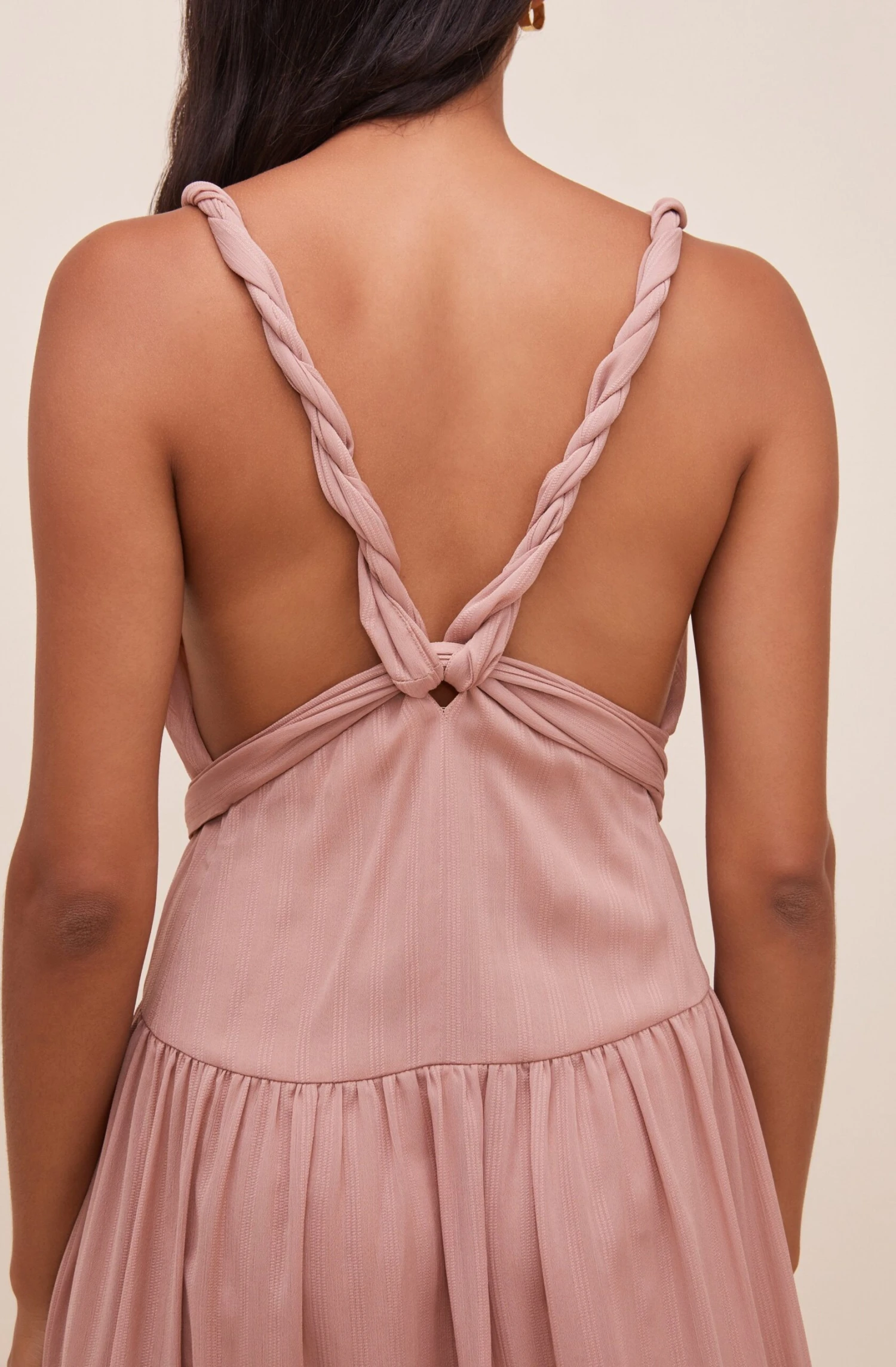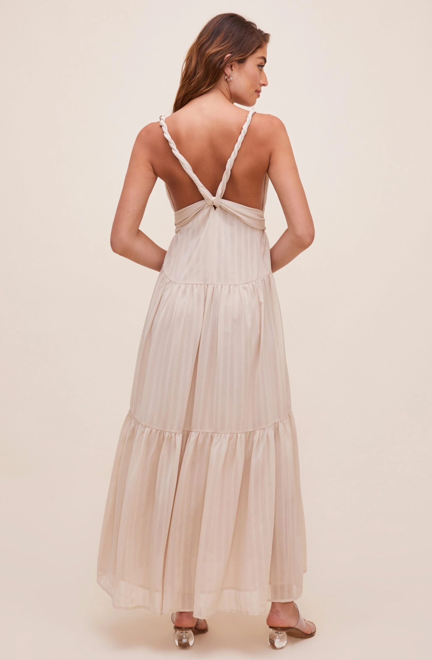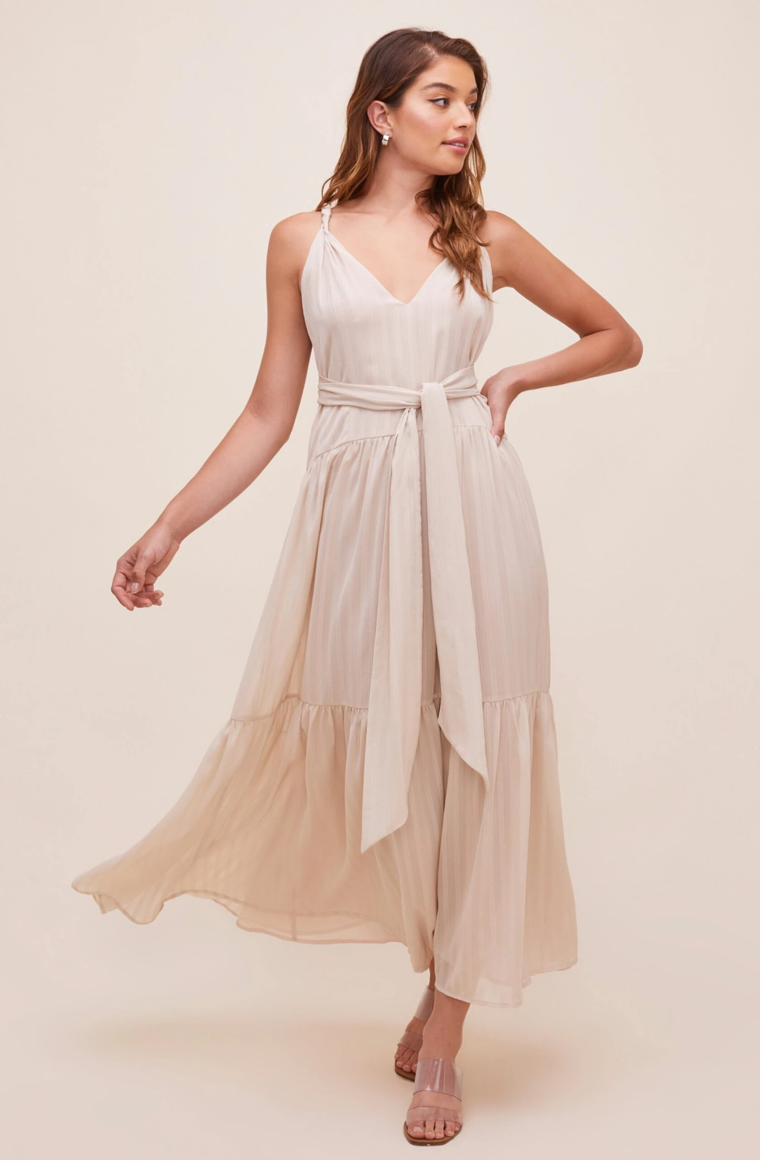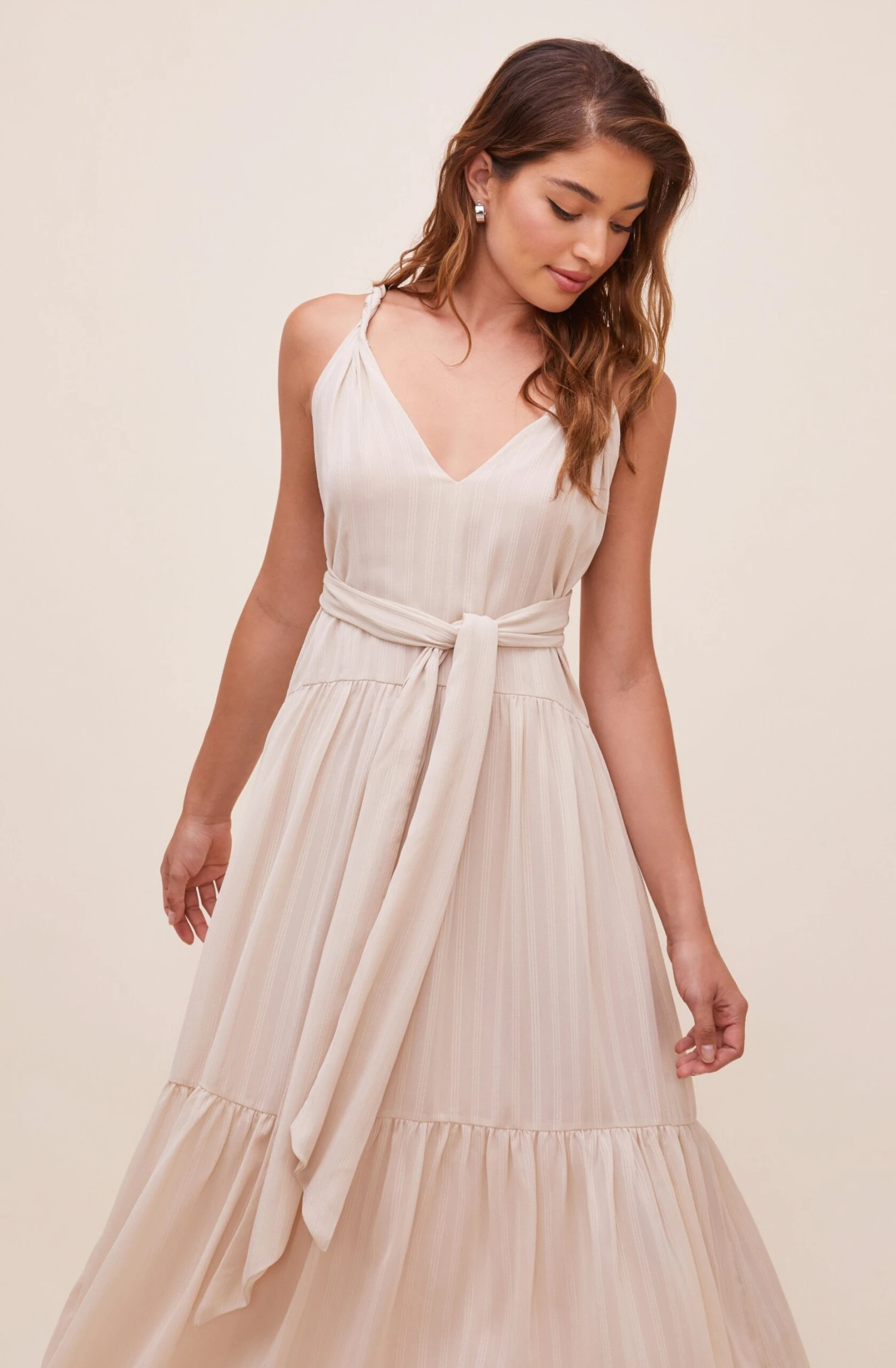 This flowy maxi dress features a plunge neckline that is supported by twisted straps. Tie waist accent leads to a tiered maxi skirt. Sleeveless. Strappy back.