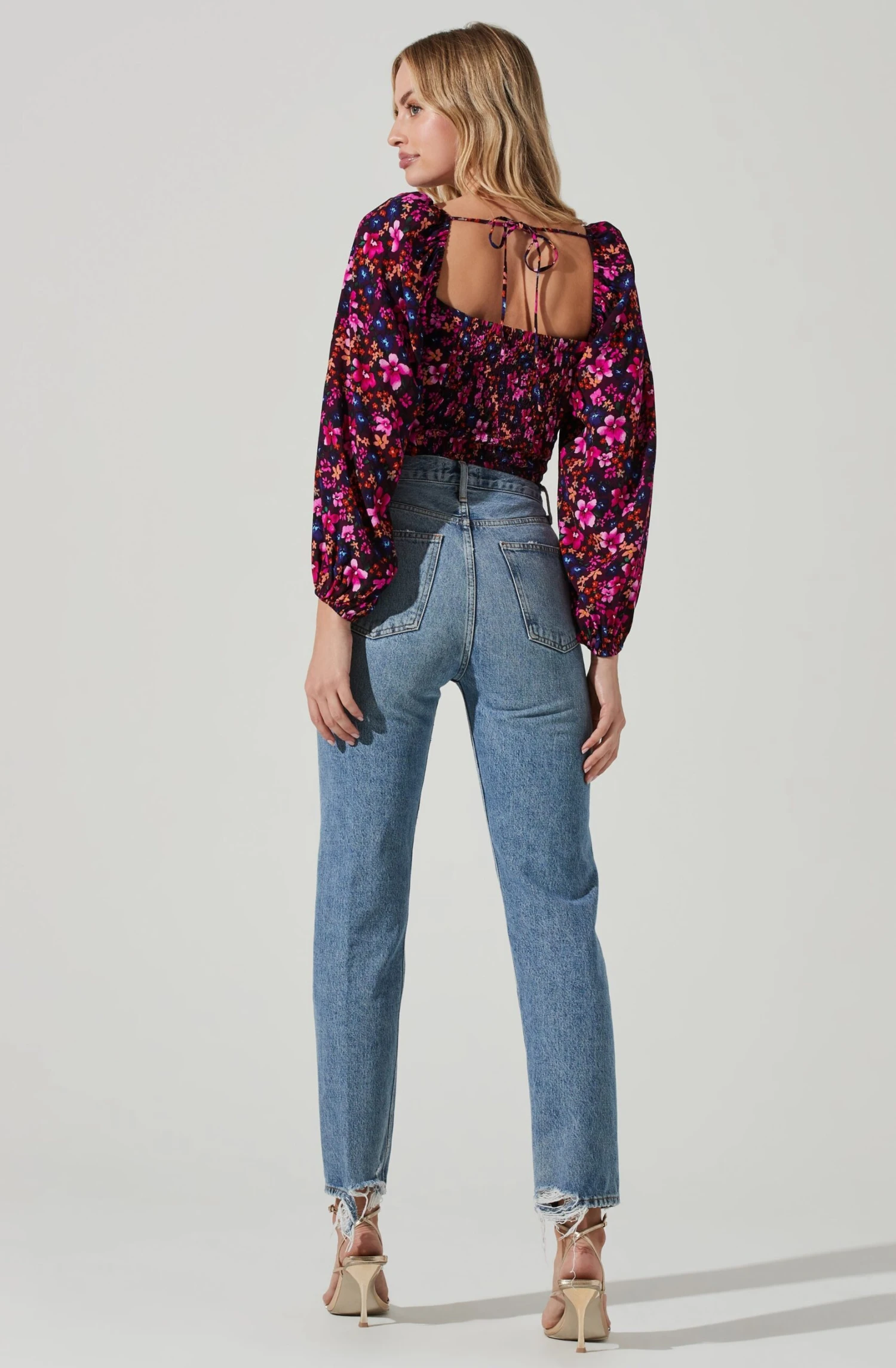 The Edwina Top features a floral print throughout. Sweetheart neckline leads to a hook-and-eye corset bodice. Long sleeves. Strappy accents at the back. Smocked back.