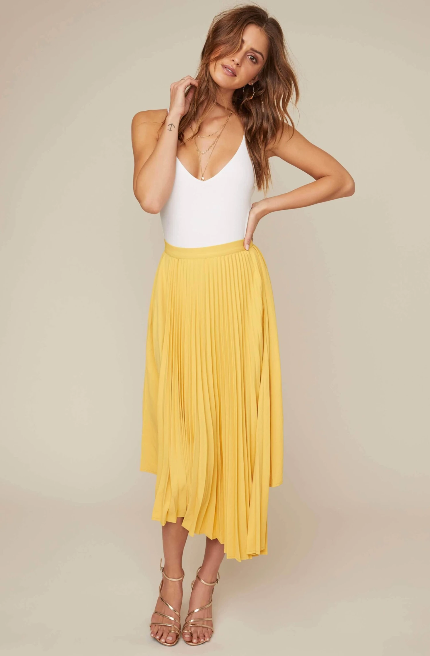 Sunny days are ahead in a bright midi skirt! It features a high waist, pleated construction and asymmetrical hemline.