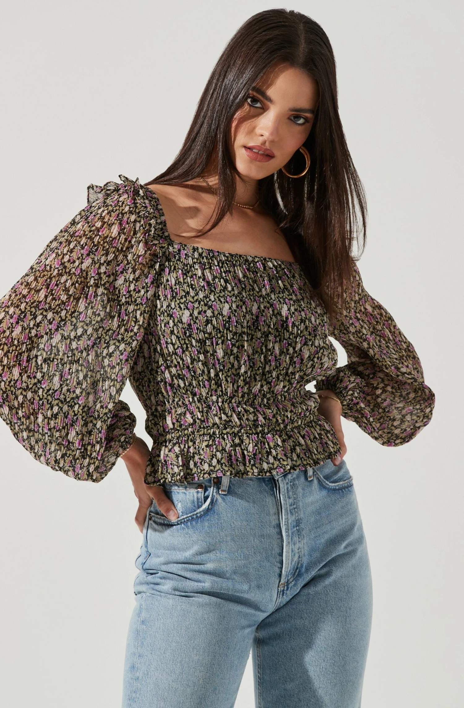 Spring florals make their way to the Elva top. It features a square neckline with ruffle trim detailing along the shoulders. Smocked waist features a peplum hem. Long, semi-sheer puff sleeves. Square cut back.