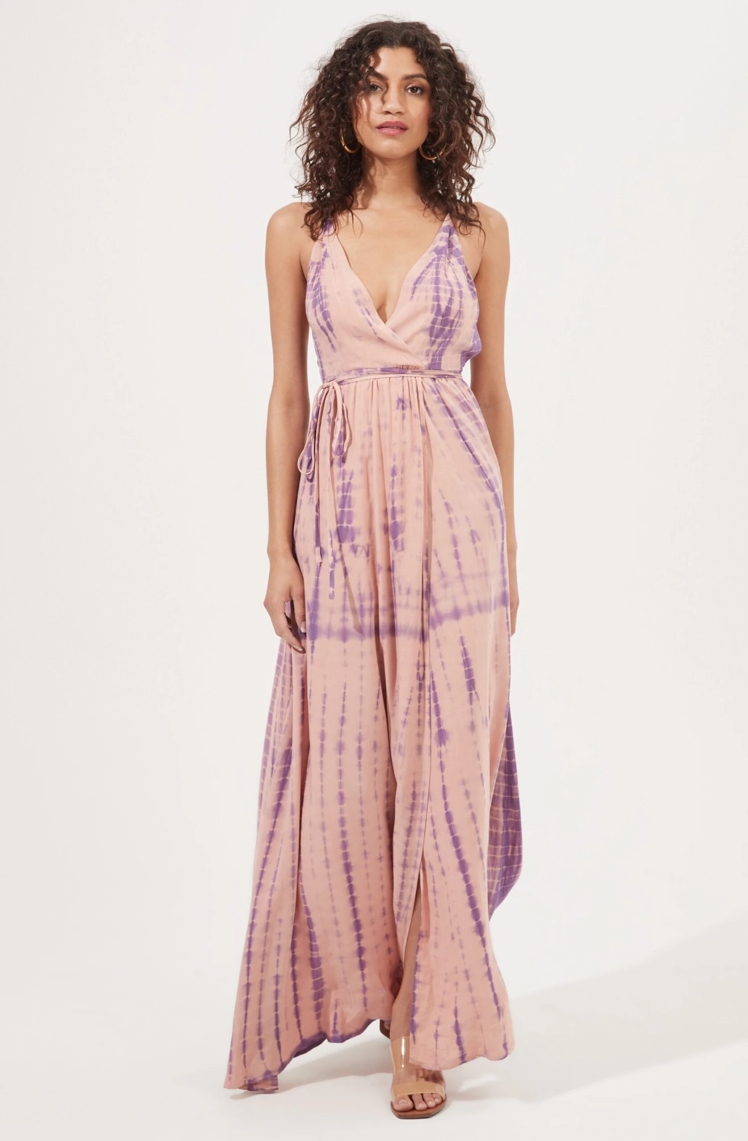 Look on the tie dye side with the Emmaline Dress. This maxi style features a plunge neckline that leads to an overlapping bodice and cinched waist with tying straps. Flowy skirt features a wrapped design with a front slit accent. Cross back straps are adjustable. Low cut back.