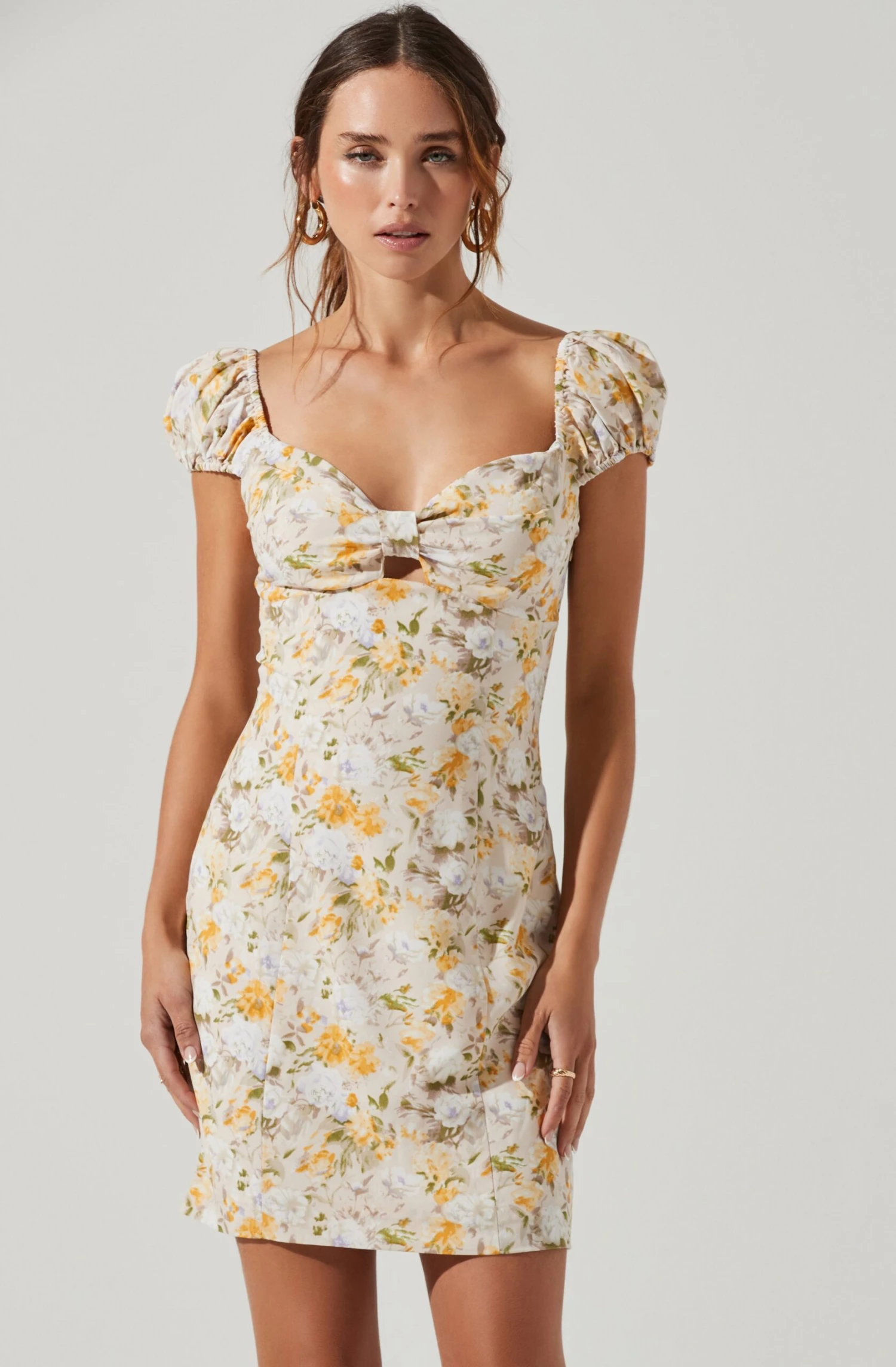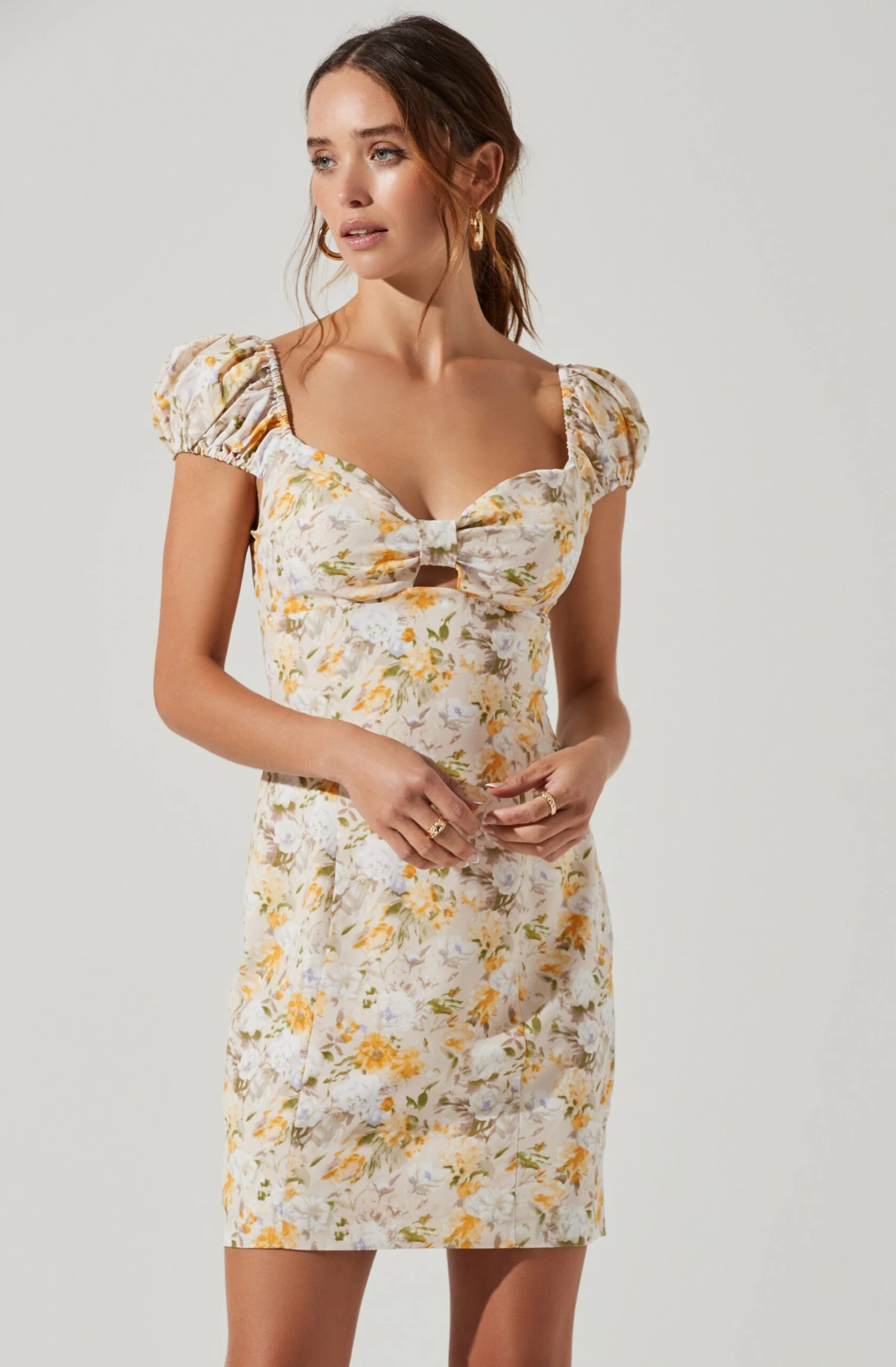 Make it a mini! This floral dress features short puff sleeves, cutout bust and darted bodice. Abbreviated hem. Smocked back.
