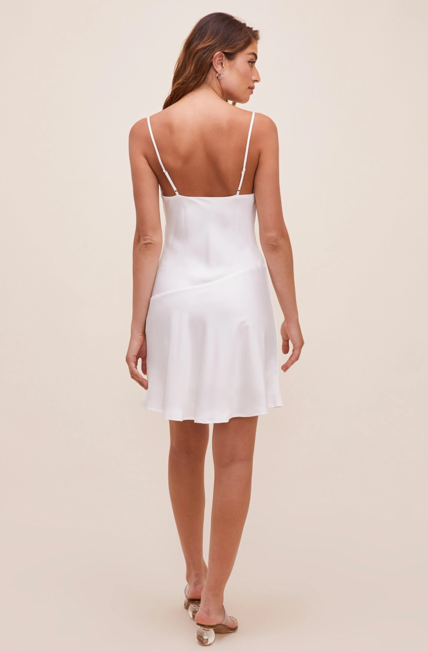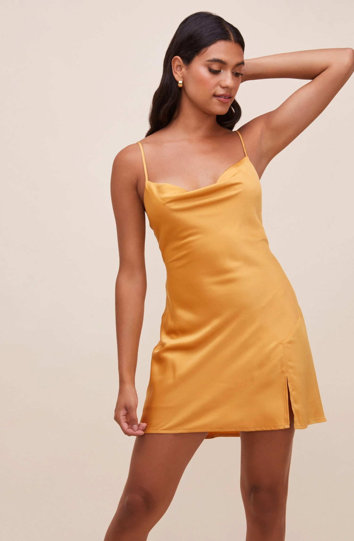 Satin moments call for the Filomena. It features a flattering cowl neck that is supported by adjustable spaghetti straps. Fitted waist leads to a flowy mini skirt.