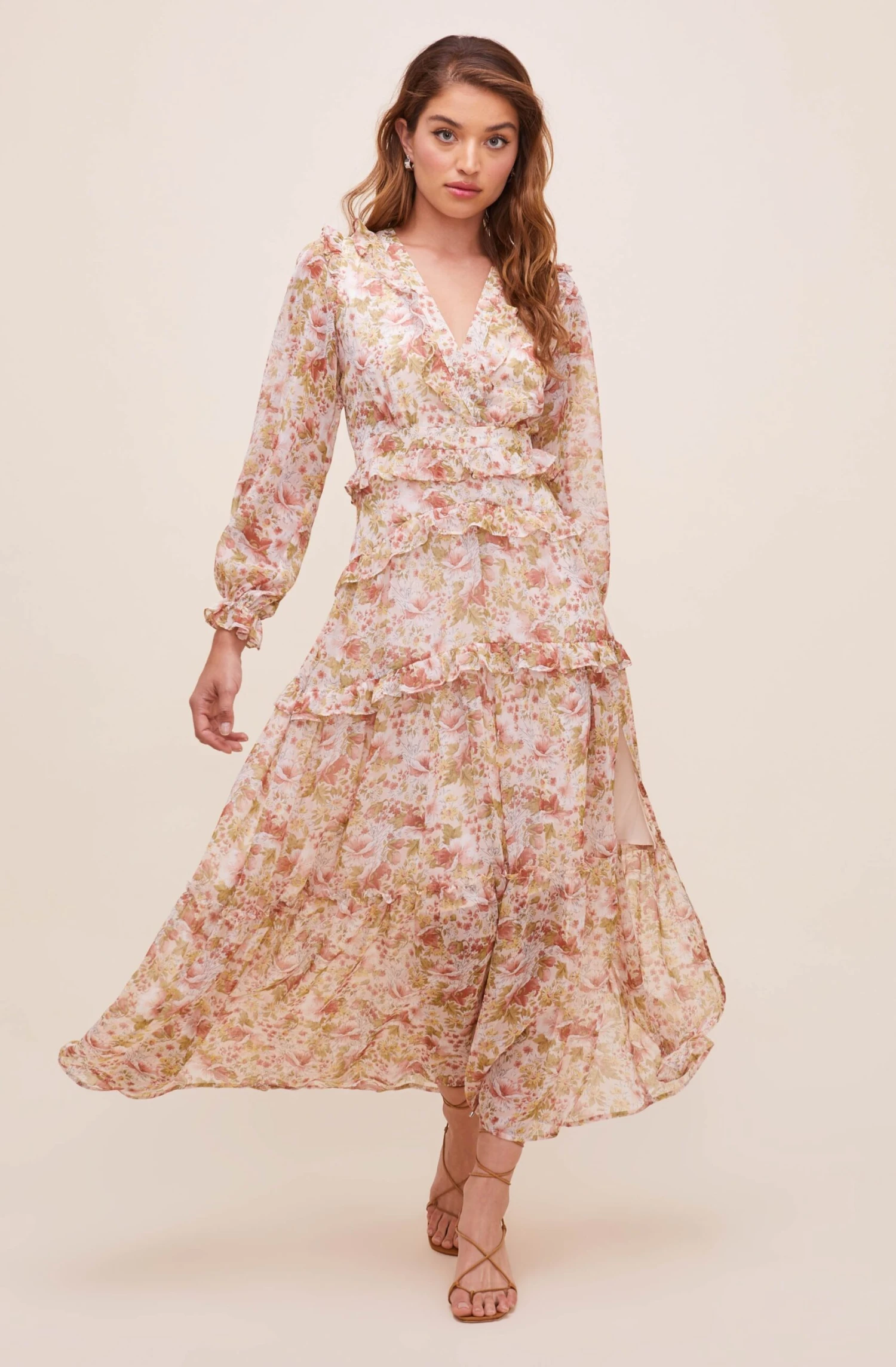 Heads turn for the Fleur Maxi Dress. This romantic silhouette features a V neckline that leads to a fitted waist and tiered ruffle maxi skirt. Front slit accent. Long sleeves. Corset-style back.