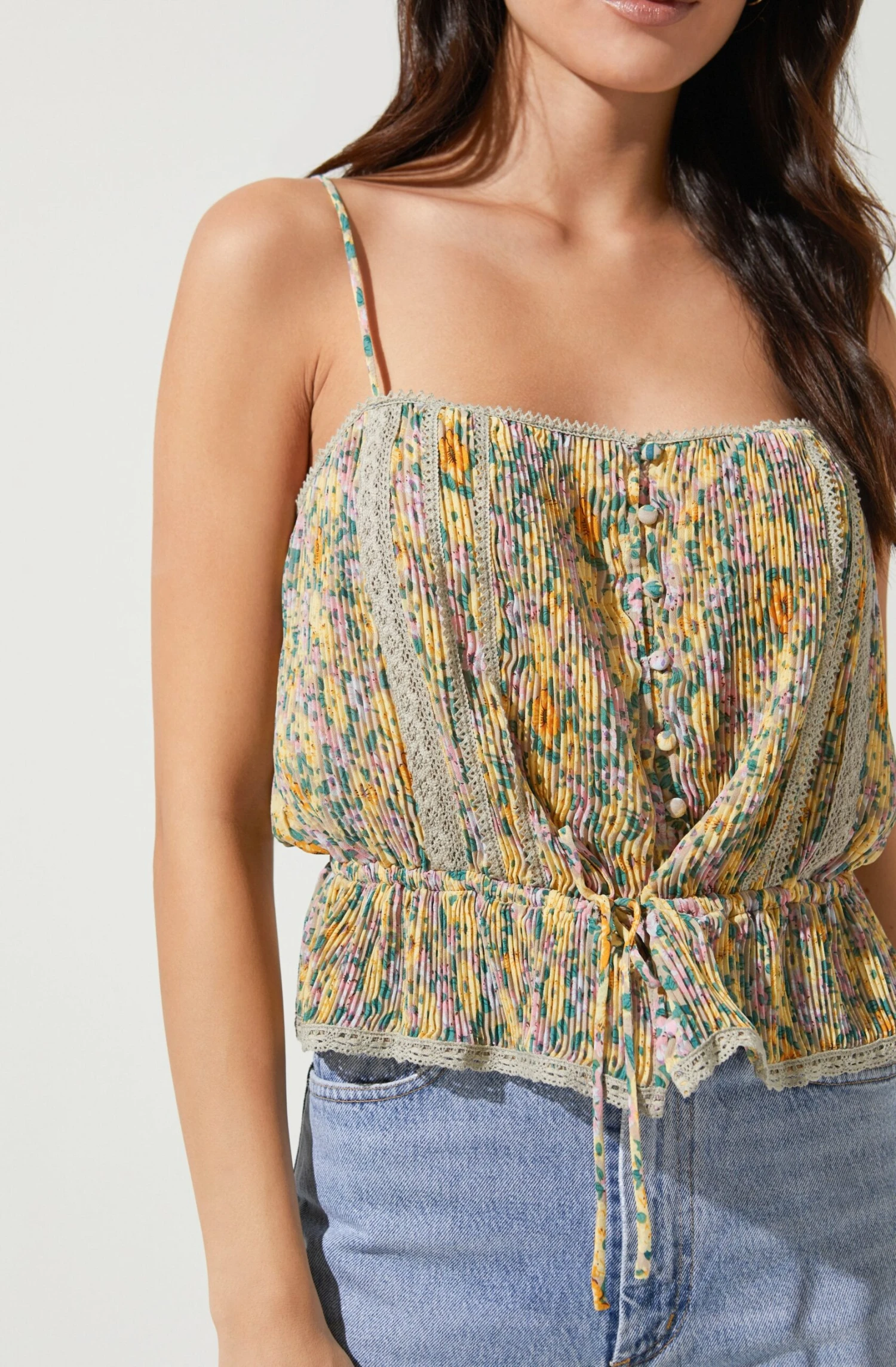 The Floral Top features a square neckline supported by spaghetti straps. Front button placket leads to a cinched waist with a ruffle hemline. Pleated fabrication in a floral print.