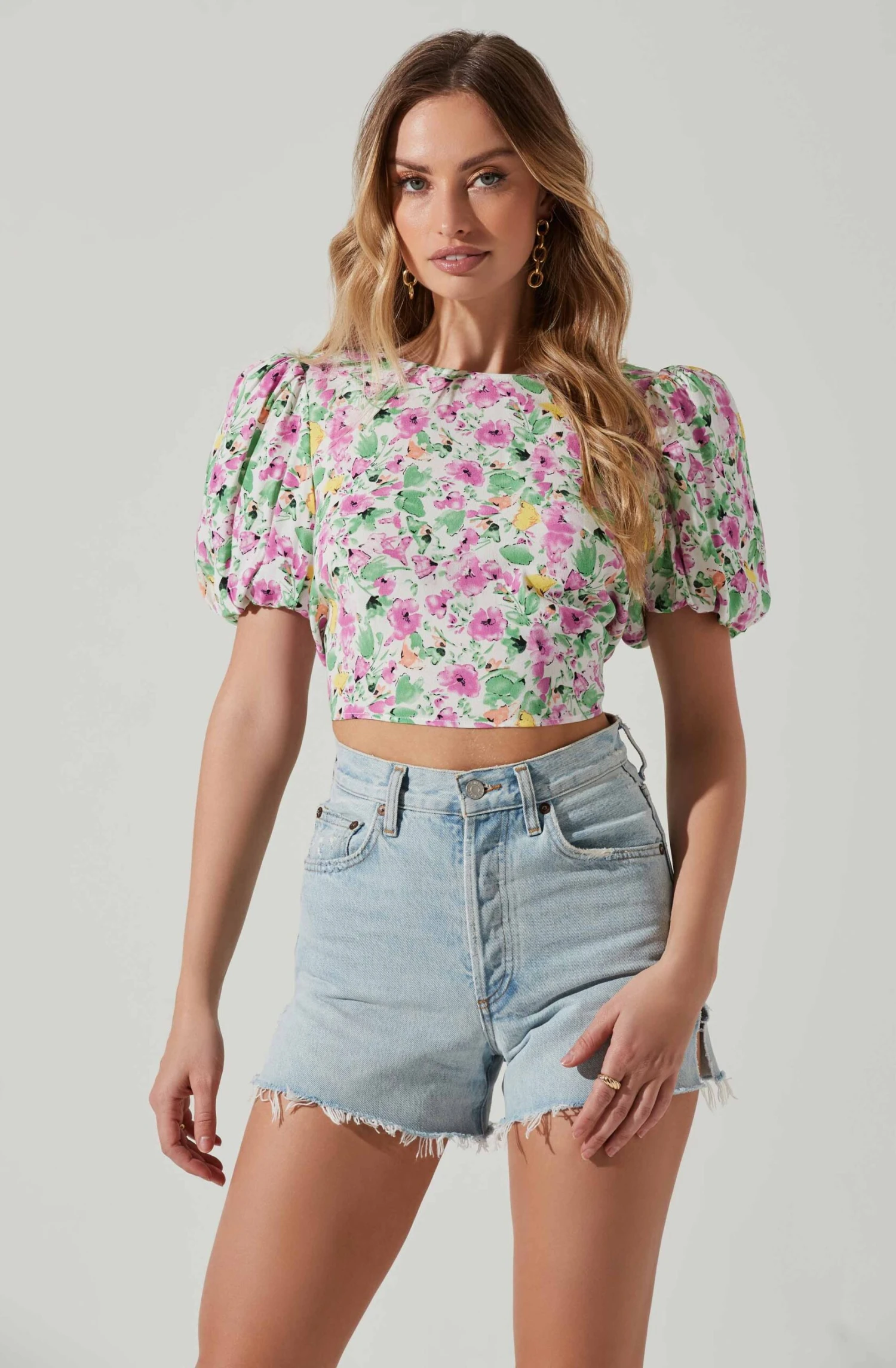This floral top features a high neckline that leads to a fitted silhouette. Low cut back features tie straps at the hem. Short bubble sleeves.