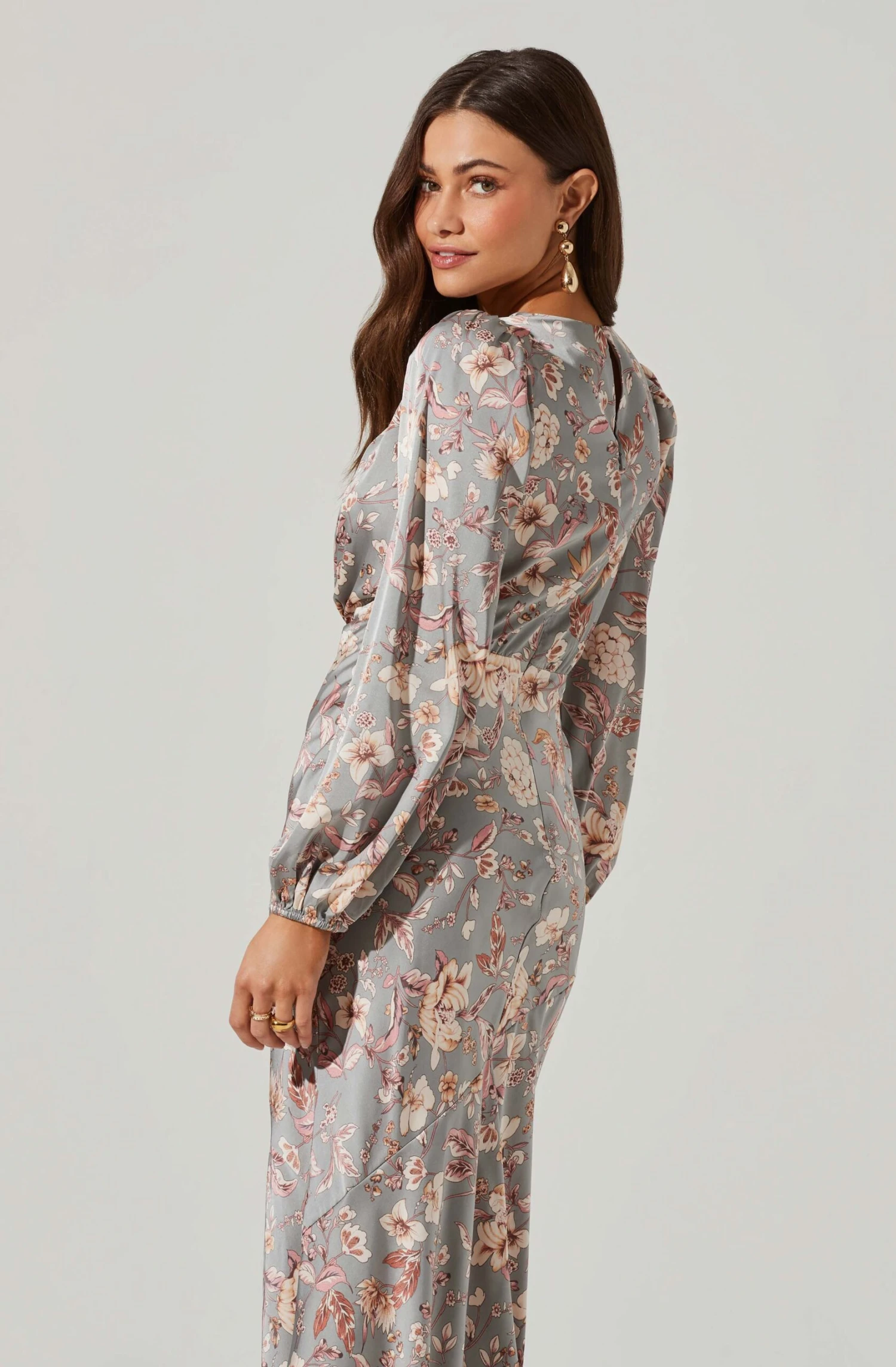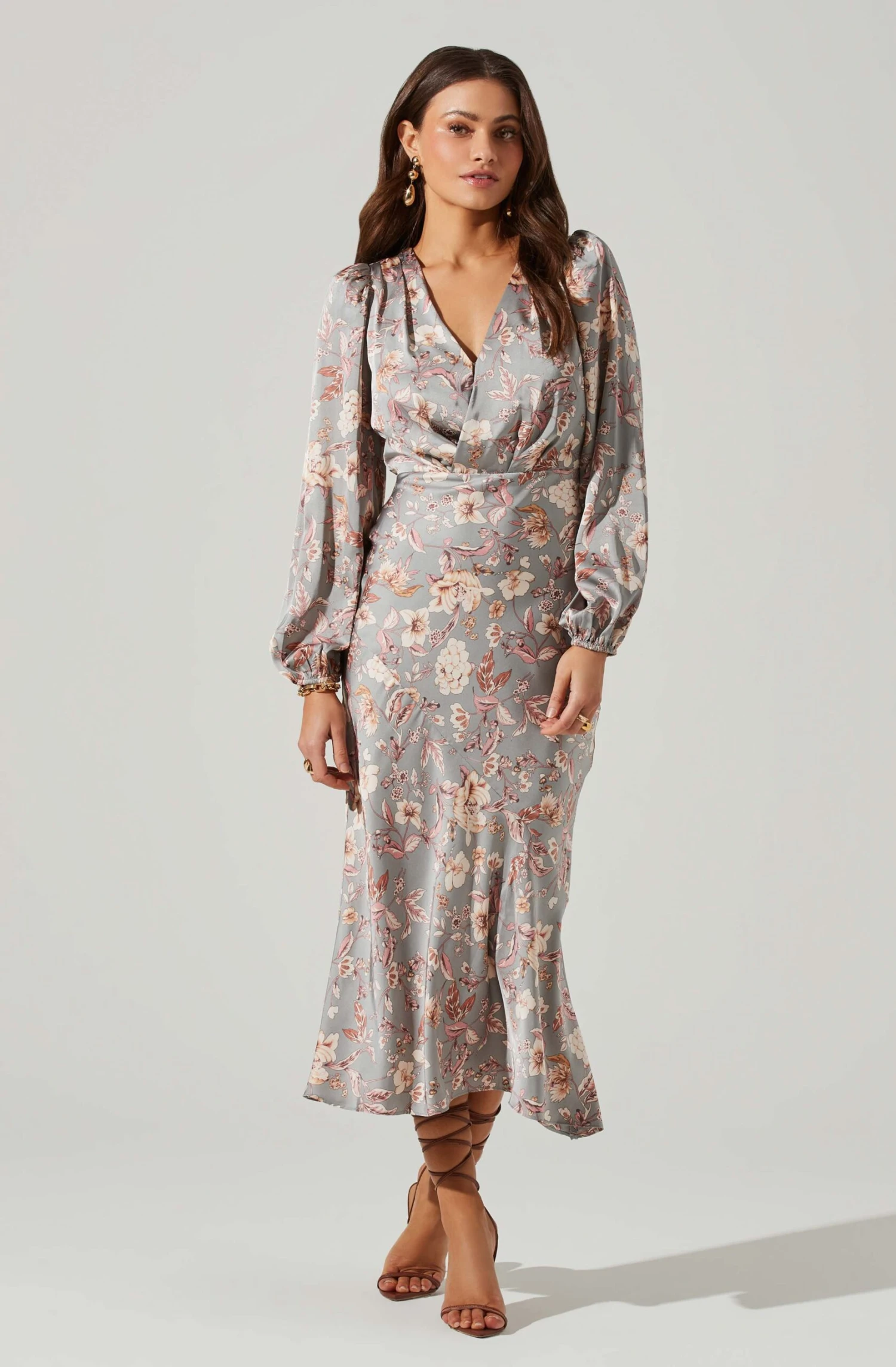 This maxi dress features an elegant floral print throughout. Draped, deep v-neckline leads to a wrapped front. Midi-length skirt. Long sleeves with statement shoulders. Concealed back zip closure.