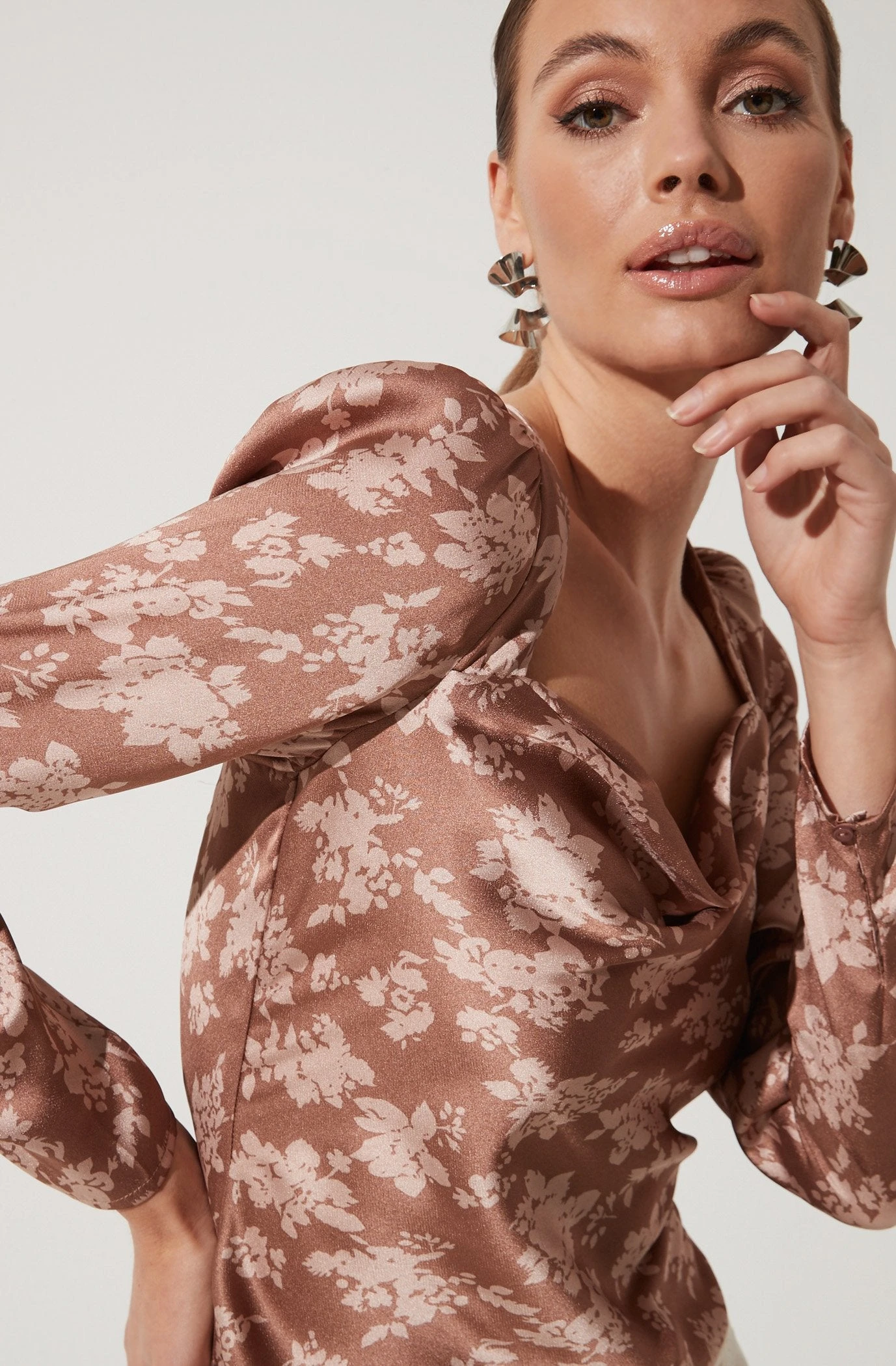 Stylish days ahead. This floral satin top features a cowl neckline that leads to a fitted bodice and is punctuated with a cutout back. Long sleeves.