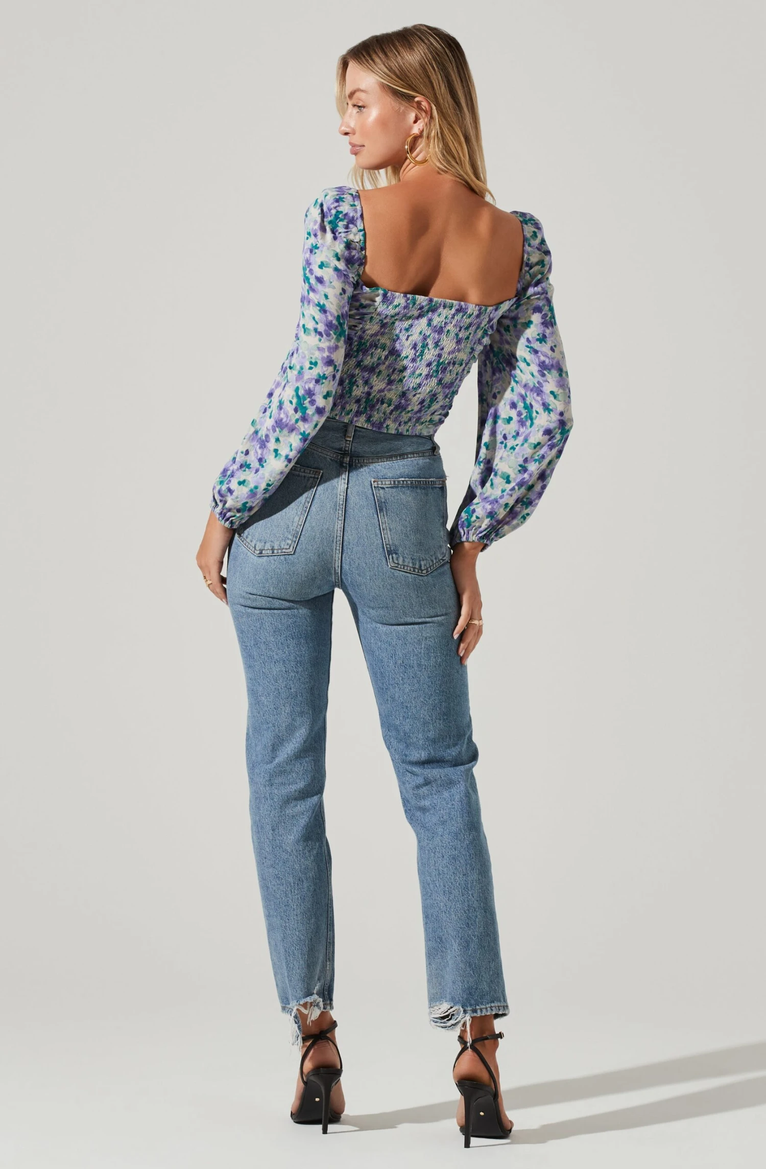 This floral top features a sweetheart neckline with an underwire detail at the bust. Ruched sides. Long sleeves. Smocked back.
