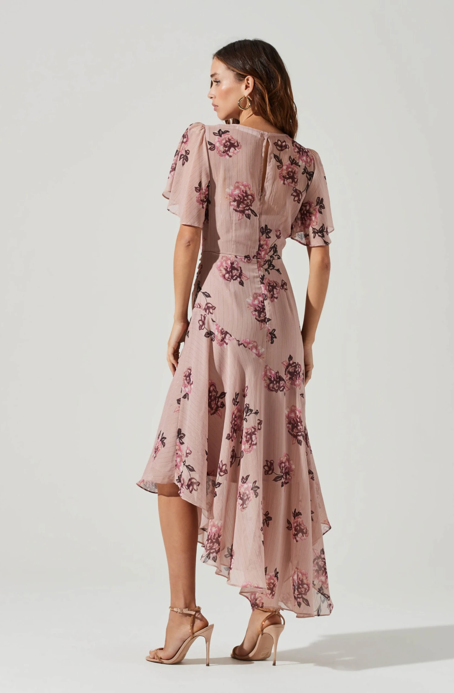 This midi dress features a vintage-inspired floral print. Round neckline leads to pleat details. Defined waist leads to an asymmetrical handkerchief hem. Short flutter sleeves. Keyhole back.