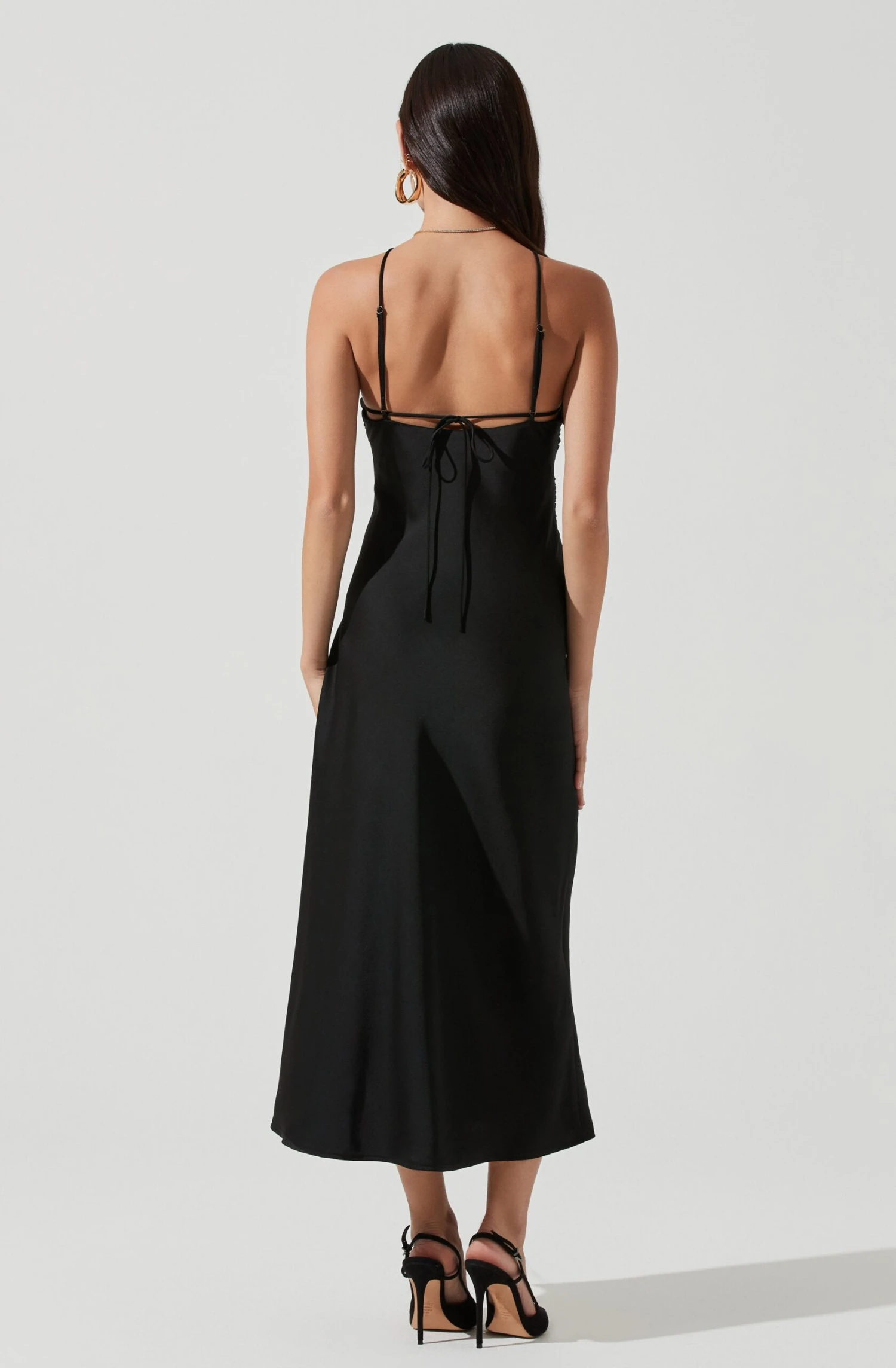 This sleek satin dress features a halter neckline that leads to a ruched bodice and midi-length skirt. High front slit accent. Adjustable straps.