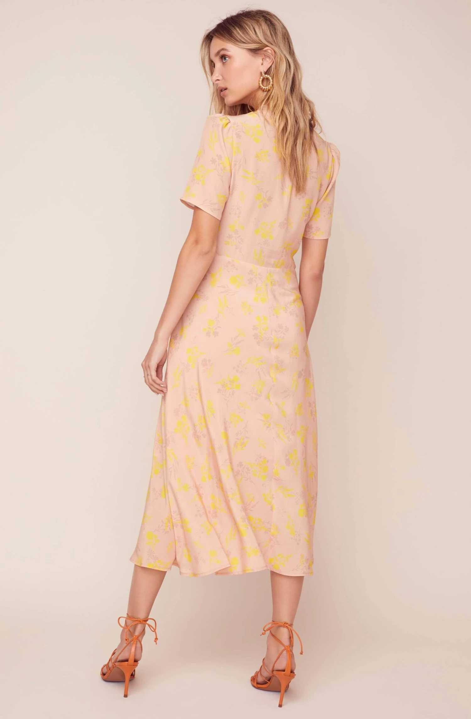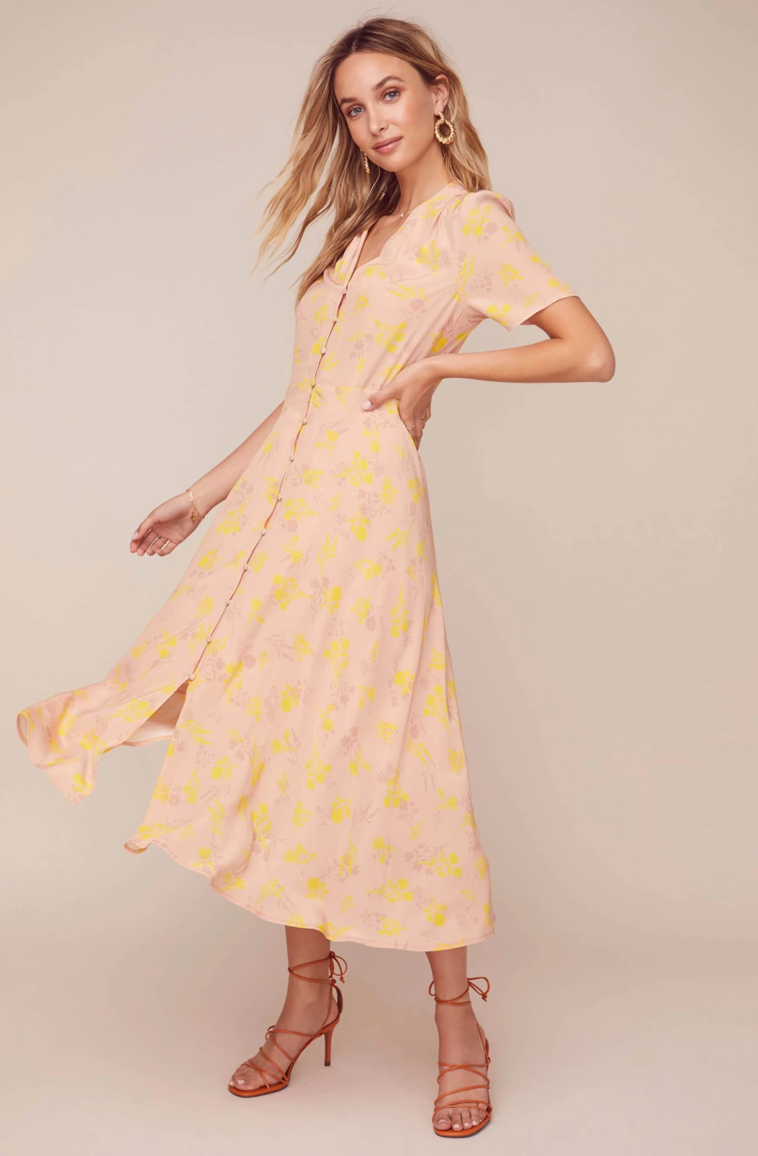 Get in tune with the Harmony Dress! This floral printed look features a V-neckline that leads to a fitted bodice and front button placket that reaches towards the hem. Midi-length skirt and short sleeves.