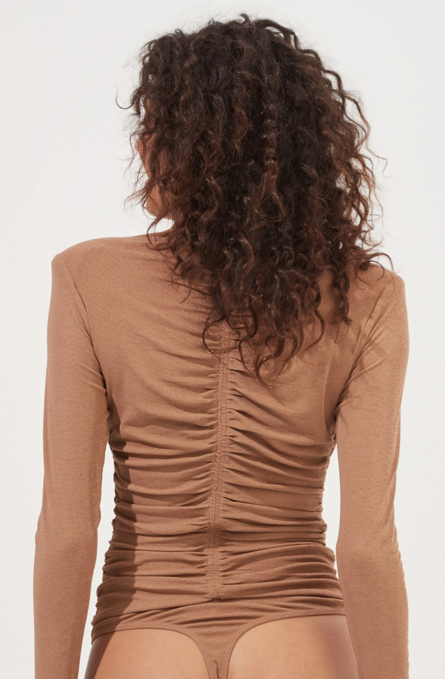 The Hollis Bodysuit features a round neckline that leads to a ruched front and attached thong bottoms with snap button closures. Long sleeves. Padded shoulders.