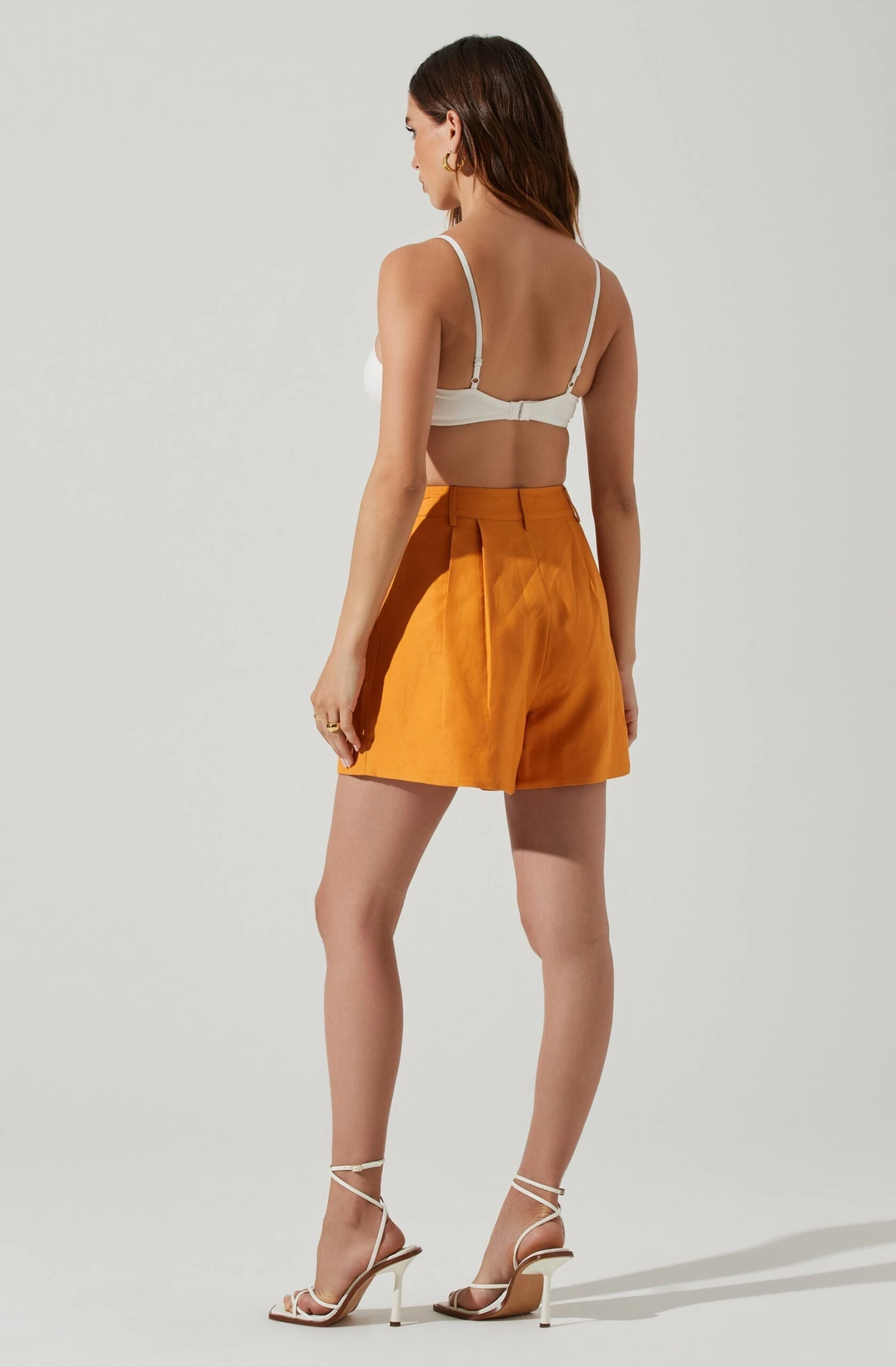 Jacinta High Waist Shorts feature a high waist fit that leads to a plated front. Front zip closure. Belt loops. Functional side pockets.