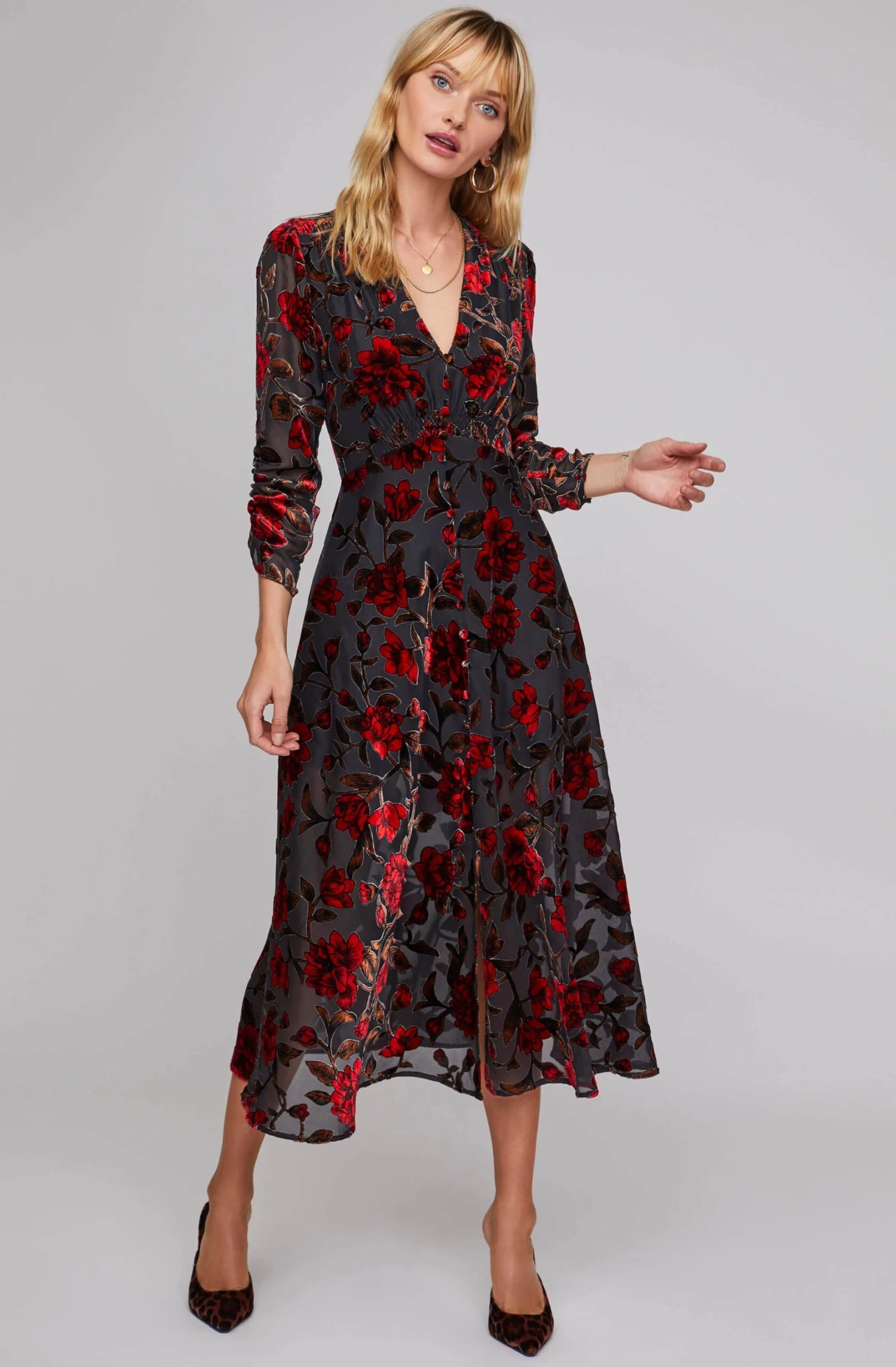 She’s all for breath-taking romance. The Jalisca Dress features a flattering V neckline that descends to a fitted bodice. Buttoned front leads to an A-line skirt with a beautiful burnout velvet, floral print throughout. Shirred, three-quarter sleeves.