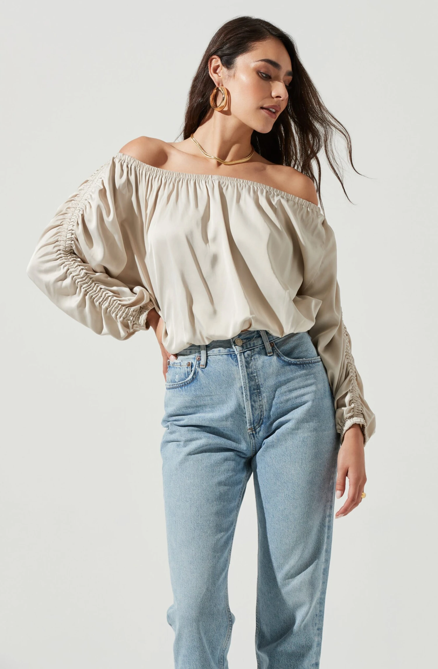 The Jessen Top features an elasticized off-shoulder neckline, long ruched sleeves and cropped hem. Relaxed fit.