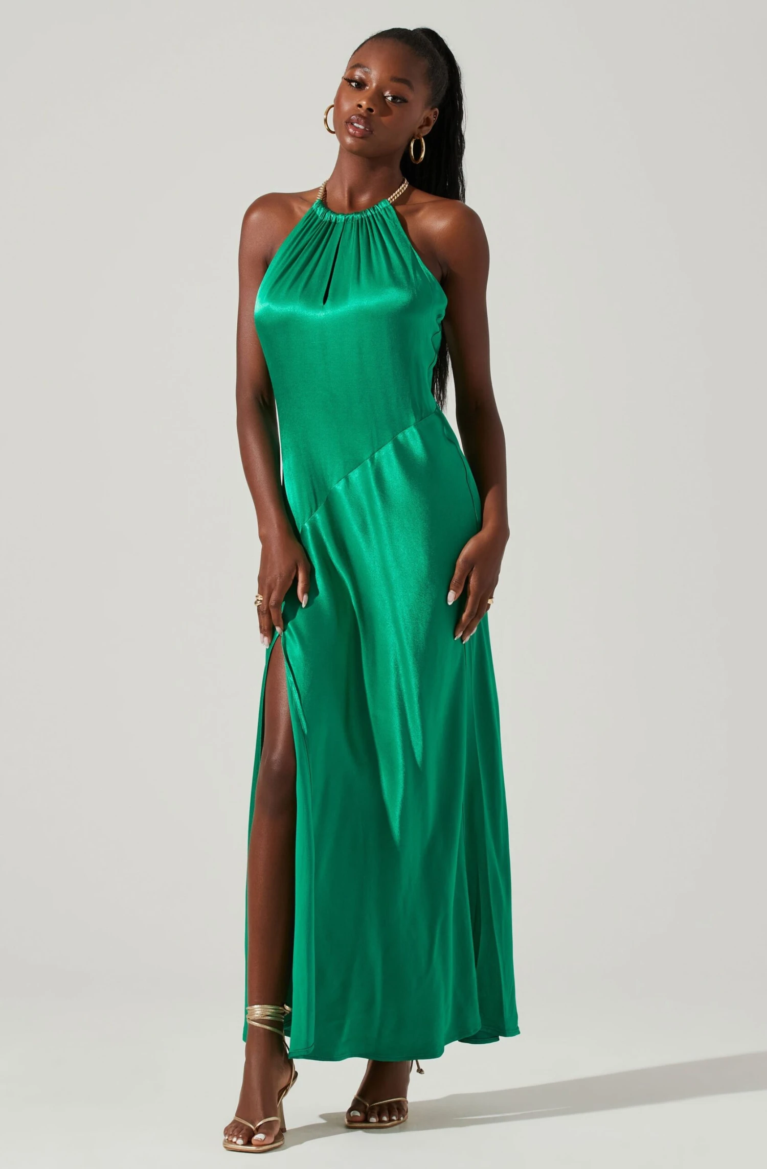 The Kazia Dress features a satin finish that instantly elevates. Halter neckline is supported by a statement chain strap. Keyhole accent at the bust. Side slit accent. Open back. Concealed back zip closure.