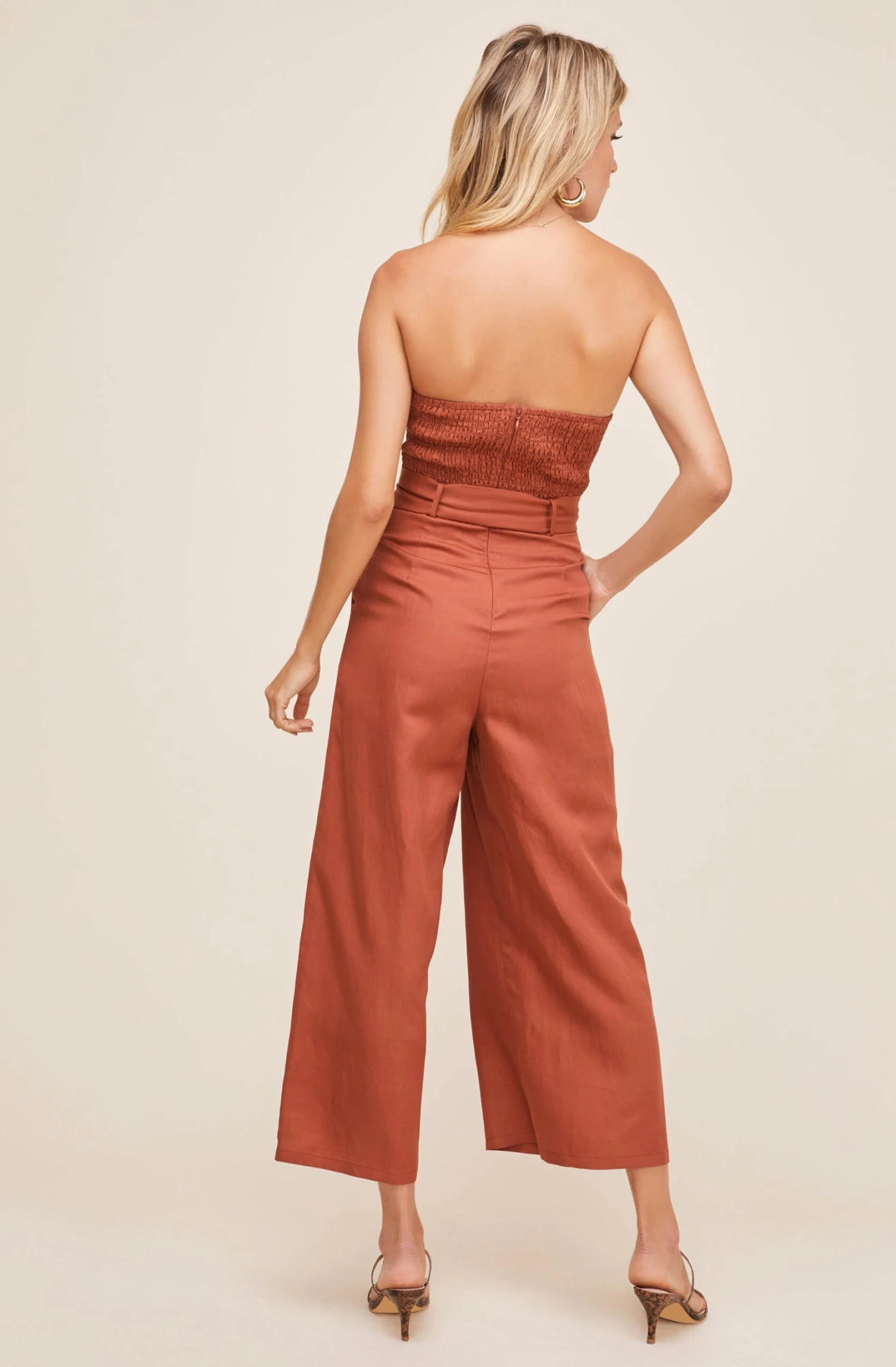 Good to go in one step. This stylish jumpsuit features a strapless neckline that descends to a fitted and darted bodice. Matching belt with circular belt buckle and wide leg bottoms. Smocked back.