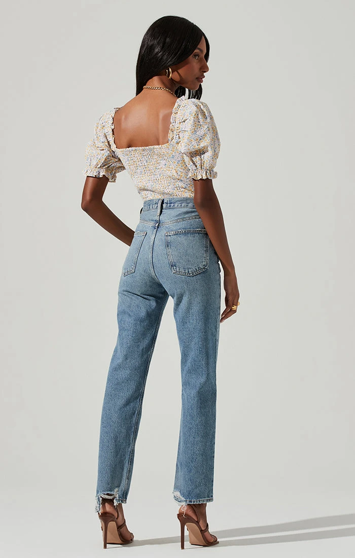 This delightfully chic top features a delicate floral print throughout. Sweetheart neckline leads to a lace up front with drawstring accents. Short puff sleeves with ruffled trim. Smocked back.