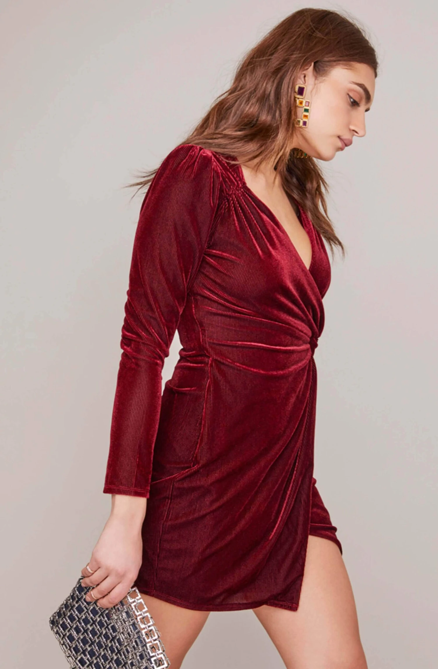 The spotlight is on you this party season! Make heads turn in a fab velvet mini dress. It features a plunging neckline, gathered bodice and a tie waist accent. Wrap silhouette hugs your figure in the most flattering way. Padded shoulders and long sleeves.