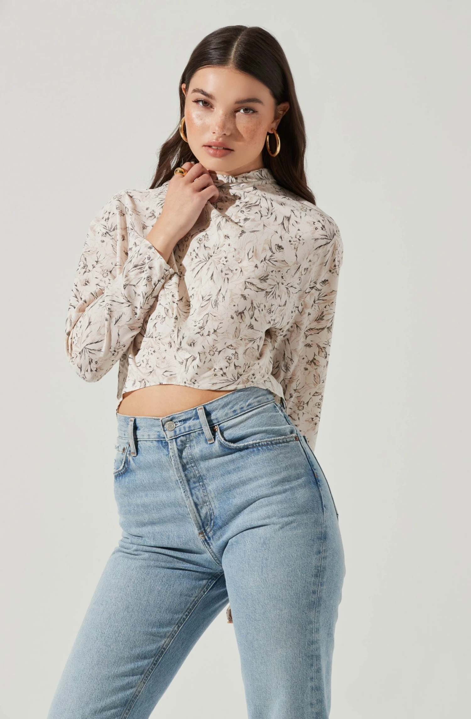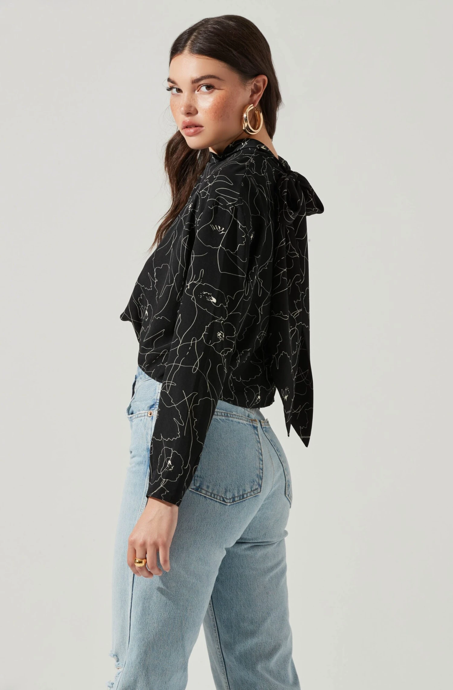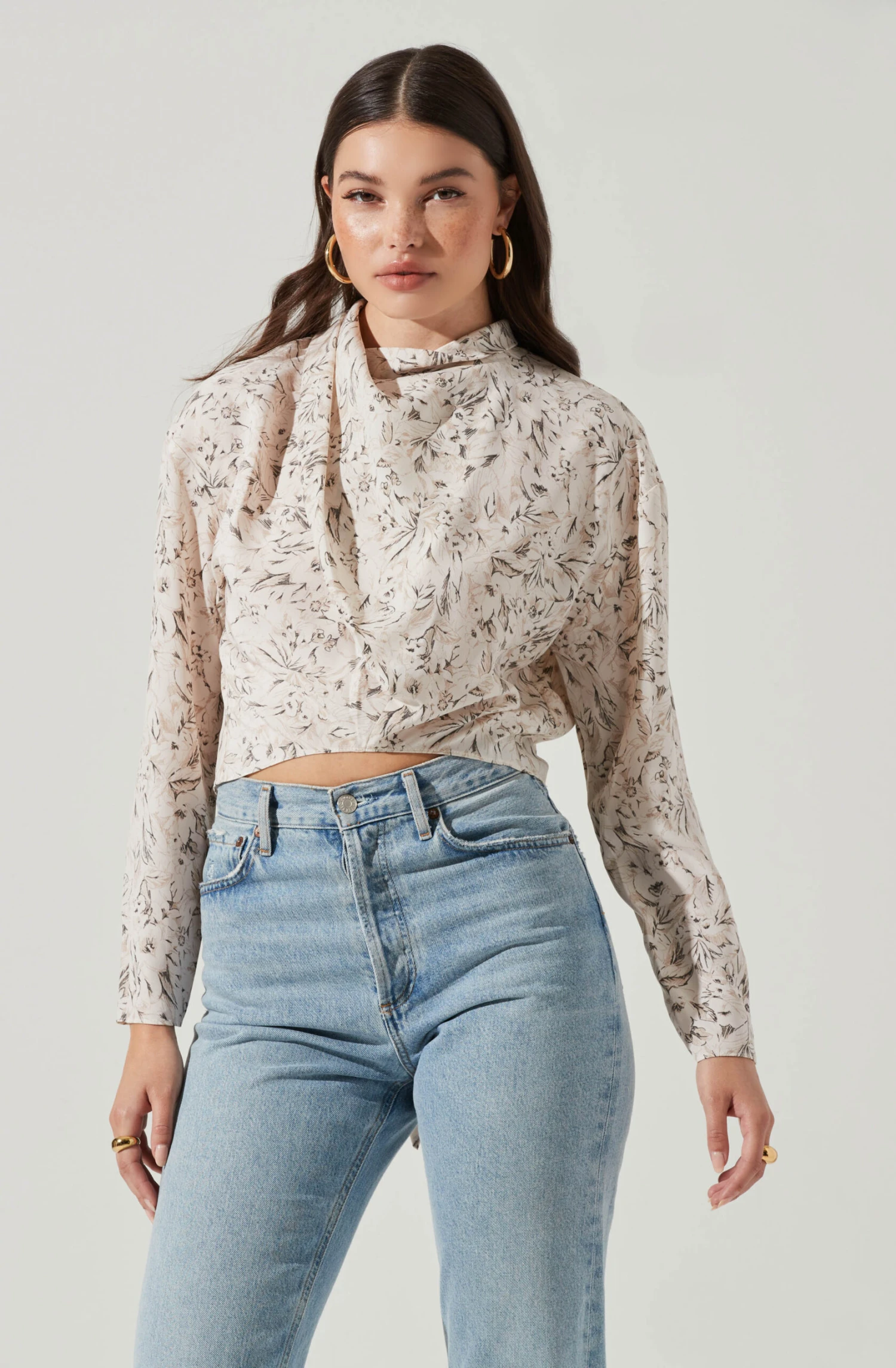 This abstract print top features a draped front that leads to a tie back neckline. Long sleeves. Cropped.