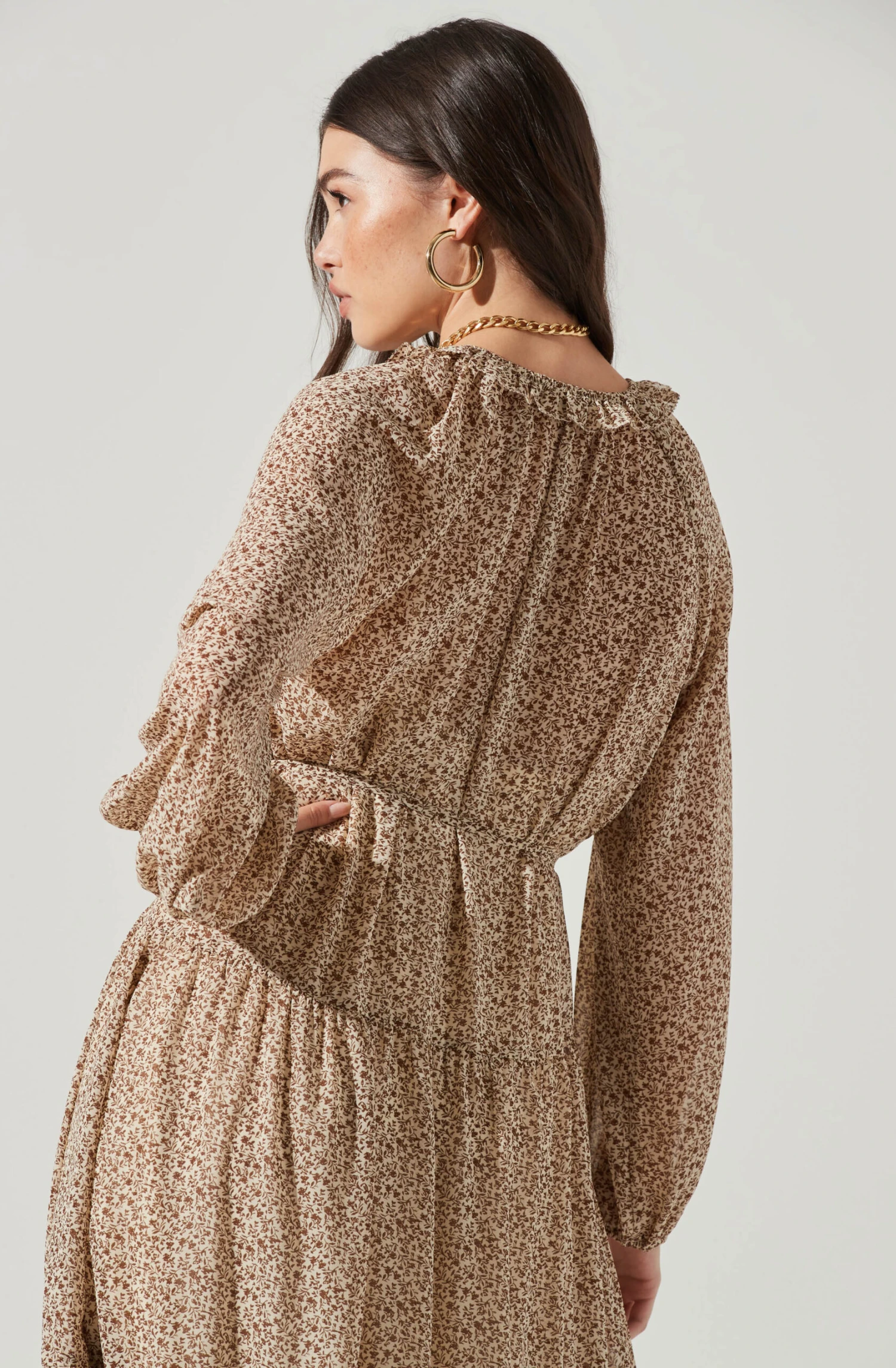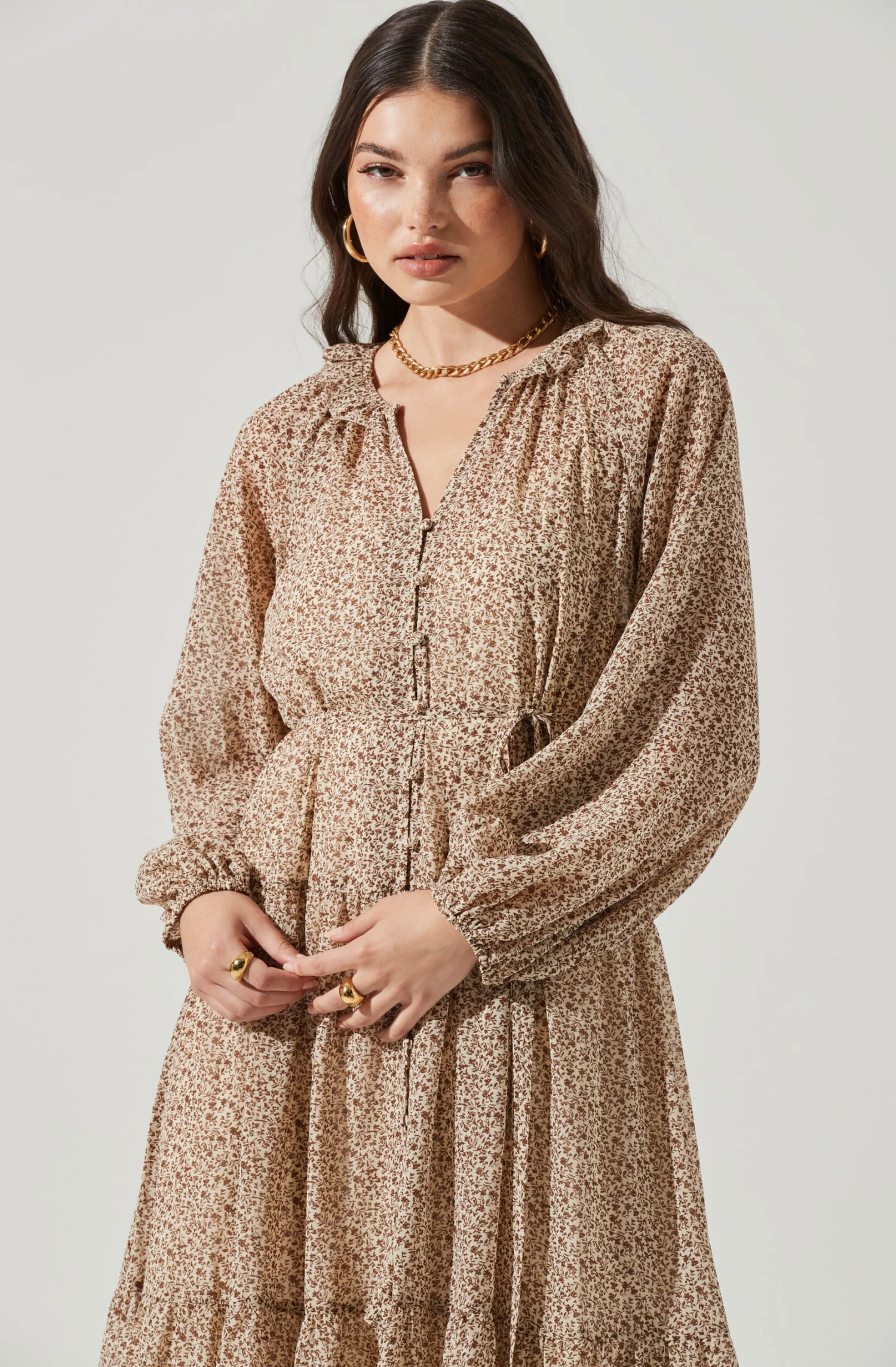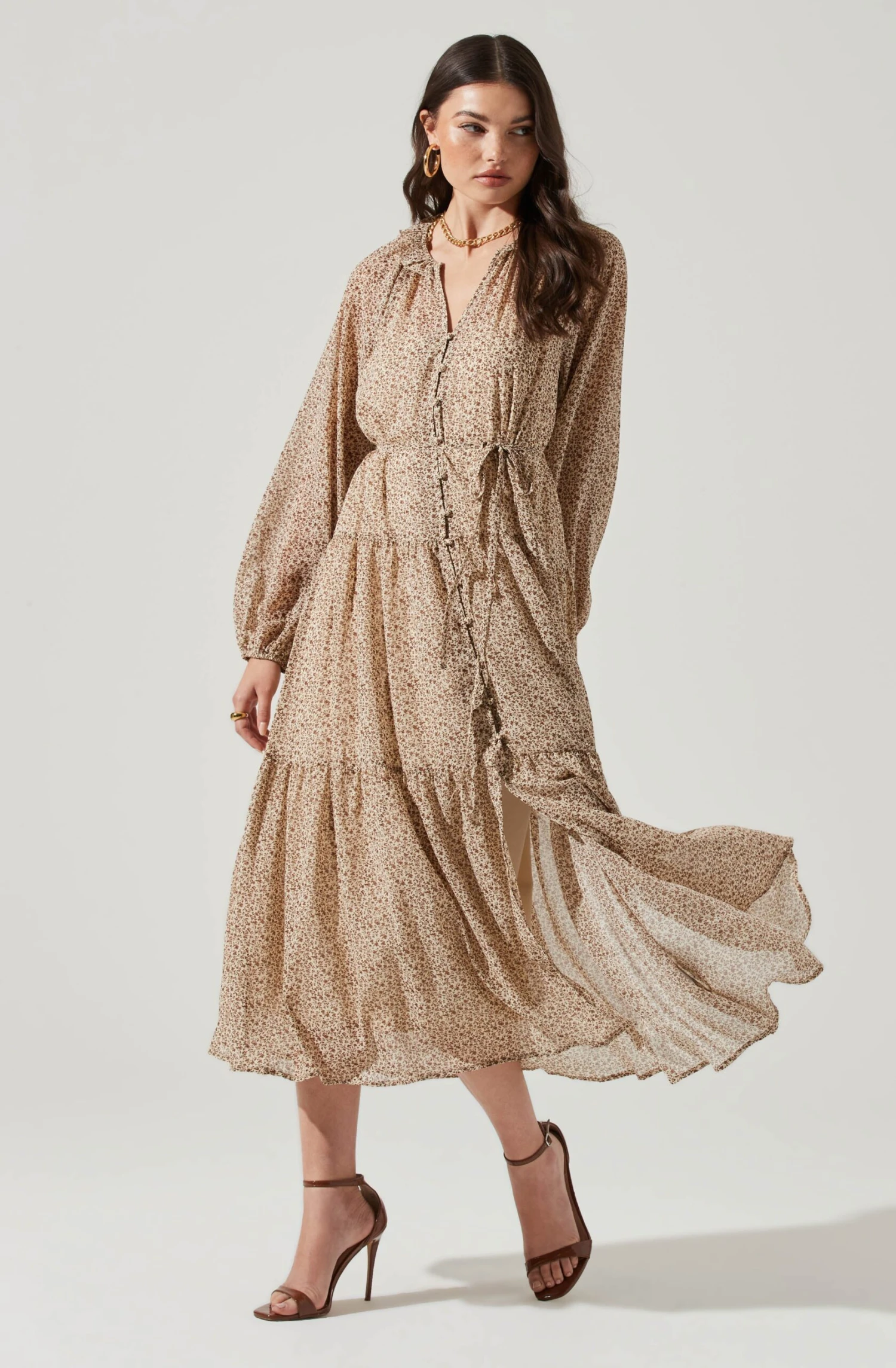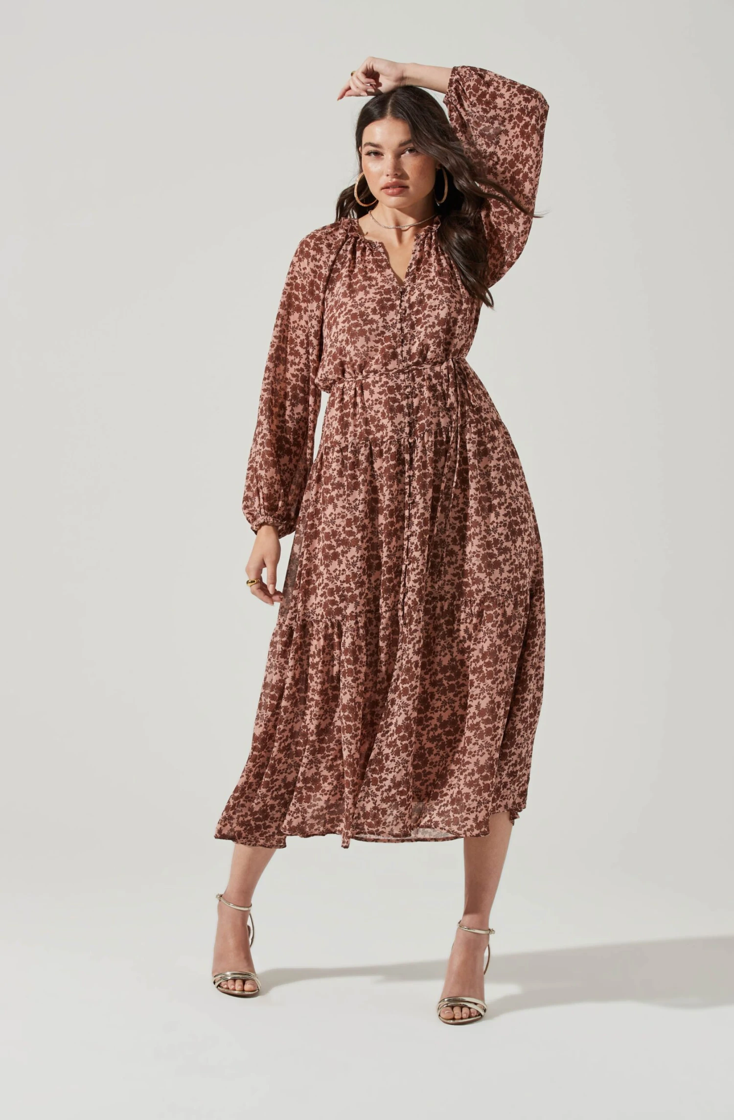 This chic dress features a vintage-inspired floral print throughout. V neckline leads to a front button placket. Tiered midi skirt. Long puff sleeves.
