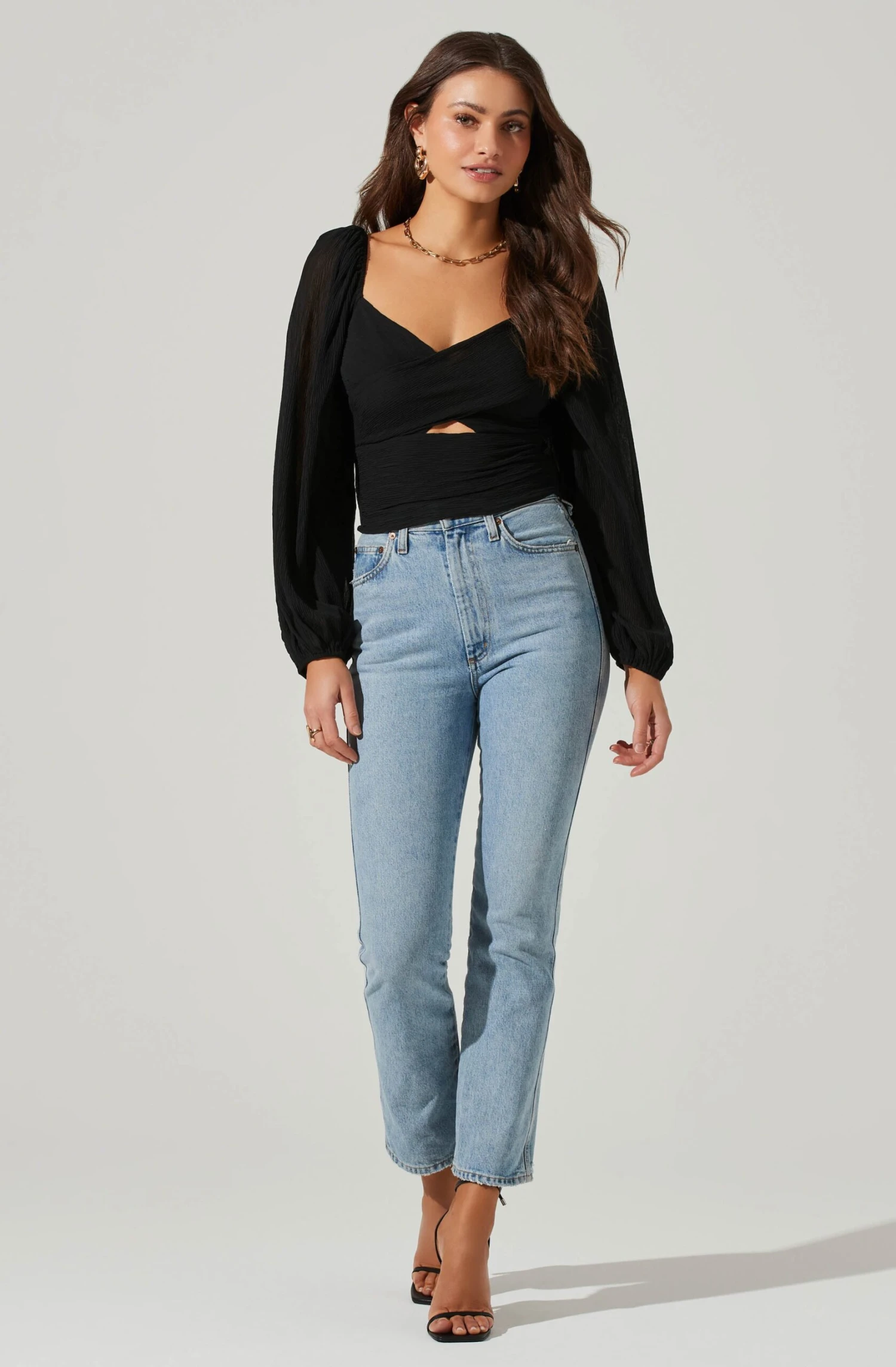 This statement top features a textured, plisse finish. Sweetheart neckline leads to a cross bust and subtle cutout detail at the front. Long sleeves. Smocked back.